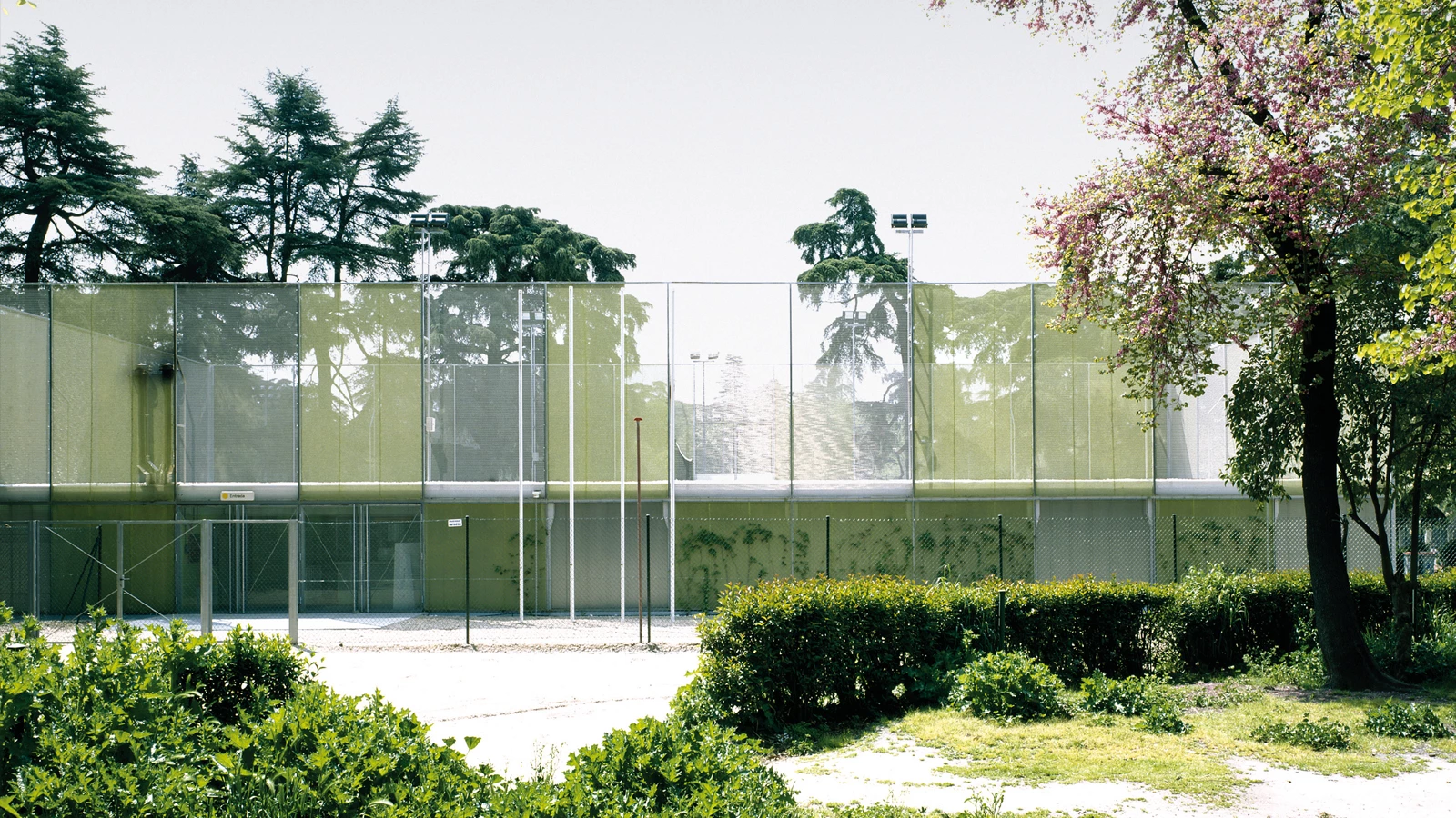 Como una reinterpretación de la tradición jardinera del entorno, de la que dan muestra piezas singulares construidas con setos y trillajes, un cerramiento a base de mallas metálicas garantiza la protección de las instalaciones. Transformados en muros vegetales ahora que las diversas especies plantadas ex profeso trepan por su superficie, dan lugar a una composición abstracta en la que los bastidores metálicos recortan en fragmentos ortogonales la materia orgánica. En la distancia se consigue un efecto de ‘teselización’ del paisaje, cuando las gamas de verdes y grises de los árboles y el cielo, diferentes según la luz a lo largo del día, se mezclan con los colores que tiñen el pabellón.