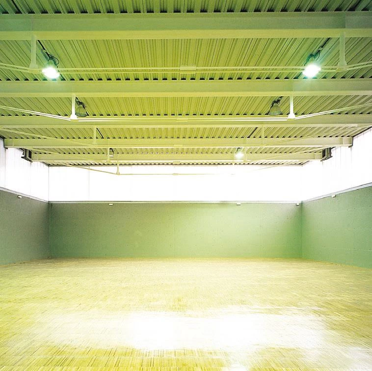 El volumen excavado aloja en dos plantas almacenes, vestuarios y oficinas, y a doble altura el gimnasio. Una banda de policarbonato ilumina cenitalmente la cancha interior, bañándola con una luz blanca perimetral.