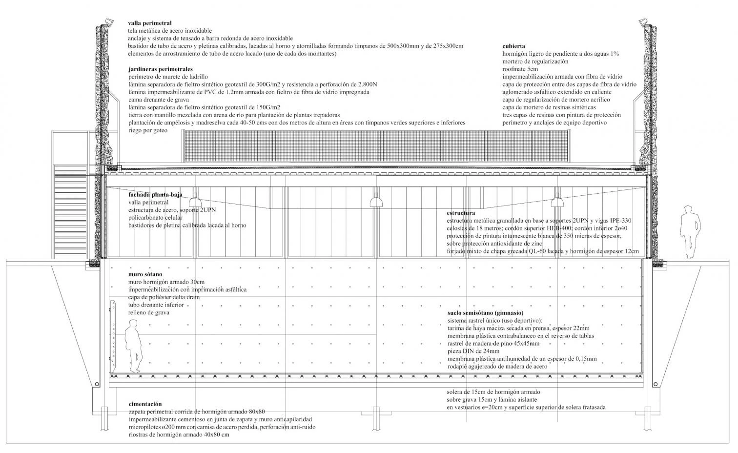 El edificio se genera a partir de una plataforma rectangular elevada tres metros sobre el nivel del suelo por medio de una serie de pórticos de acero. Su huella se hunde bajo tierra en un vaso de hormigón de cuatro metros de profundidad, lo que posibilita la presencia de un gimnasio de doble altura ocupando el lado oeste; en el otro lado, con una superficie menor, se han acondicionado las oficinas municipales en el nivel de acceso, y los vestuarios y almacenes en el nivel inferior. Un corredor transversal atraviesa el prisma dando acceso a las distintas áreas, para abandonar de nuevo el volumen en el flanco contrario y conducir a las pistas de juego exteriores. Una hilera de árboles en el exterior y un panelado de vidrio translúcido sobre el vaso de hormigón contituyen una suerte de doble envolvente para el gimnasio. De esta manera, una luz blanca y tamizada ilumina el interior por la parte superior de sus paramentos verticales. La cubierta, que parece flotar sobre esta banda continua de luz, se utiliza como pista de tenis o cancha gimnástica al aire libre. Una escalera metálica exterior, adosada al costado sur, conduce hasta ella.