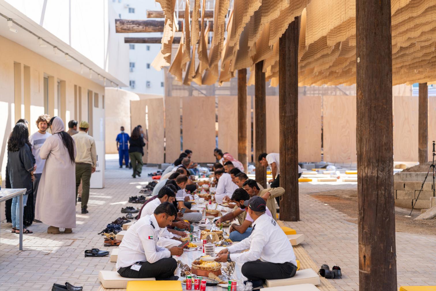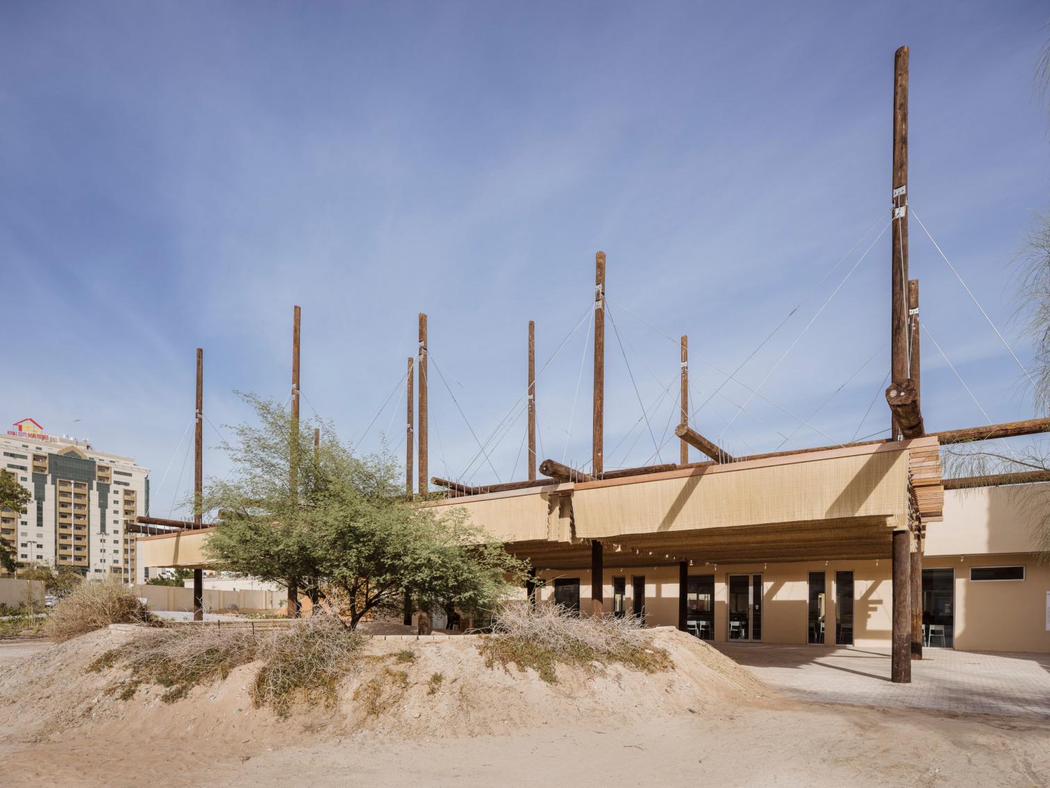 El proyecto incorpora materiales recuperados de la infraestructura local. La Sharjah Electricity, Water and Gas Authority (SEWA) reemplazó postes de madera por otros metálicos. De entre el centenar de maderos desechados se seleccionan los que están en mejor estado, se cortan los extremos dañados y se transforman en una estructura funcional que proporciona sombra. El revestimiento de esta estructura se completa con esteras de palma, un material tradicionalmente utilizado en la región y disponible en los bazares locales.