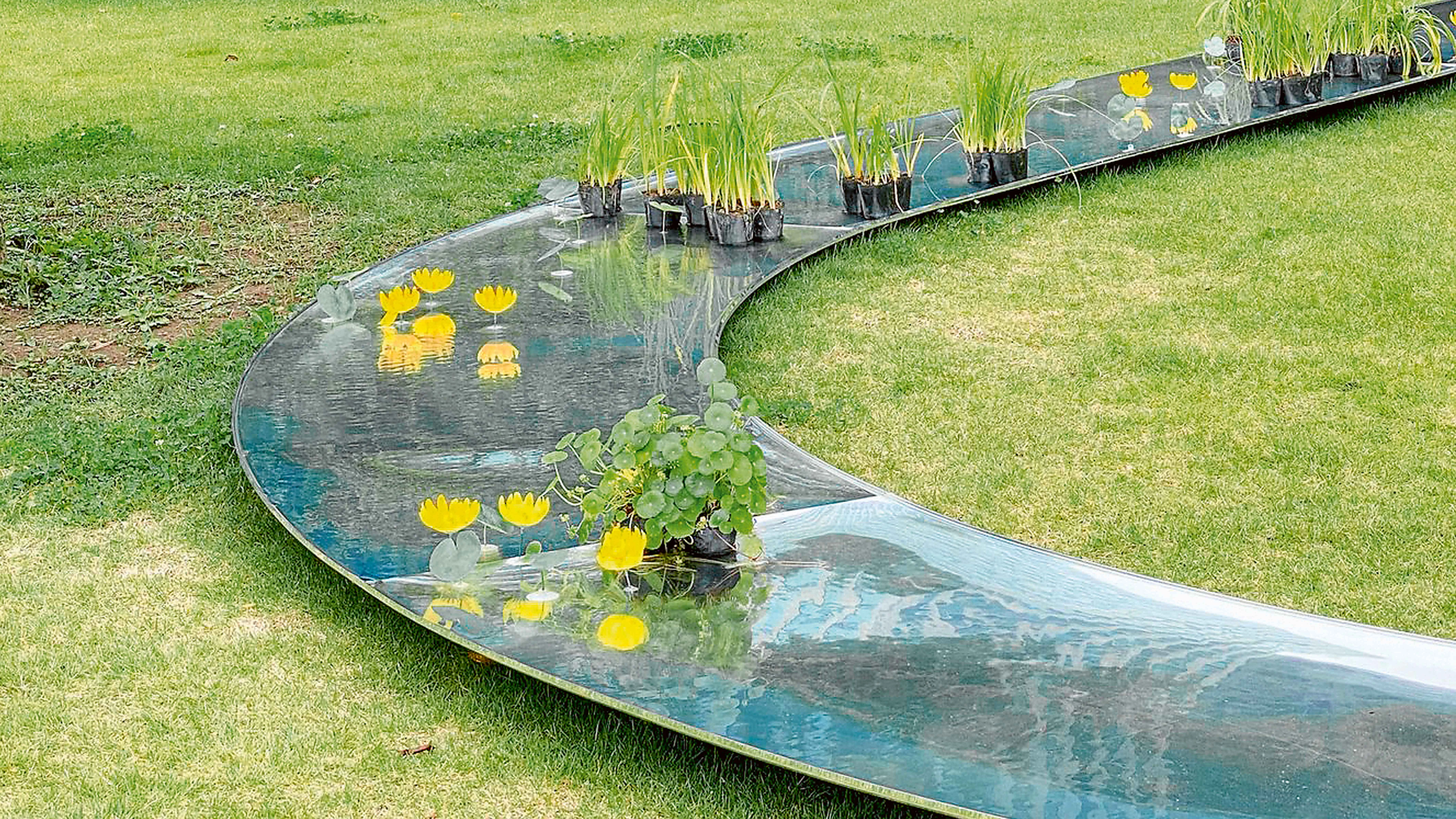 Dentro de los jardines de Hamarikyu —finca de la familia imperial durante casi tres siglos que se cedió al Ayuntamiento tras la Segunda Guerra Mundial—, la elección del emplazamiento no es casual: una banda de superficie espejada se despliega sinuosamente en donde se levantó la primera residencia para dignatarios extranjeros del país, encarnando así el espíritu hospitalario de los tokiotas. Por ella fluye un débil torrente de agua que baña pequeños macizos de flores y evoca el kyokusui no utage, un refinado juego cortesano en el que se componían poemas a la vera de un riachuelo en el tiempo en que una pequeña copa de sake flotando a merced de la corriente completaba el serpenteante recorrido.