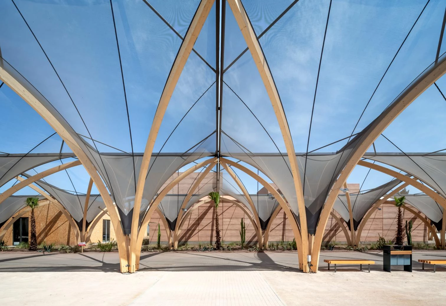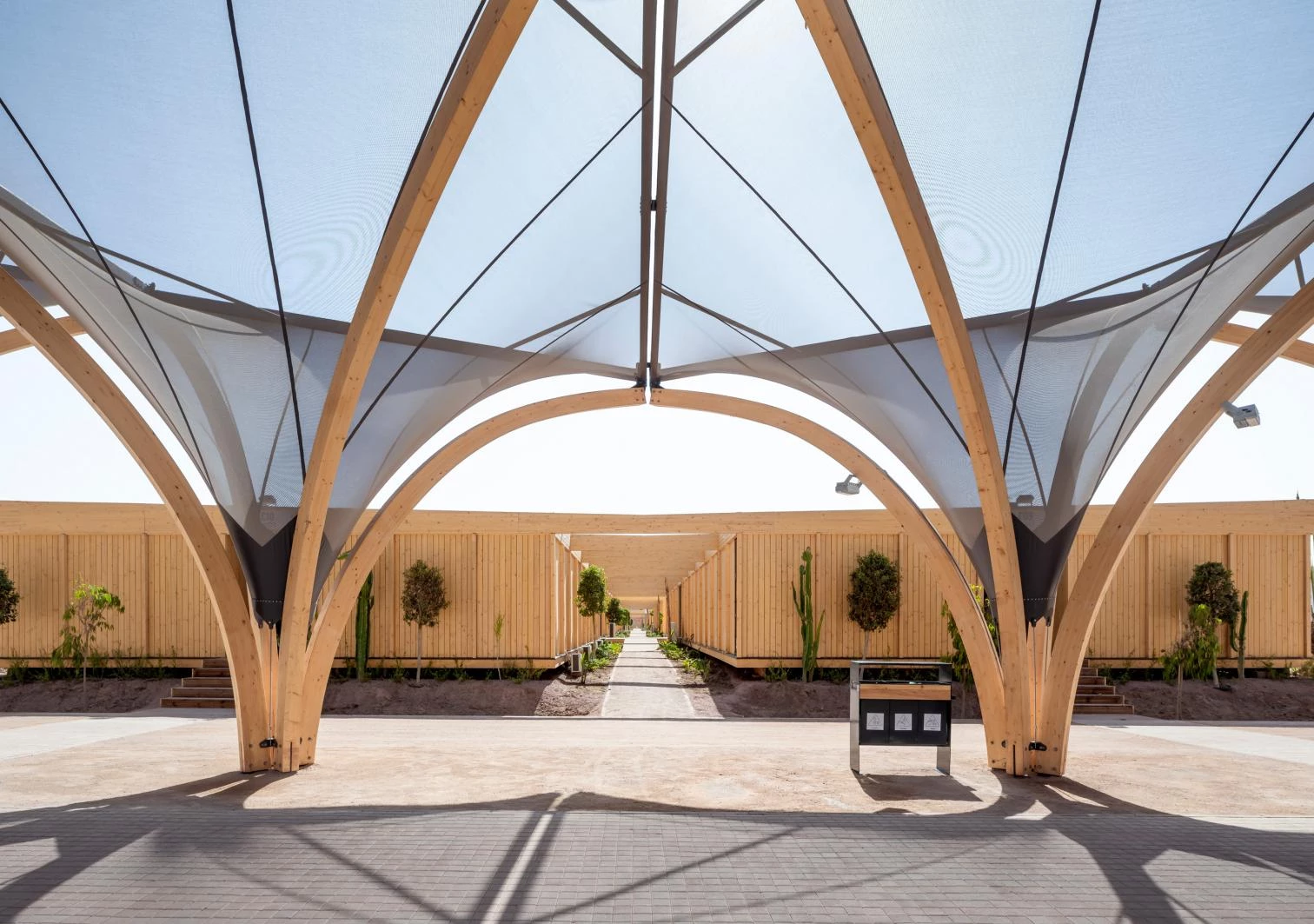 Fragmentado en cuatro zonas para agrupar los diversos programas de eventos y oficinas, el conjunto está organizado en torno a una vía principal de circulación, protegida por estructuras tensadas, inspiradas en las tiendas de campaña tradicionales de los moussems, así se denominan en el Magreb a los festivales anuales de cosecha, religiosos y culturales, que reúnen a pueblos nómadas dispares con fines de alianza y celebración.