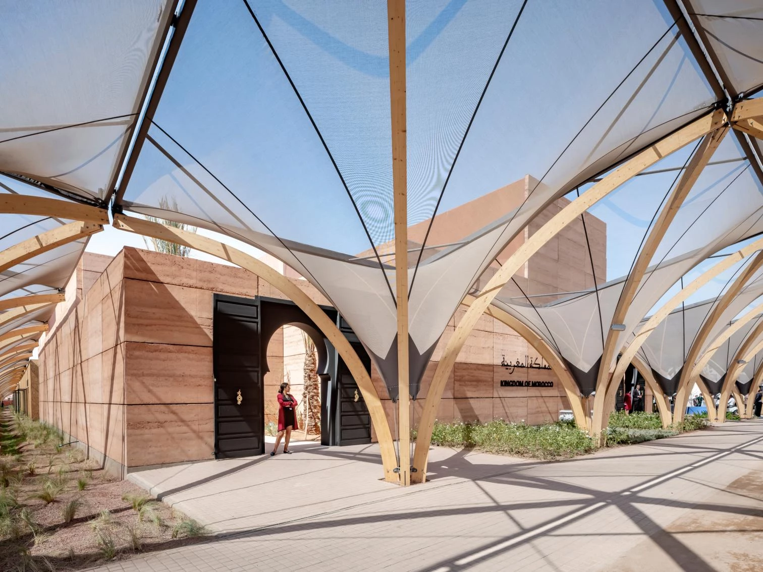 Realizado con paneles prefabricados de tierra compactada de tonos rojizos, fijados a una estructura de acero, el Pabellón de Marruecos invita a los visitantes a descubrir la historia y la riqueza cultural del país.
