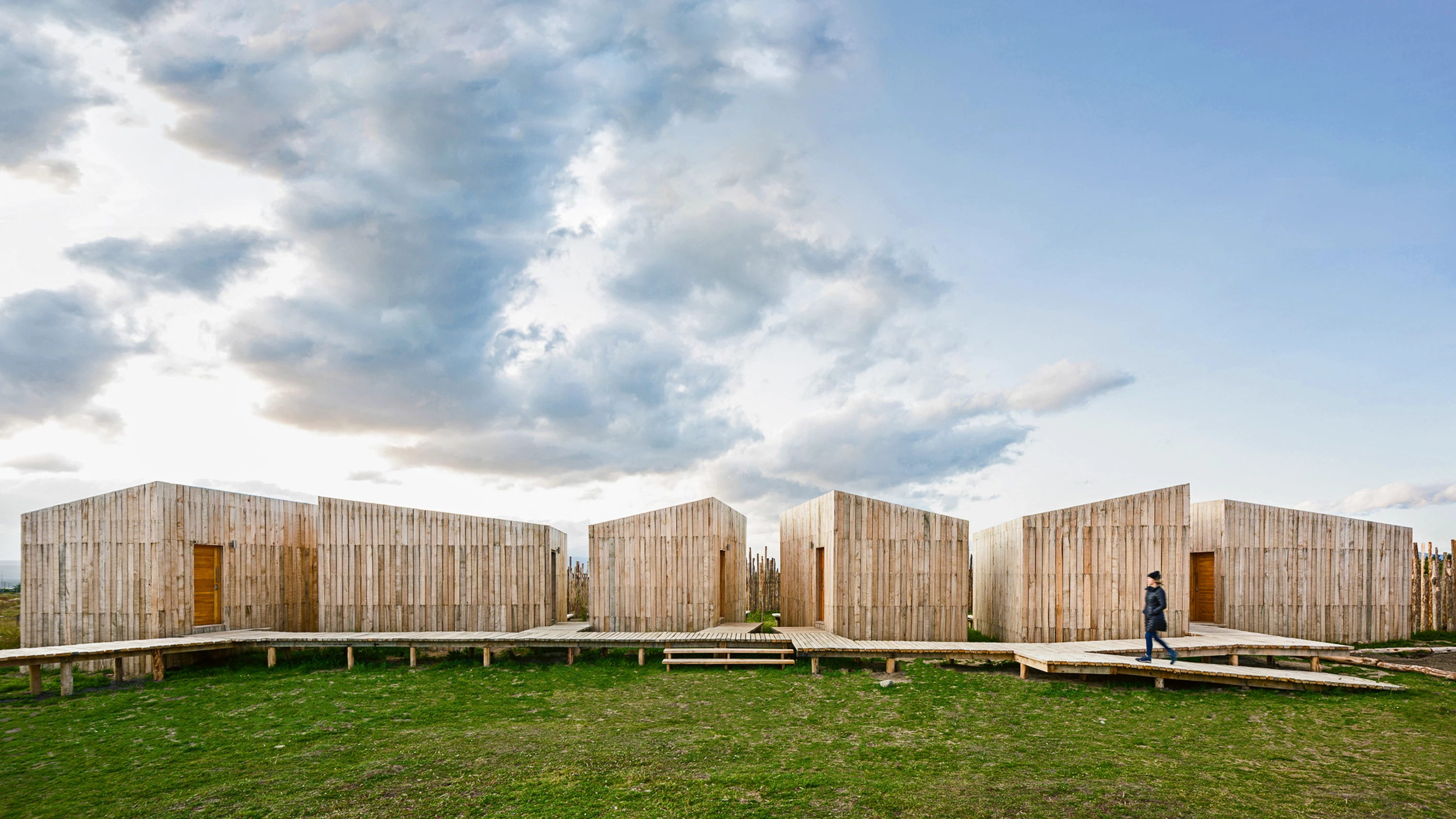 Basadas en los conceptos de encuentro y contraste entre el paisaje y la arquitectura, las cabañas proyectadas por el arquitecto chileno Pablo Larroulet emergen en Puerto Natales, en la región patagónica caracterizada por la presencia de glaciares, volcanes y montañas. El conjunto está compuesto por siete módulos prefabricados de madera: uno de ellos, destinado a usos comunes, incluye una cocina; los otros seis contienen habitaciones. El progresivo envejecimiento del material diluirá el impacto visual de lo construido en la naturaleza. Posicionados estratégicamente para optimizar las vistas y el acceso de luz natural, los volúmenes quebrados están elevados sobre pilotes para minimizar su huella en el terreno.