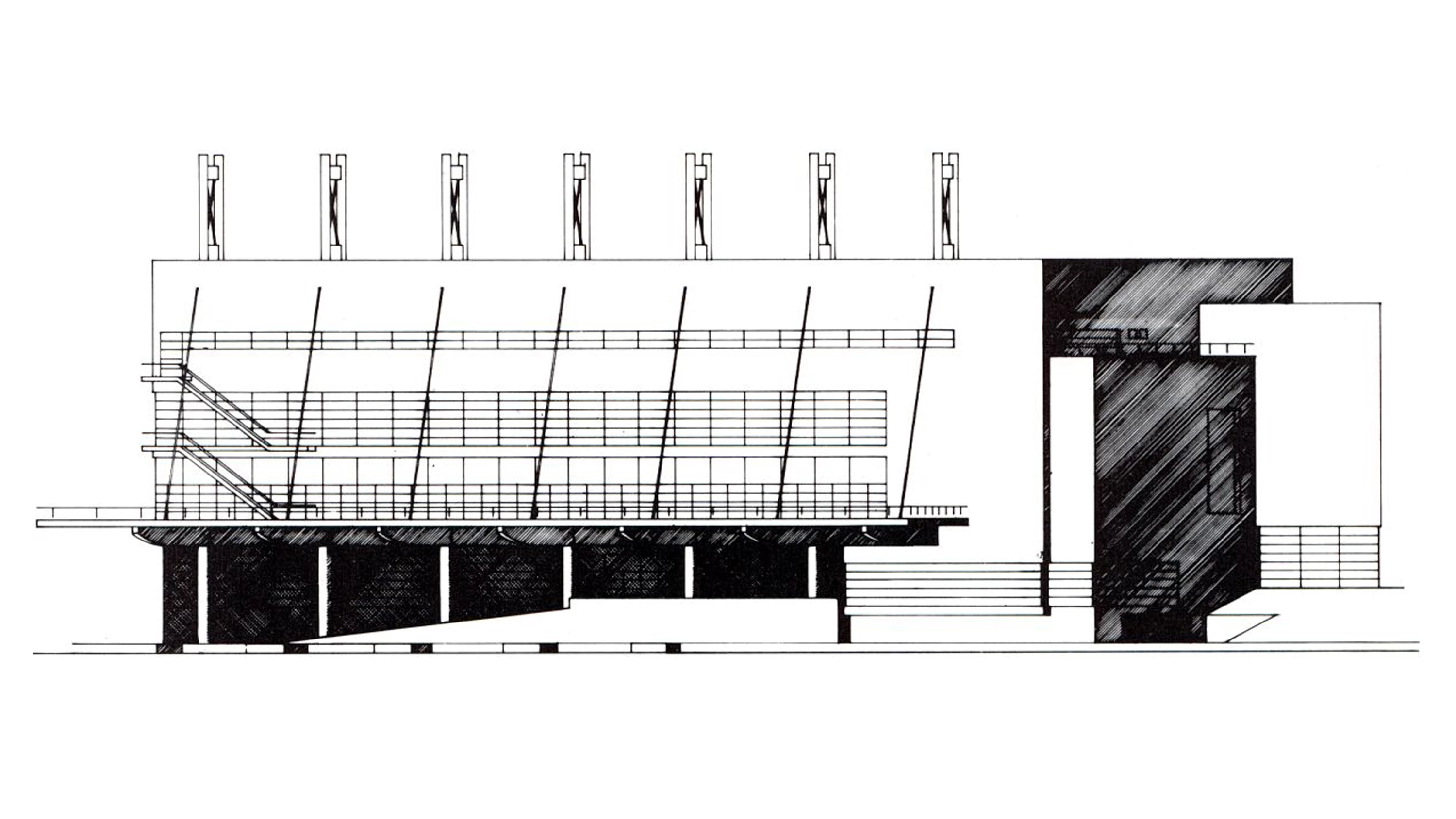 Otra rampa, así como unas escaleras y un ascensor, conducirán al público desde el vestíbulo hasta el nivel superior, donde se han agrupado los cines más pequeños solicitados en el programa. Especial cuidado se ha puesto en el diseño del espacio creado entre ellos, que forma zonas para actos sociales. En este primer piso habrá también un café-bar con acceso directo al restaurante abierto sobre la plataforma de la marquesina. Esta plataforma-terraza es de hecho un elemento clave del proyecto y se concibe como un magnífico plano horizontal y suspendido desde el cual se divisará el resplandor de Venecia en las noches de verano. A él se confía la creación de la atmósfera necesaria para un Festival de Cine de tan gloriosa historia como el de Venecia...[+]
