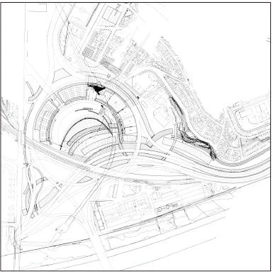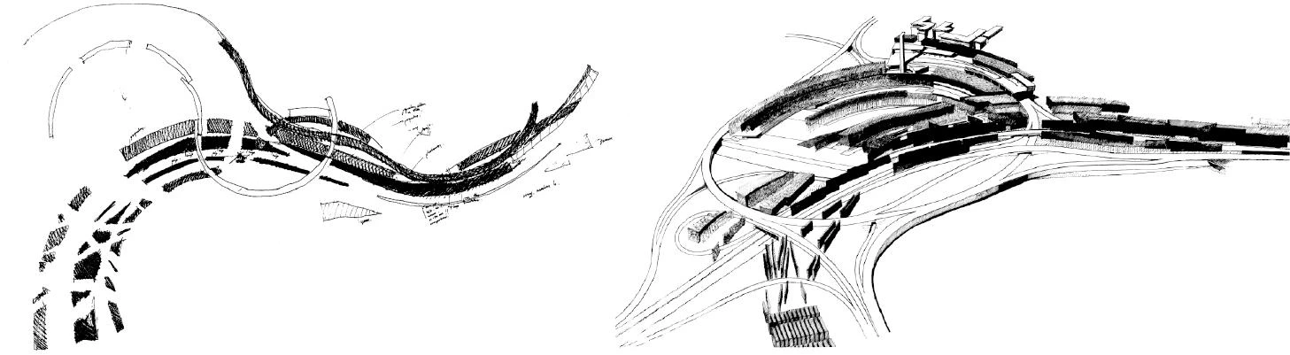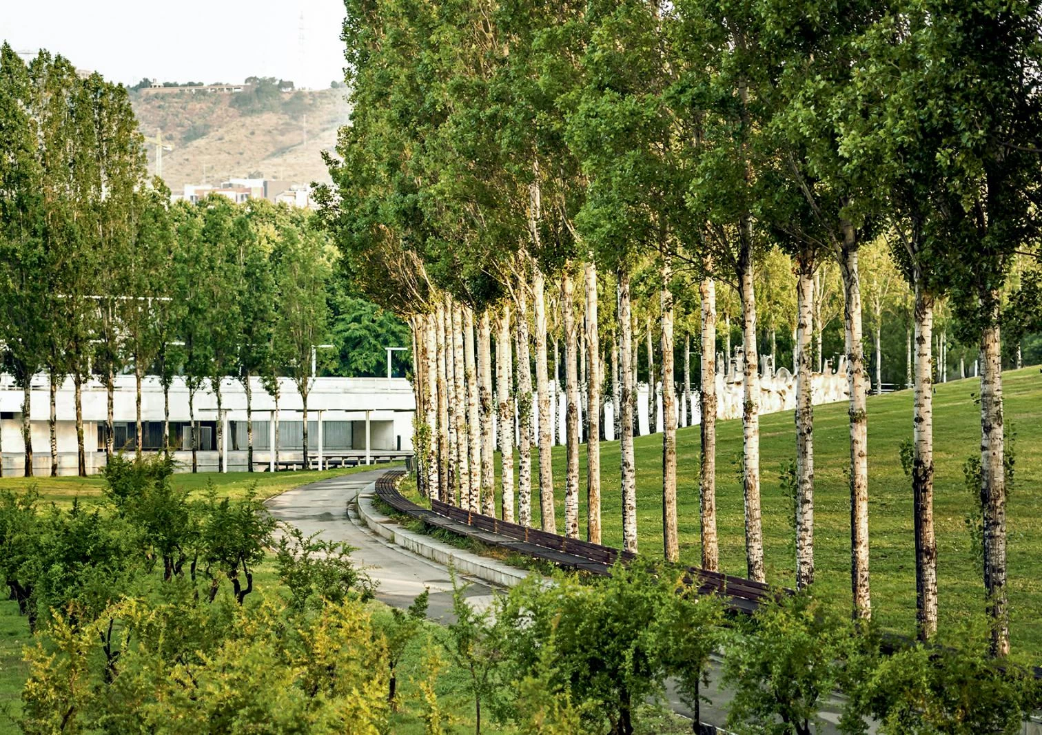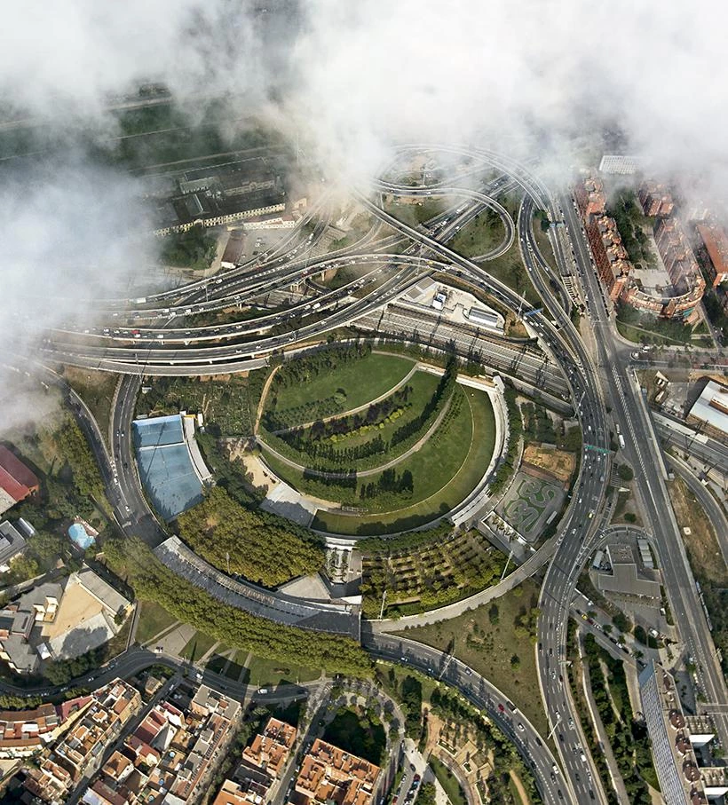 La geometría del intercambiador se convierte en el instrumento de trazado a partir del cual desarrollar todos los usos: aparcamiento, equipamientos deportivos, paseo, anfiteatro, estanque, caminos y arboledas. Barreras de cipreses, dehesas de chopos y plátanos, tramas de olivos o frutales sobre estructuras metálicas... Utilizando especies autóctonas, la vegetación contribuye a modificar la escala del lugar, lo que se refuerza con una topografía centrada en un único efecto formal: una colina que sube desde la cota más baja del terreno hasta alcanzar la altura de las autopistas; las alineaciones vegetales que siguen el margen del río entran en el parque y la remontan.