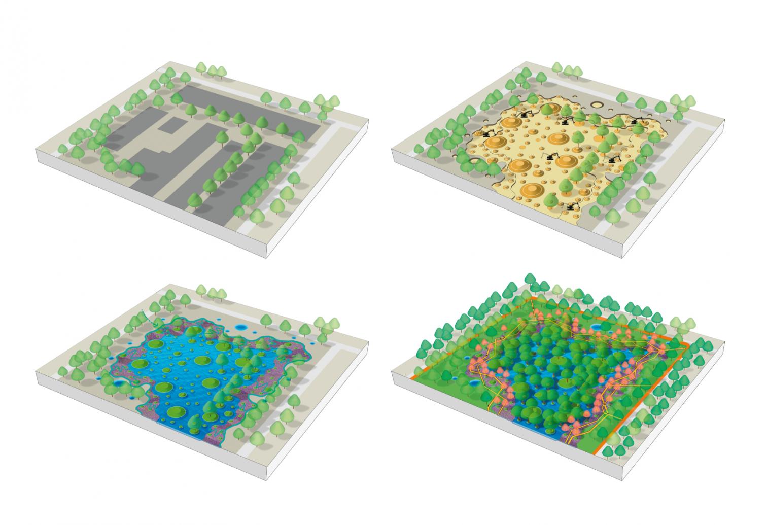 El trazado de caminos y áreas de esparcimiento se sirve de los conocimientos de irrigación tradicionales, apoyándose en regatos y estanques que permiten conducir y drenar el exceso de agua en una zona con un alto nivel freático.