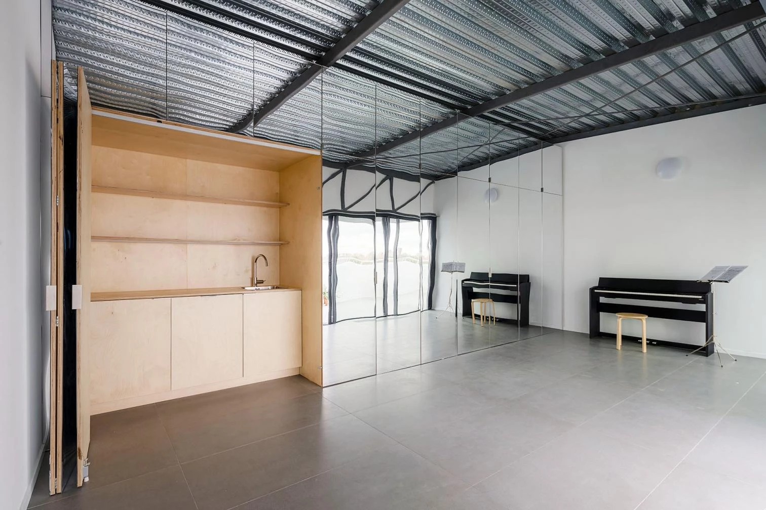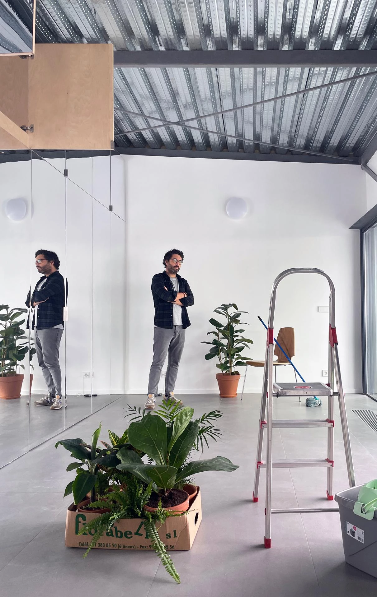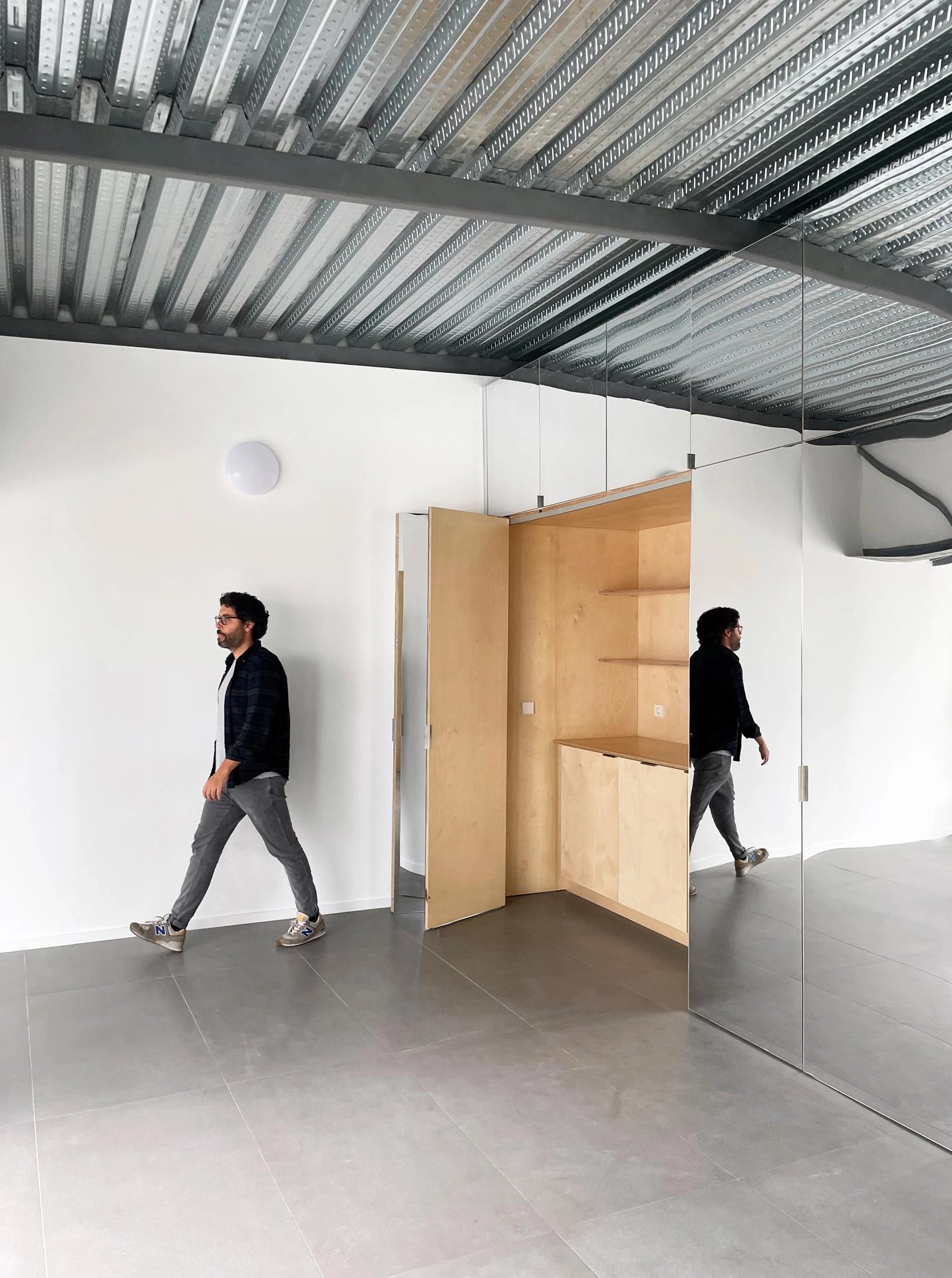 Por último, la naturaleza de la obra de la artista requería un interior amplio y versátil capaz de atender las demandas espaciales de las distintas disciplinas que confluyen en su trabajo, así como las necesidades vitales cambiantes de su familia. Como respuesta a estos condicionantes, el programa de apoyo —una cocina, un baño y almacenaje— se traslada a una banda de 1,10 metros de ancho dando lugar a una única estancia flexible, autónoma e indeterminada de 6,5 x 3,5 x 3,5 metros abierta a una generosa terraza. La percepción del tamaño y de la escala se ven alteradas por el revestimiento de espejo del ‘muro equipado’ en el que se reflejan la estructura y el horizonte de la ciudad, dando lugar a un espacio cambiante a lo largo del día.