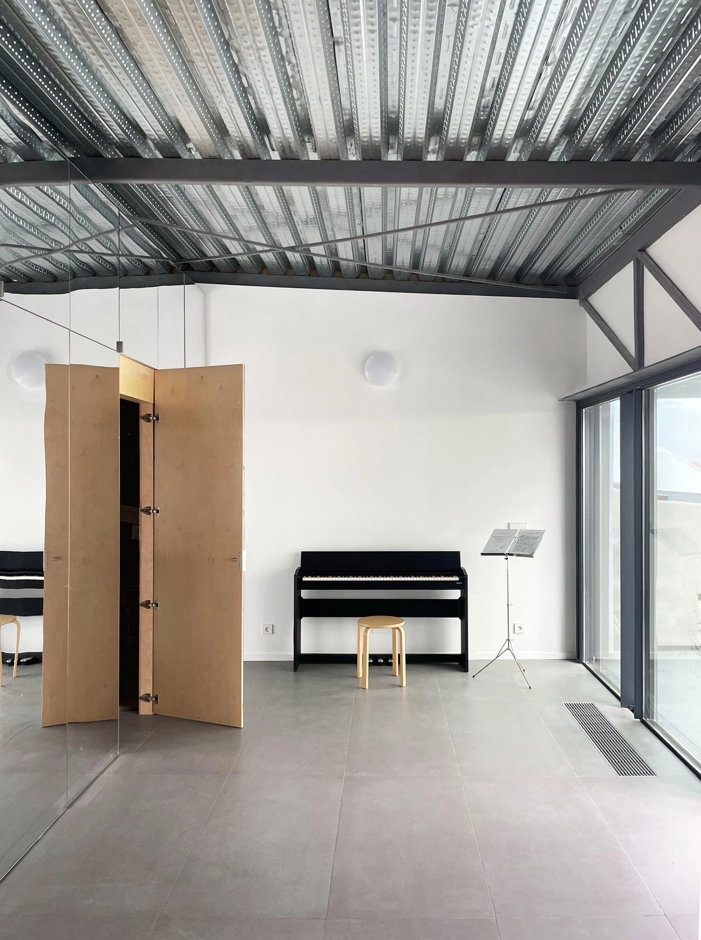 Resultado de la ampliación de una vivienda existente, este espacio de producción artística, como entorno físico y simbólico, está concebido como un elemento catalizador del proceso creativo de una artista cuyo trabajo combina la música, la danza y la performance. La propuesta final, un sencillo contenedor inspirado en el imaginario del estudio de un artista (grandes ventanales, espacios multifuncionales y una paleta de materiales reducida), responde a tres factores fundamentales.