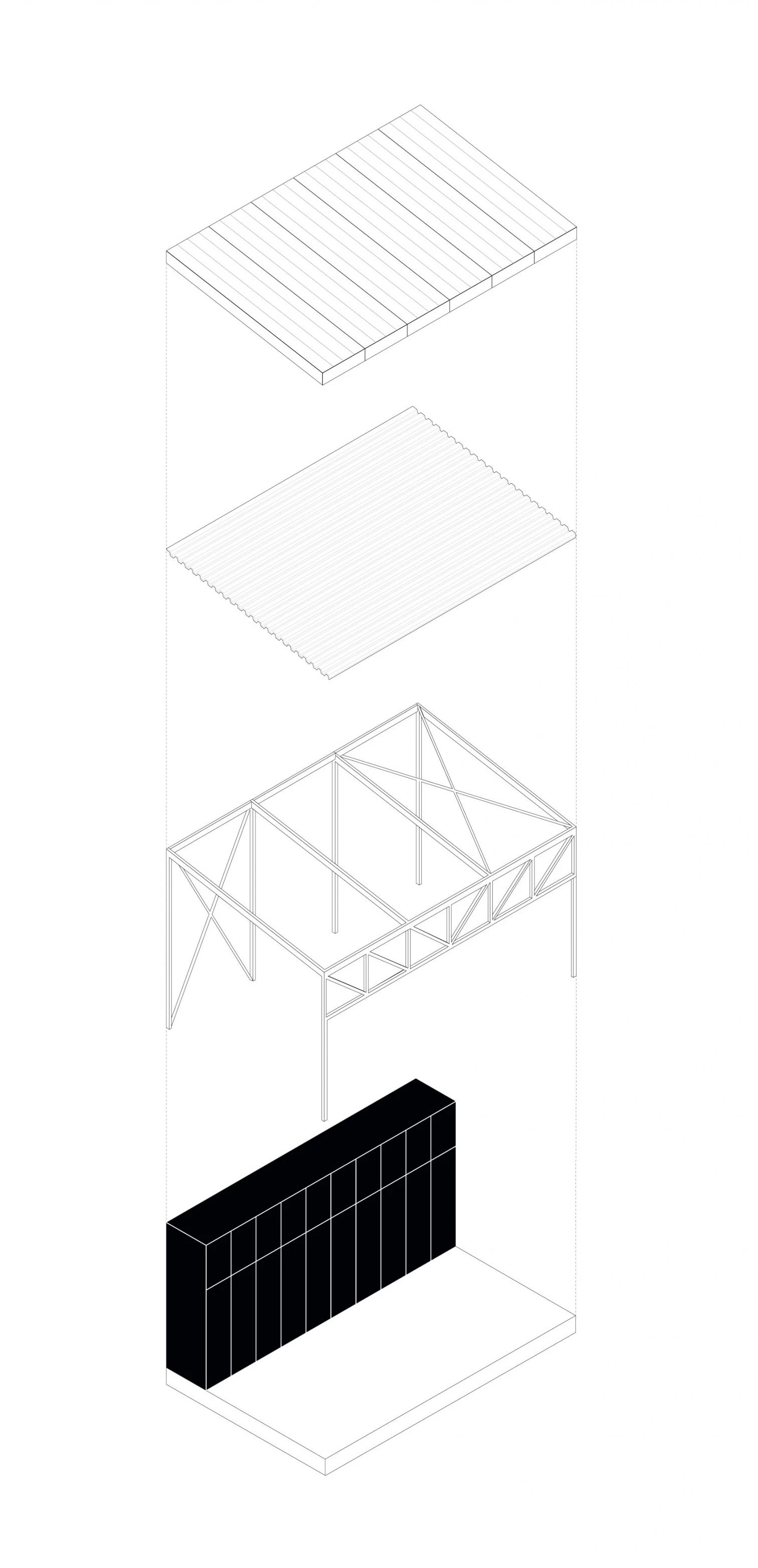 La segunda estrategia responde a las complicaciones logísticas del emplazamiento del pabellón: un edificio de quince plantas equipado con un montacargas de apenas (1,3 x 1,1 x 2,15 metros) como único elemento de elevación de material. En este contexto, se optó por un sistema constructivo basado en el ensamblaje de pequeños elementos de acero —un entramado de pilares, vigas y una cercha— dando lugar a una estructura espacial que configura el volumen exterior y libera el interior de apoyos . Este sistema, además de solventar el problema inicial, permite un posible desmontaje y posterior reutilización de todos los elementos, reduciendo la huella de carbono final del conjunto.