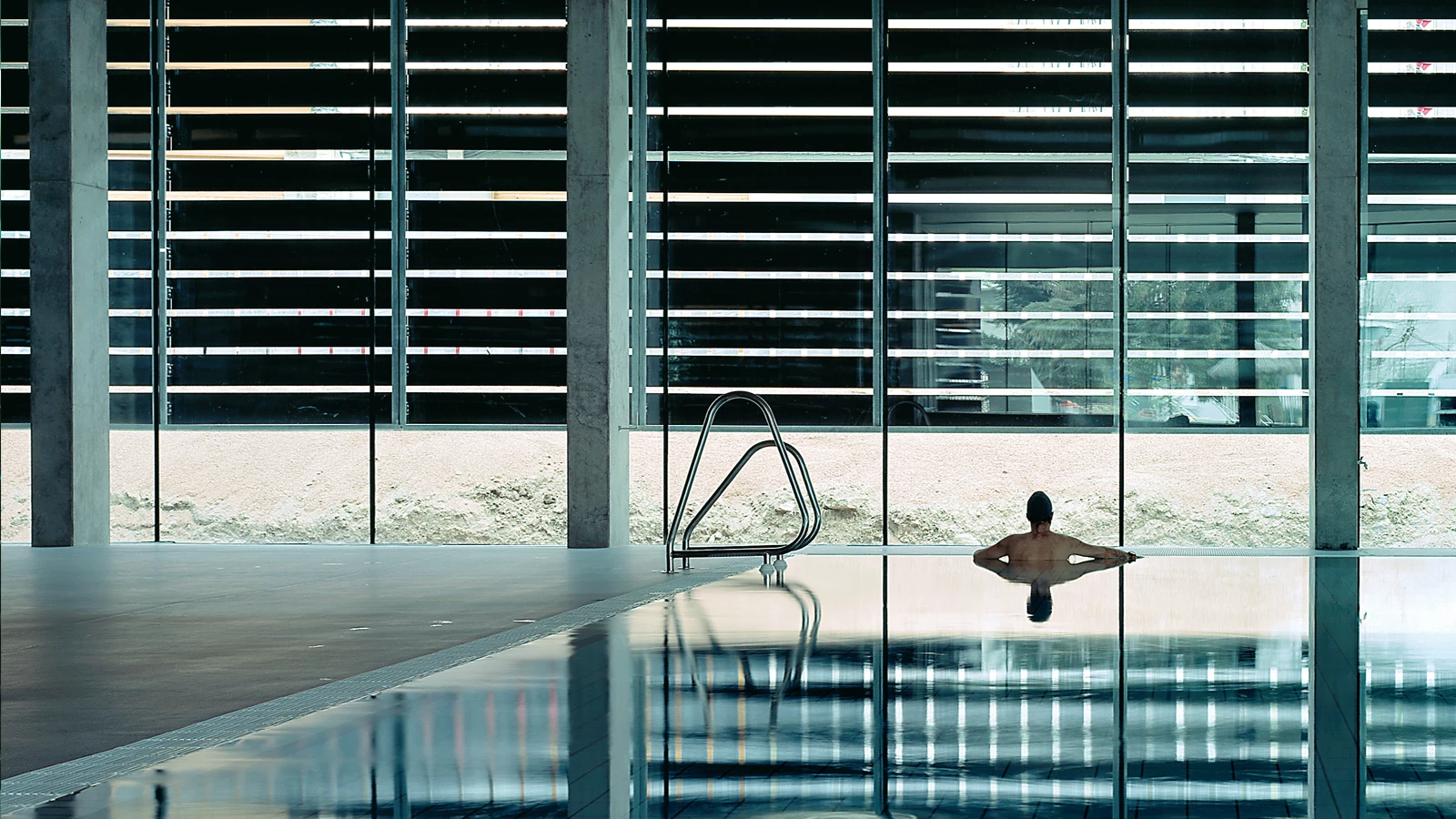 El graderío discurre a lo largo de los cincuenta metros de longitud del vaso principal y se abre hacia el paisaje mediante unas lamas colocadas en la fachada que protegen el recinto del excesivo soleamiento. Al mismo tiempo, establecen un filtro con el lugar, regulando las diferencias de temperatura y controlando las vistas del paisaje. El resto del cerramiento se ha realizado con planchas onduladas de acero no coincidentes en altura, que generan múltiples reflejos aportando a la superficie de la fachada cierta sensación de movimiento. Con ello la envolvente adquiere las cualidades propias de una superficie acuosa y, de este modo, se refuerza el vínculo que existe entre el sistema constructivo empleado y la función del edificio.