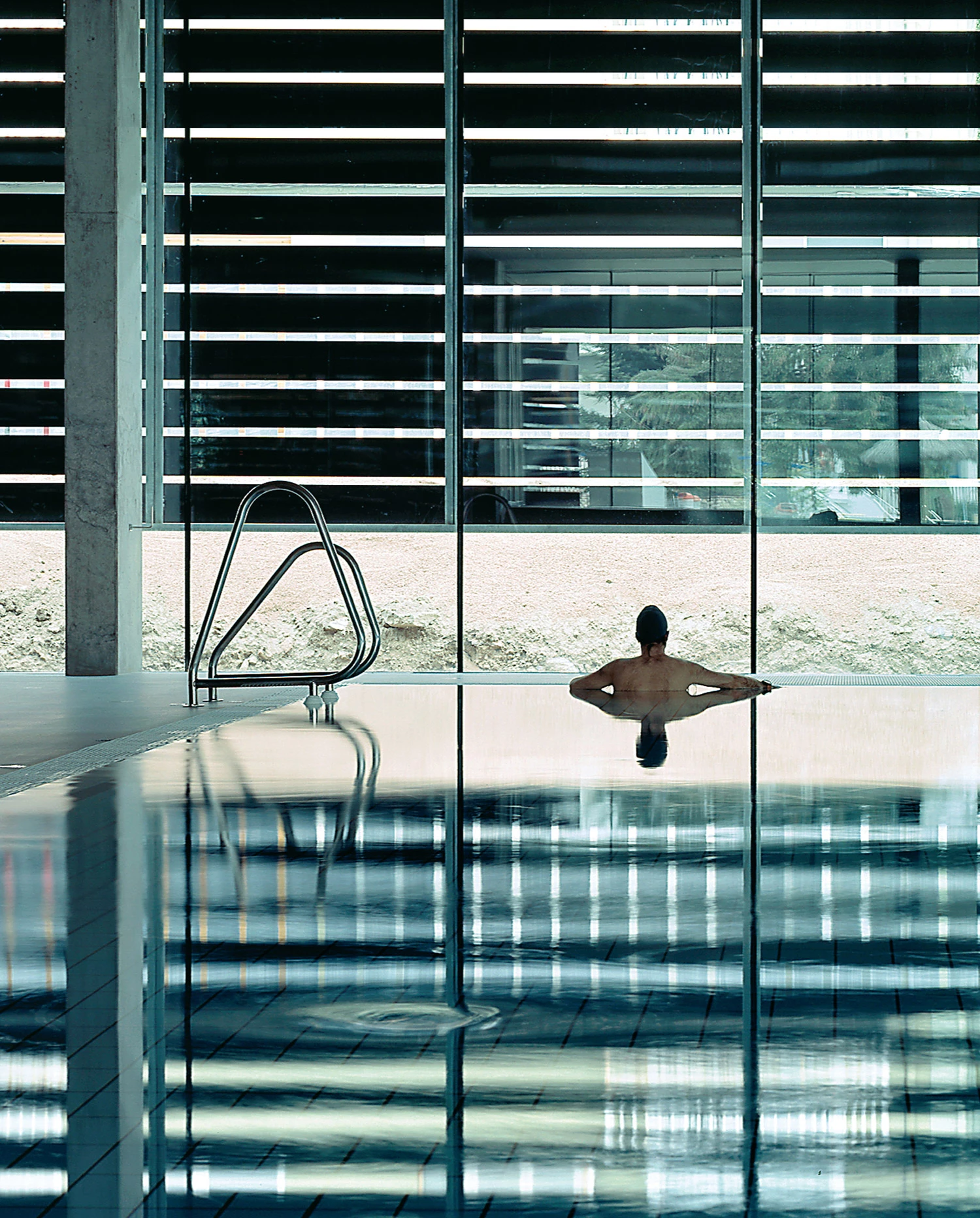 Como telón de fondo del conjunto, se ha construido un volumen prismático apoyado sobre el límite del solar. El proyecto inicial contemplaba su ubicación sobre una superficie de agua, buscando materializar la idea de flotación y jugando con los reflejos acuosos. Esta delgada lámina penetraba de modo simbólico en el interior del edificio de tres formas distintas: a modo de grieta, como patio de luz y finalmente, como elemento de separación entre los vasos de la piscina y entre éstos y los vestuarios. Por ello, el acceso se producía a través de una pasarela ubicada sobre el agua.