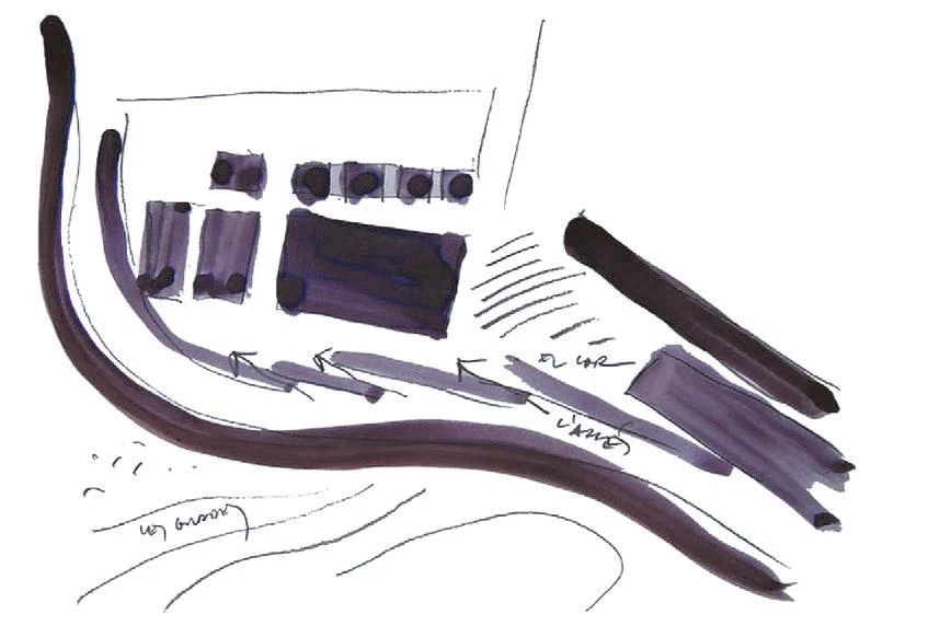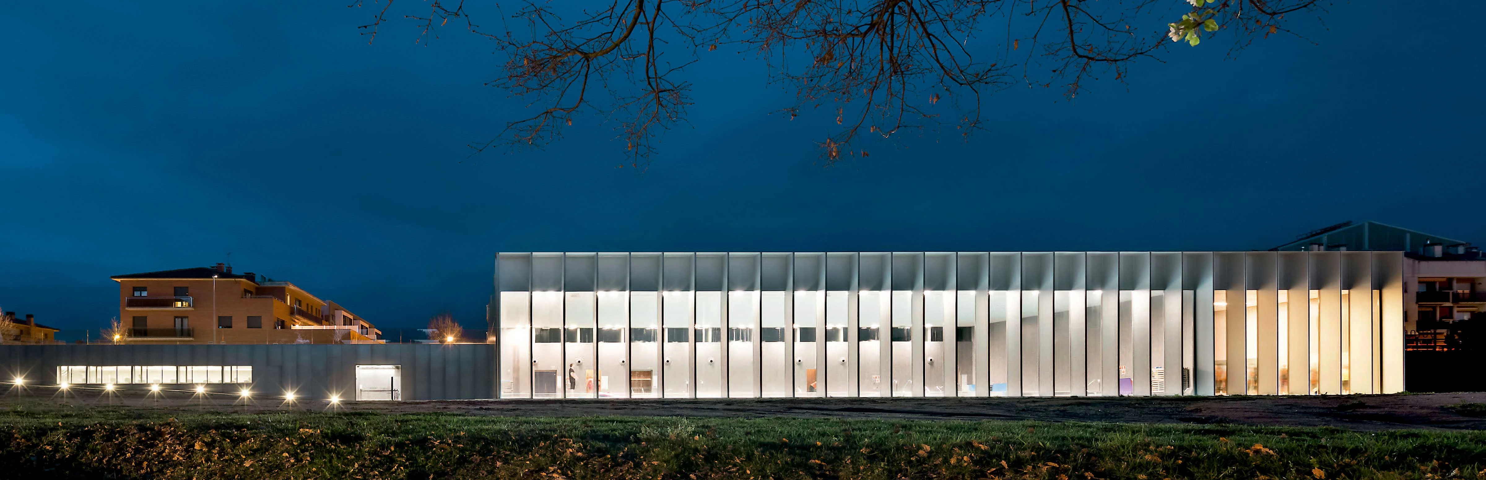 Desde la calle se despliega, como si se tratase de una valla, un pequeño muro, que marca el acceso al complejo a través de una rampa y oculta, debajo, una pastilla alargada en la que se alojan los vestuarios y el resto de zonas húmedas, los almacenes, las zonas dedicadas a la administración y dos pequeñas estancias de actividades conjuntas, además de todas las instalaciones del proyecto.