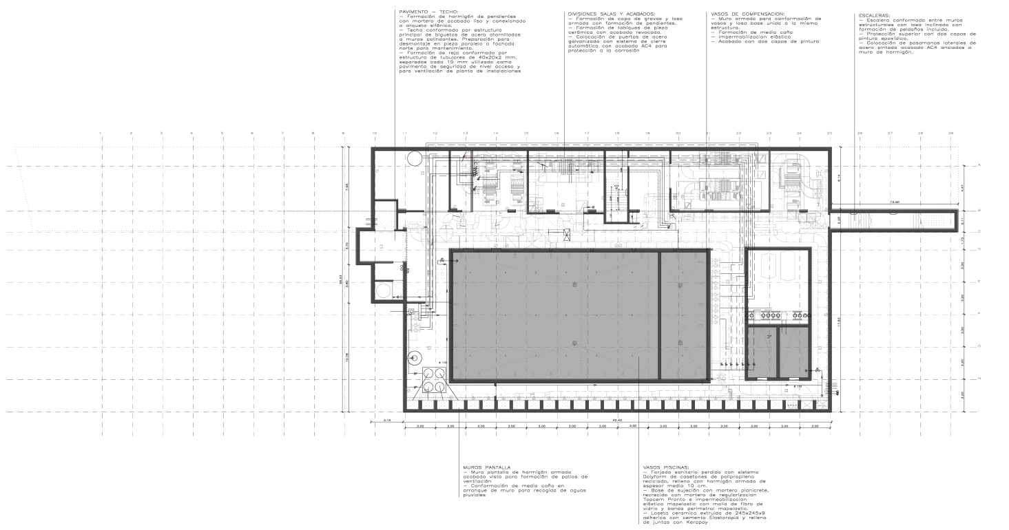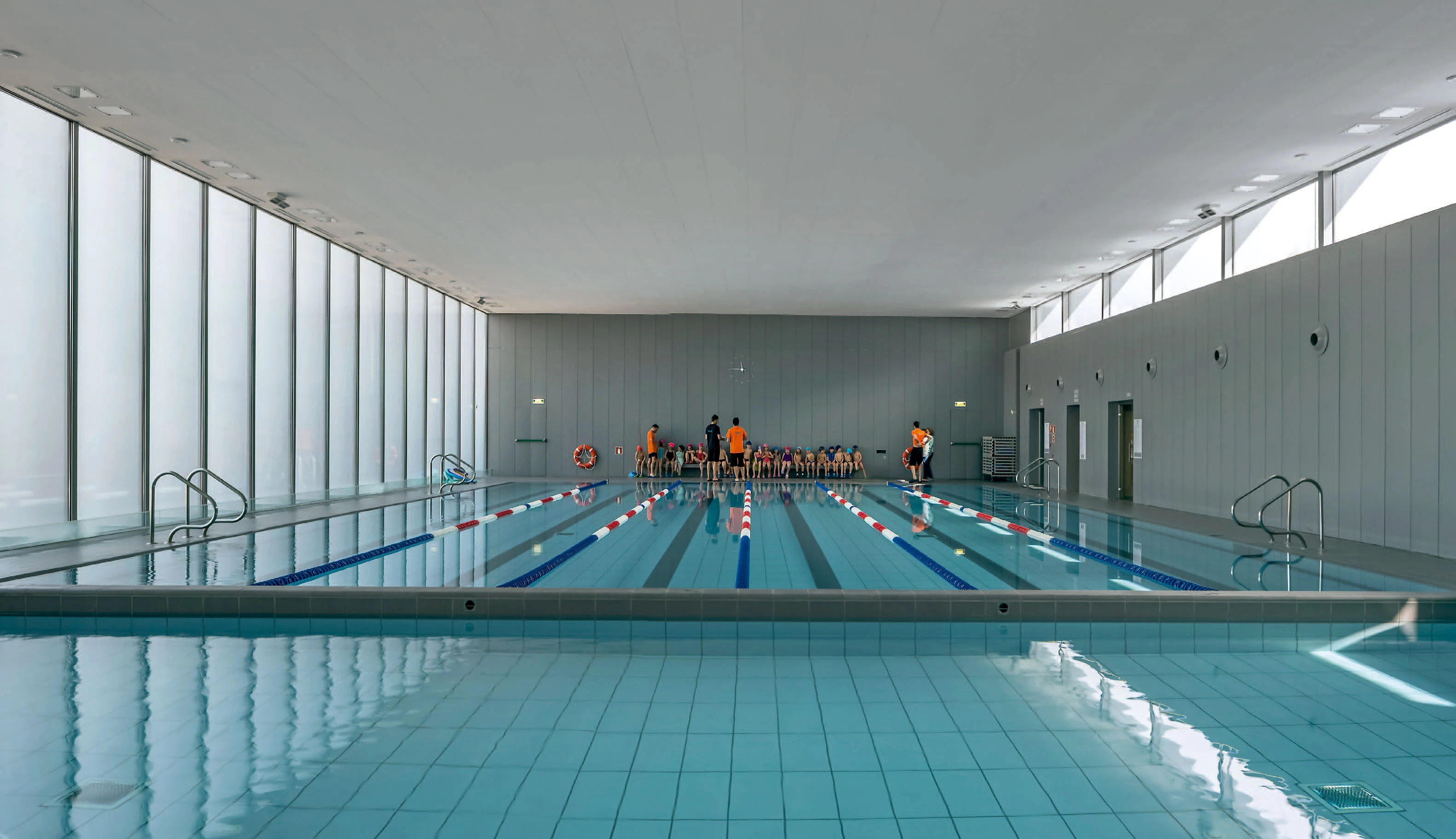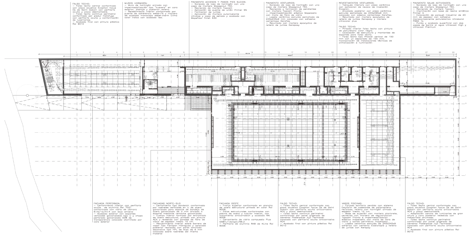Este elemento longitudinal se transforma, al alcanzar el espacio ocupado por las pistas, en un gran mirador desde el que se puede observar el desarrollo de todas las actividades. Los elementos verticales de la envolvente sirven para filtrar estas vistas desde el exterior, pero esa no es su única función, ya que también conforman la estructura portante y protegen la piscina de la luz del sol. Esta disposición rítmica de los pilares favorece la permeabilidad de la zona de natación con respecto al espacio exterior —una plantación de pinos y varios espacios boscosos—, que nunca desaparece del todo: los reflejos del agua recogen el entorno, lo trasladan al interior y atenúan así la potente presencia de la fachada. La estructura reticular de la cubierta, por su parte, se apoya sobre una línea de pilares cortos dispuestos sobre el muro, que siguen la misma modulación empleada en todo el edificio y que generan una serie de lucernarios para terminar de iluminar la superficie de la piscina.