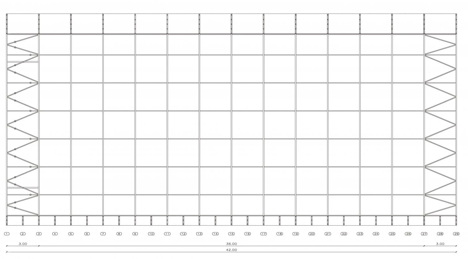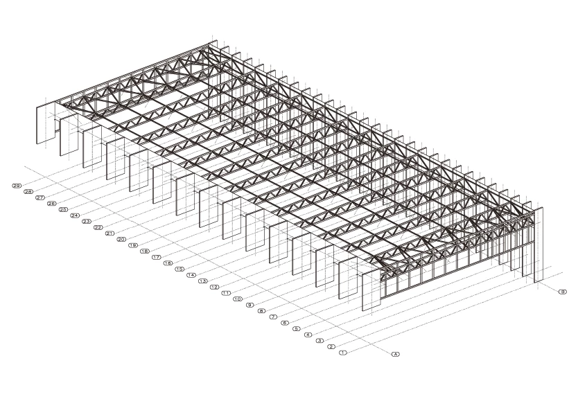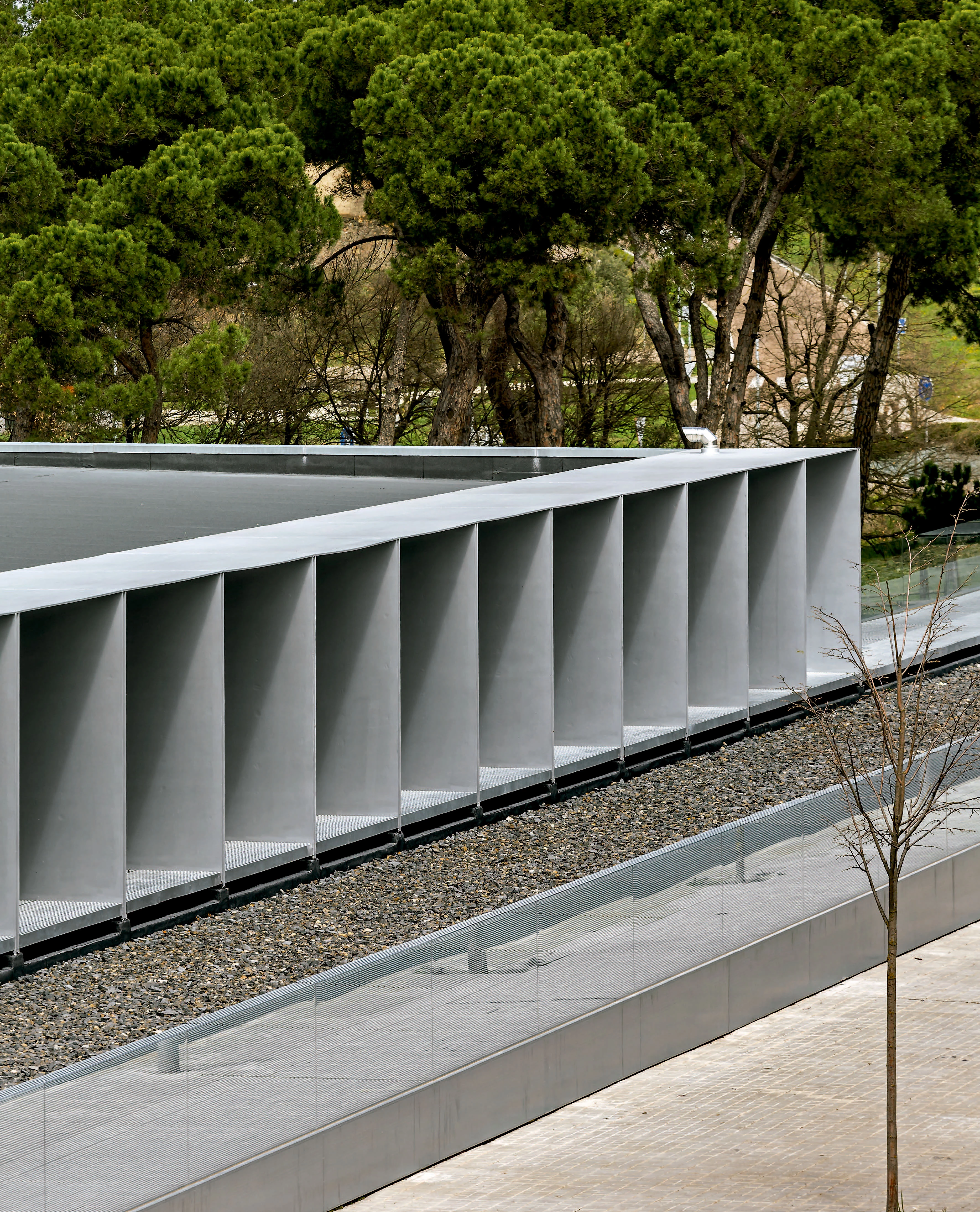 Este elemento longitudinal se transforma, al alcanzar el espacio ocupado por las pistas, en un gran mirador desde el que se puede observar el desarrollo de todas las actividades. Los elementos verticales de la envolvente sirven para filtrar estas vistas desde el exterior, pero esa no es su única función, ya que también conforman la estructura portante y protegen la piscina de la luz del sol. Esta disposición rítmica de los pilares favorece la permeabilidad de la zona de natación con respecto al espacio exterior —una plantación de pinos y varios espacios boscosos—, que nunca desaparece del todo: los reflejos del agua recogen el entorno, lo trasladan al interior y atenúan así la potente presencia de la fachada. La estructura reticular de la cubierta, por su parte, se apoya sobre una línea de pilares cortos dispuestos sobre el muro, que siguen la misma modulación empleada en todo el edificio y que generan una serie de lucernarios para terminar de iluminar la superficie de la piscina.