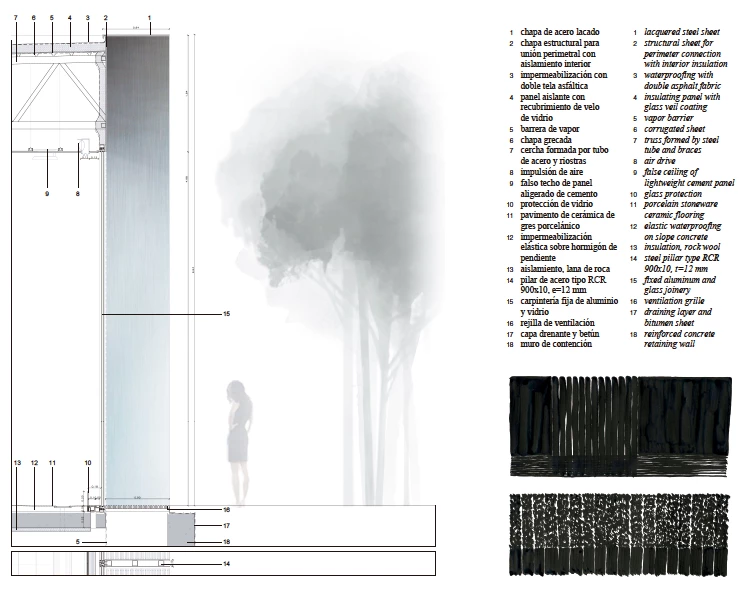 El aspecto industrial de la envolvente, construida con materiales prefabricados —perfiles metálicos y paneles de vidrio, hechos a medida—, contrasta con la apariencia más sólida de los materiales empleados en las salas húmedas y las zonas secundarias del pabellón, que se resuelven con hormigón armado y revestimientos de madera. Por su parte, tanto el falso techo que contiene las luminarias y parte de la instalación eléctrica como algunas de las particiones interiores se realizan con materiales plásticos, también prefabricados, que acentúan con su ligereza la rotundidad formal de la obra.