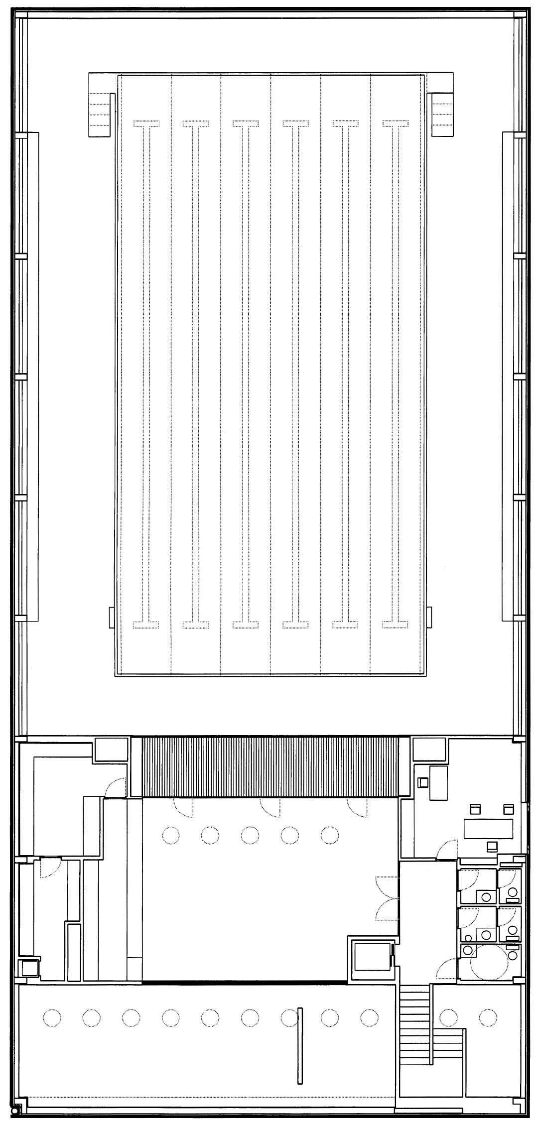 Agrupados en un cuerpo único, dos volúmenes de doble altura albergan respectivamente el gimnasio y la piscina. Entre ambos vacíos el cuerpo correspondiente a la cocina, la cafetería y el restaurante se inserta como un puente abierto lateralmente a estos dos espacios dominantes mediante sendos huecos que reproducen la forma de la sección. Bajo esta zona de gastronomía ubicada en la primera planta se localizan los vestuarios, la sauna y el botiquín. Dos huecos rasgados en la parte inferior de los testeros constituyen el segundo grupo de elementos invariables del proyecto, incorporando el paisaje circundante al gimnasio y la piscina, respectivamente; otros ventanales corridos en la parte alta iluminan con luz rasante el plano del techo, subrayando la independencia de la cubierta respecto del resto del edificio.