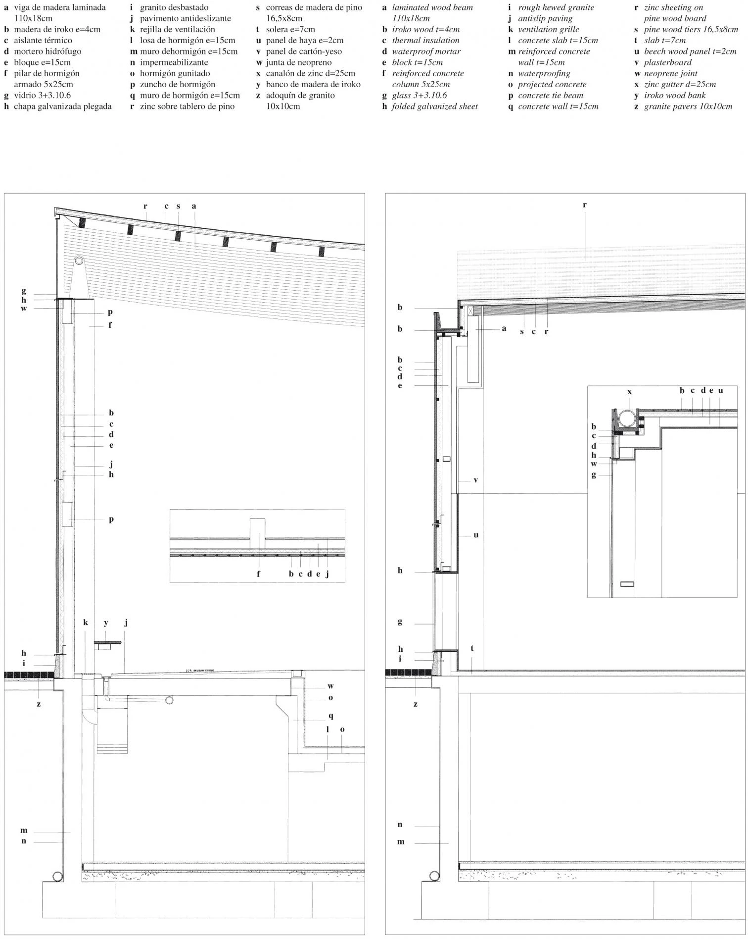 Un mismo pórtico —formado por pilares de hormigón y una viga curva de madera laminada— sustenta geométricamente la sección variable de la cubierta, cuyo papel de plano portador del agua se enfatiza mediante una gran bajante en una de las esquinas del prisma. Contrastando con el aspecto frío de la cubierta de zinc, un enlistonado de madera de iroko envuelve el edificio, transformando el volumen en una suerte de arca abandonada entre las colinas gallegas. Como en los postes del tendido eléctrico aún presentes en el campo gallego, una pátina gris se irá apoderando del cerramiento de madera, contribuyendo a la mímesis del edificio con el paisaje que le ha tocado ocupar. Como una alfombra de adoquines y hierba, la obra de urbanización se trata como el único elemento específico de cada emplazamiento, el que permitirá la adaptación de este prototipo abstracto a las condiciones paisajísticas y urbanas de cada enclave.