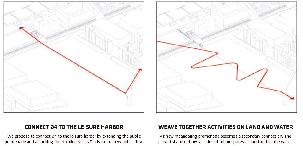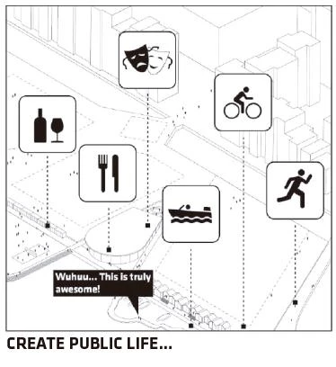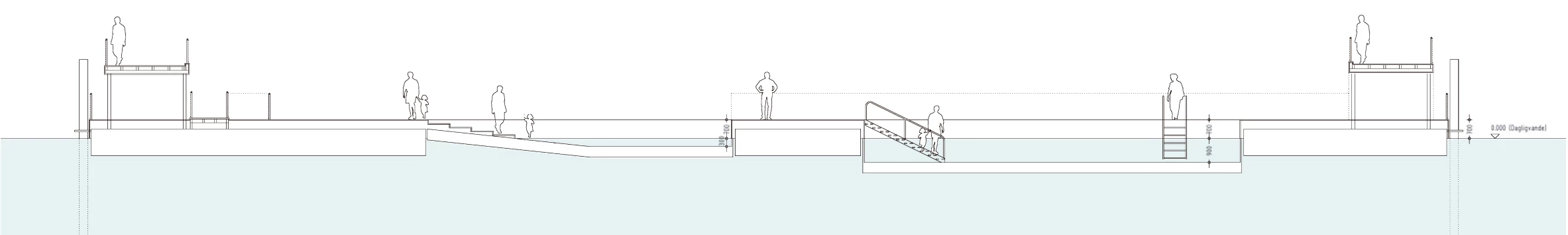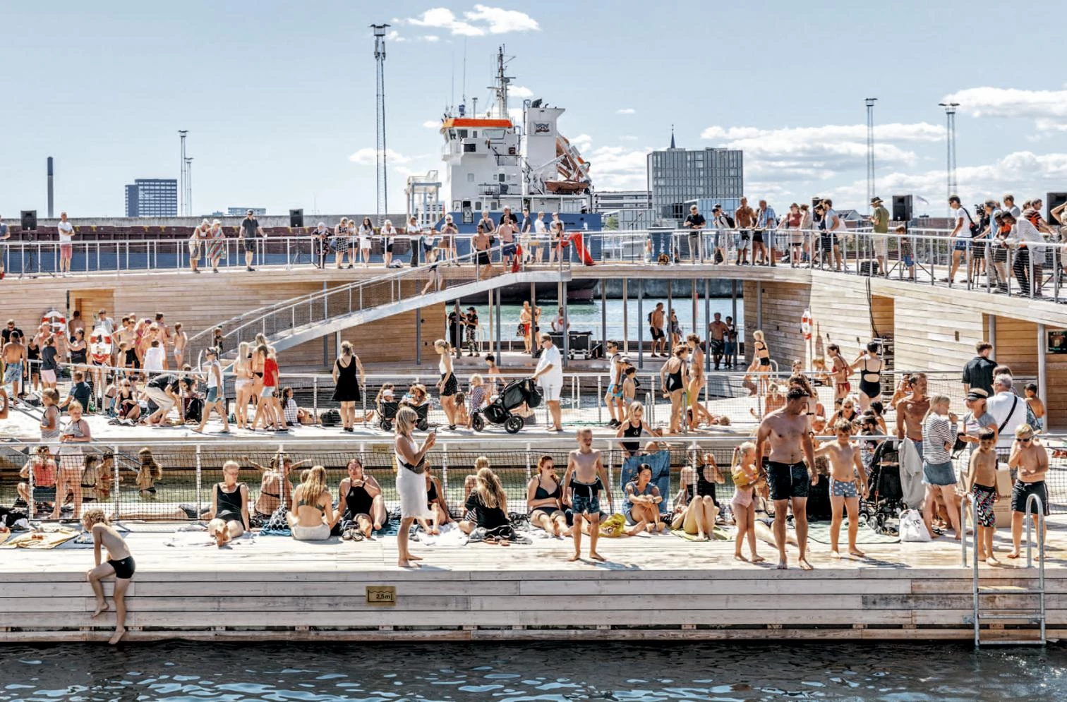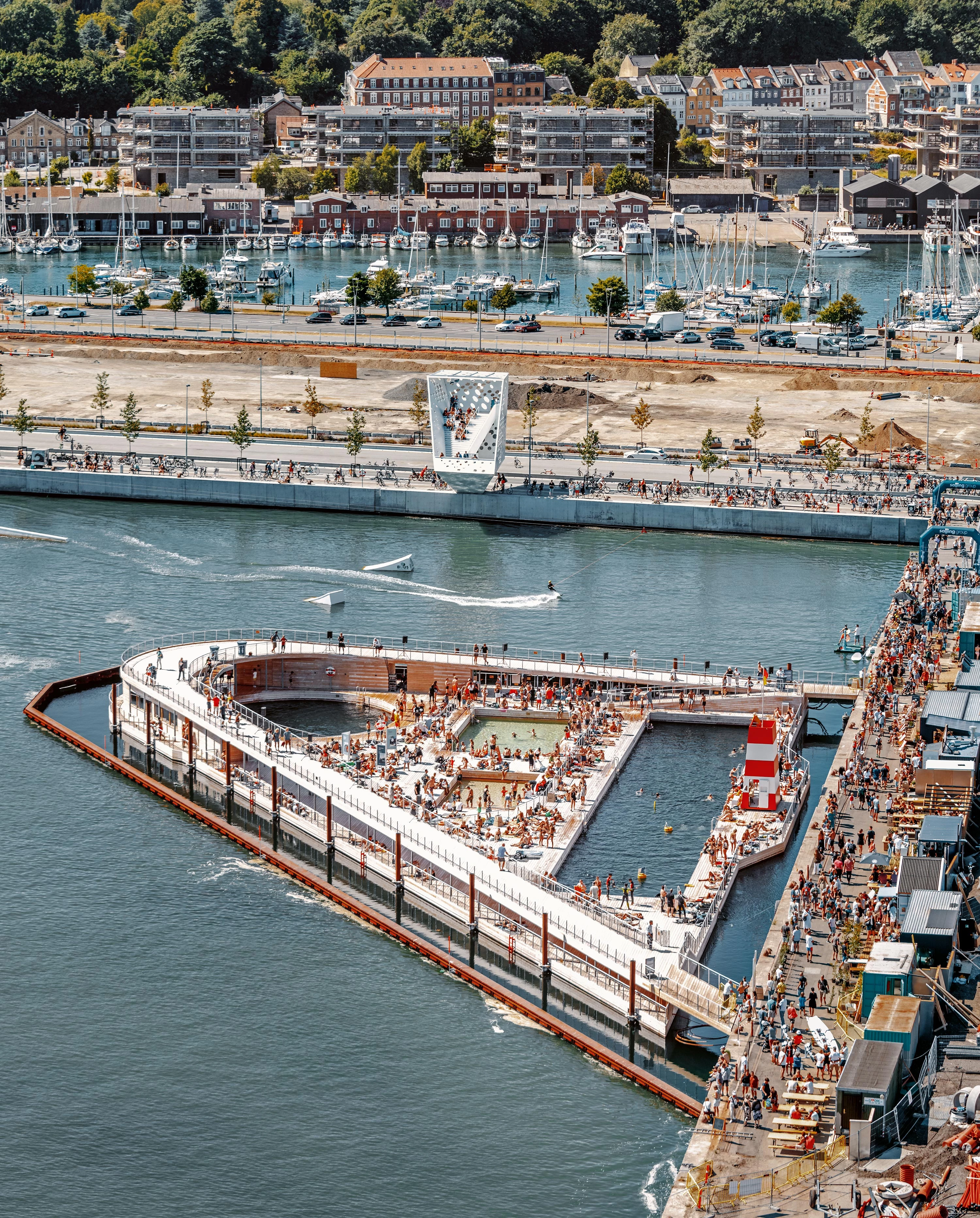 Las piscinas recuperan la idea de la iniciativa llevada a cabo en el puerto de Copenhague en 2002 con el fin de transformar una antigua zona industrial en un nuevo foco social. Concebida junto con el urbanista Jan Gehl, la estrategia de diseño busca crear un marco arquitectónico capaz de albergar el mayor número de actividades con los mínimos elementos construidos. Así, los bañistas cuentan con una gran variedad de espacios diferentes: una poza circular de buceo, un área infantil de poca profundidad, una piscina rectangular de 50 metros de longitud y dos saunas situadas bajo una pasarela pública, así como vestuarios, zonas para tomar el sol y un mirador. Todo ello se construye mediante una superficie continua de listones de madera y se apoya sobre una plataforma flotante anclada a una serie de cilindros repartidos en el perímetro.