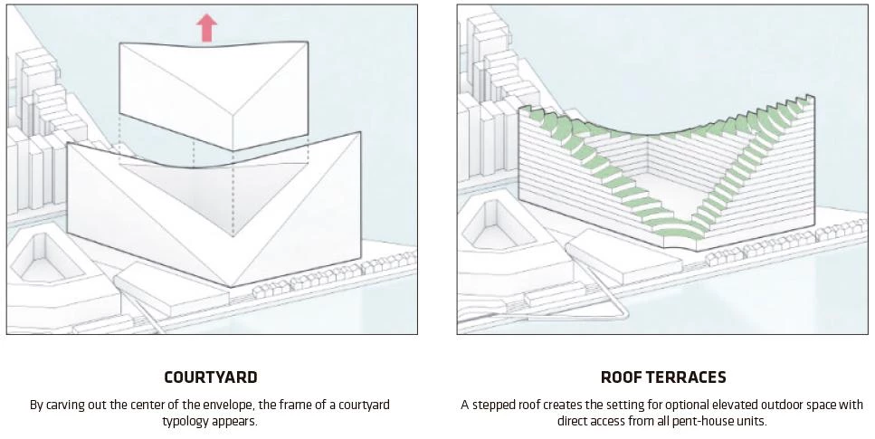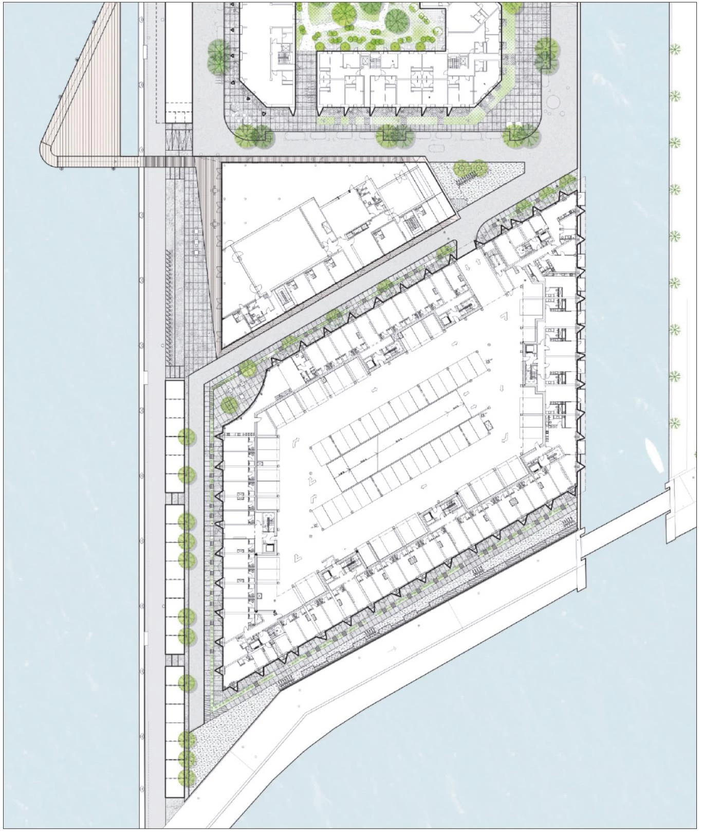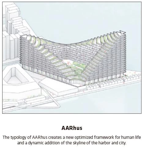 Por su parte, el edificio AARhus es el primero de los siete previstos en el plan general, y se sitúa en el extremo sur de la isla. El proyecto combina los rasgos formales de las tipologías residenciales que predominan en la ciudad: el bloque cerrado en torno a un patio interior, las viviendas en hilera y la torre. Cada esquina del volumen se sitúa en una cota diferente, por lo que el perfil general se conforma mediante niveles escalonados que delimitan amplias terrazas. La envolvente exterior se modela con corredores continuos, mientras que las fachadas interiores se configuran con balcones puntuales. El patio central se organiza con un nivel de aparcamiento a nivel de calle, sobre el que se sitúa un exuberante jardín donde los residentes pueden cultivar verduras y árboles frutales, además de celebrar cenas comunitarias. En planta baja, el perímetro cuenta con locales de uso privado, junto con otros de carácter comercial que contribuyen a dinamizar el espacio público, y en la esquina noreste se incluyen varios apartamentos de dos plantas. La esquina suroeste se curva para definir un espacio multiuso común, abierto al frente marítimo con una terraza.
