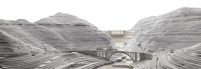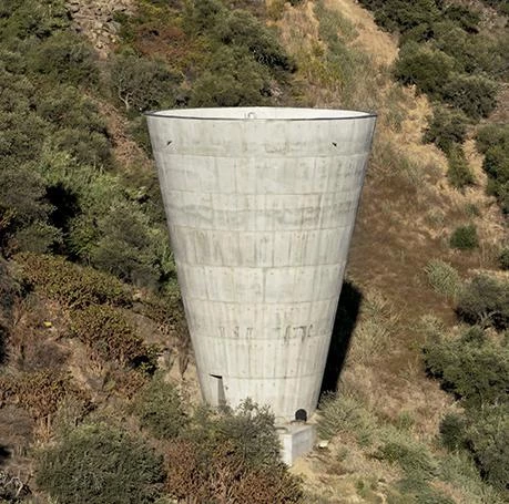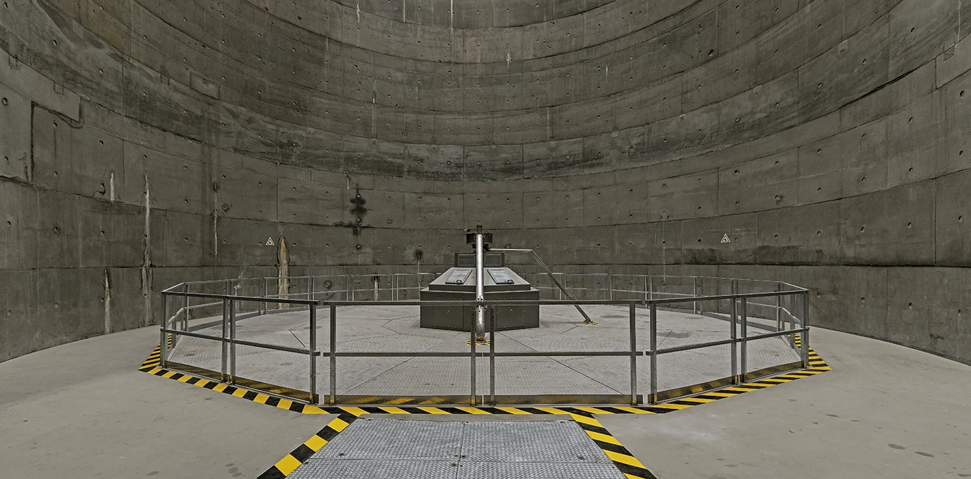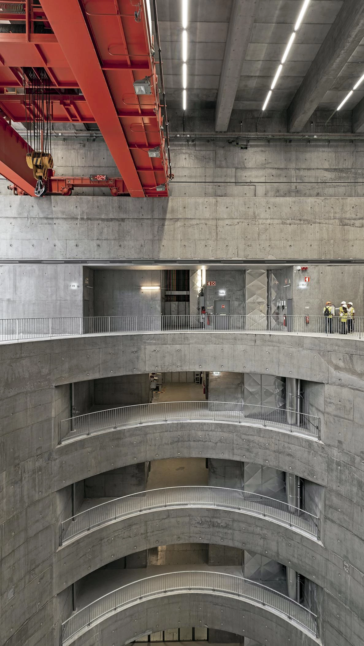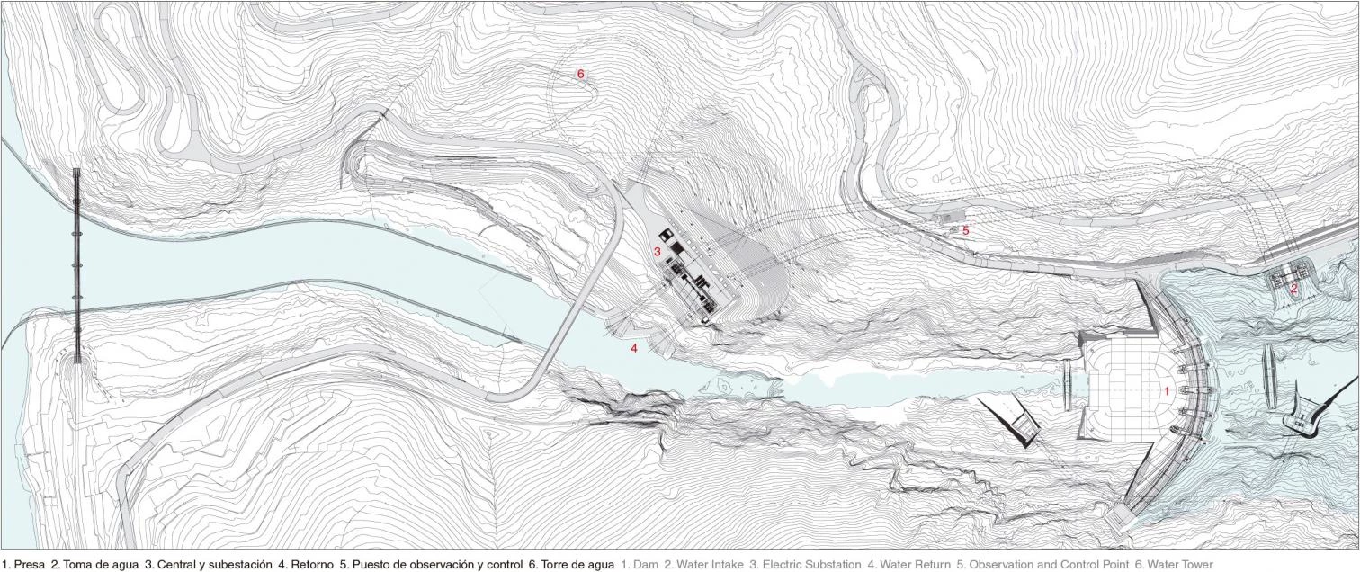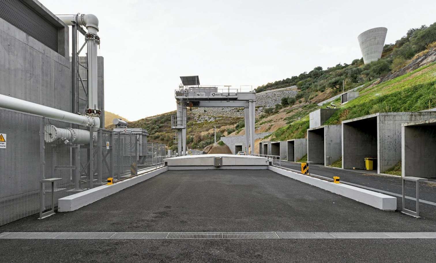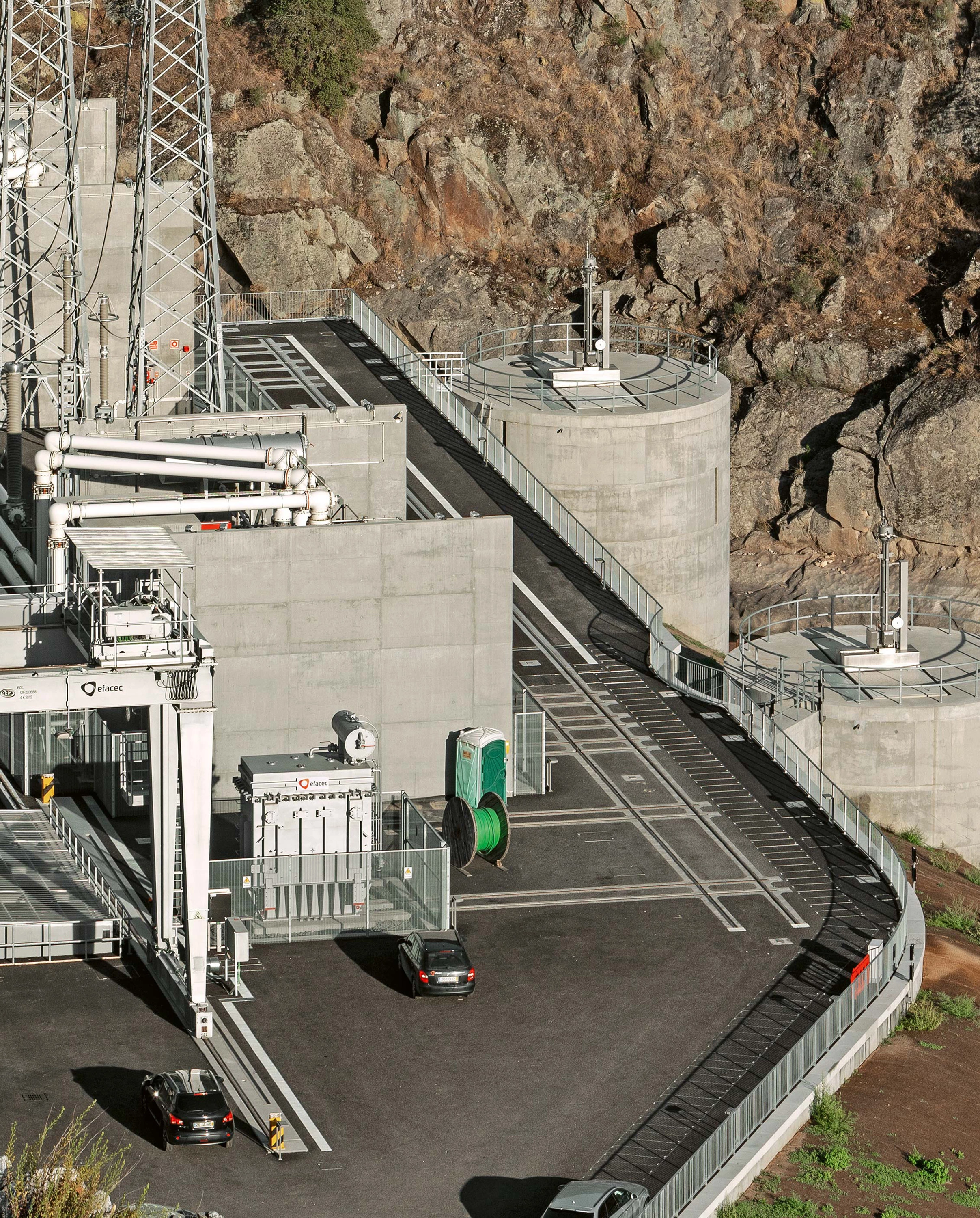 Una plataforma de hormigón cubre el atrio soterrado y los dos pozos donde se sitúan los sistemas reversibles de turbina-bombeo. Sobre ella, se agrupan una serie de maquinarias que debían estar obligatoriamente al aire libre —un puente-grúa móvil, transformadores de energía y un pórtico de línea— y que confieren el aspecto industrial al conjunto. Dicha plataforma, de 36 metros de ancho, obligó a realizar un desmonte en la montaña con una inclinación de 45º. Para que el resultado final fuese lo más natural posible no se usaron muros de hormigón para contener el terreno, sino que se optó por cortar la roca y revestirla con una red metálica prácticamente imperceptible. A lo largo de la pendiente, se excavan una serie de agujeros de un metro de profundidad para plantar olivos y restituir así la vegetación autóctona. En la base de la montaña, un edificio técnico con forma escalonada se oculta bajo tierra en continuidad con el perfil de la ladera, dejando visible tan sólo una serie de cajones de hormigón con los accesos y las salidas de ventilación.