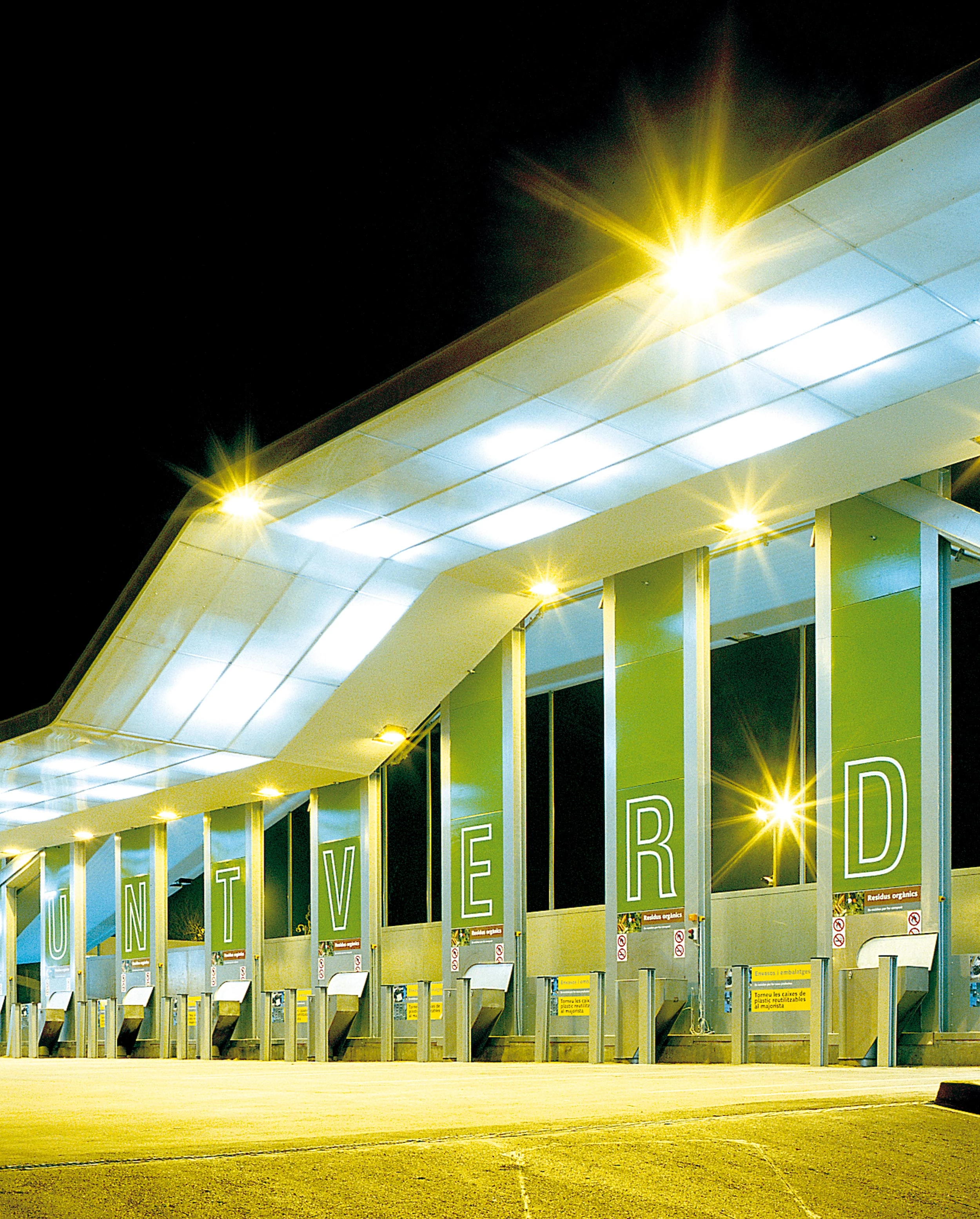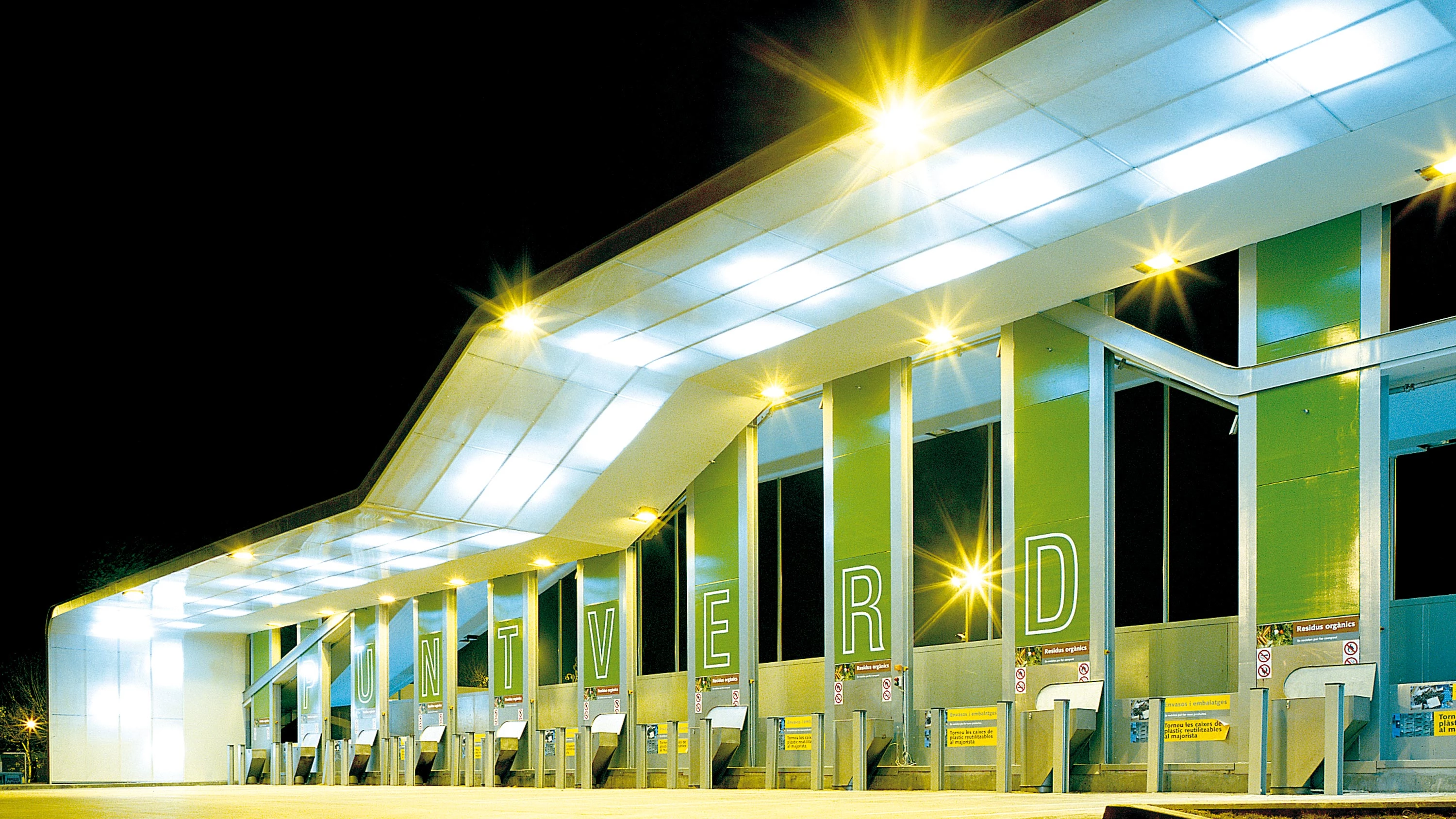 Con una imagen de montaña rusa, la estructura arquitectónica reproduce el movimiento del circuito de residuos. La gran marquesina que cubre la playa de maniobras y el subsuelo industrial protege asimismo las cintas transportadoras; su superficie se separa en dos partes de distinto tamaño: la mayor correspondiente a la zona de descarga, y la menor al movimiento de los materiales. Es éste un modelo de planta de reciclaje que combina los dos grandes tipos de vertidos, orgánicos e inorgánicos, y su funcionamiento organiza el tráfico de vehículos por toda la planta. Los pliegues, en dos piezas, sugieren la actividad en subidas y descensos sincopados. La estructura, en cambio, es todo lo contrario: el gran pórtico del muelle de carga oculta el verdadero armazón del edificio en su centro, y aparenta distribuir en los llenos y vacíos —incluso de las letras como banderolas en un museo— los dos tipos de vertidos, aunque en realidad son los pilares de todo el conjunto, que trabaja con voladizos de 6 metros a un lado y 4 metros a otro. El esqueleto se cubre con planchas metálicas lacadas o de acero inoxidable en el exterior de los módulos estructurales, y placas de pladur y policarbonato translúcido en el interior de la cubierta, con la intención declarada de convertir el edificio en una suerte de gráfico de colores verde y plata, con letras blancas... [+]