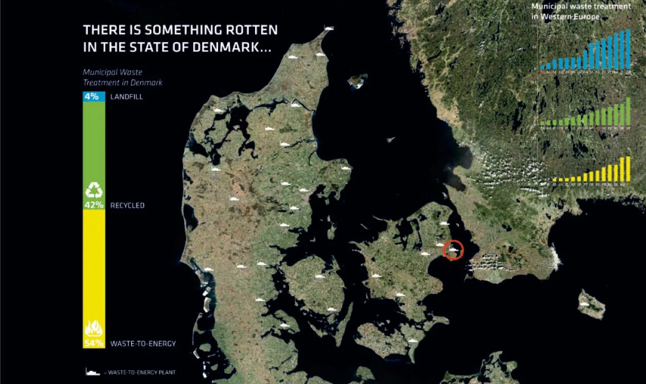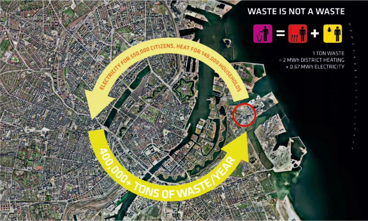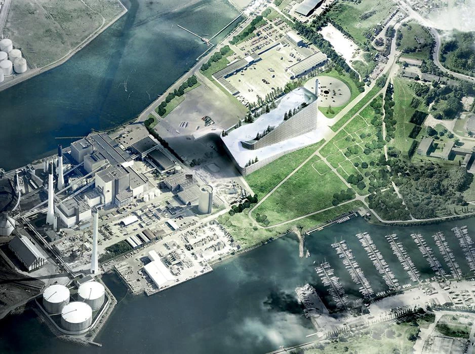 Situada en una zona industrial cerca del centro de la ciudad, la nueva planta de tratamiento de residuos se convierte en un modelo ejemplar en el campo de la gestión de residuos y producción de energía, así como en un punto de referencia en el paisaje urbano de Copenhague. Se trata de la mayor iniciativa medioambiental en Dinamarca que sustituye a la obsoleta planta Amagerforbraending adyacente. El nuevo complejo comprende una planta de incineración, una planta de separación y un edificio de administración y servicios que combinan estrategias de sostenibilidad con otras de concienciación como la chimenea, que produce un aro visible de humo por cada tonelada de dióxido de carbono que la planta emite a la atmósfera.
