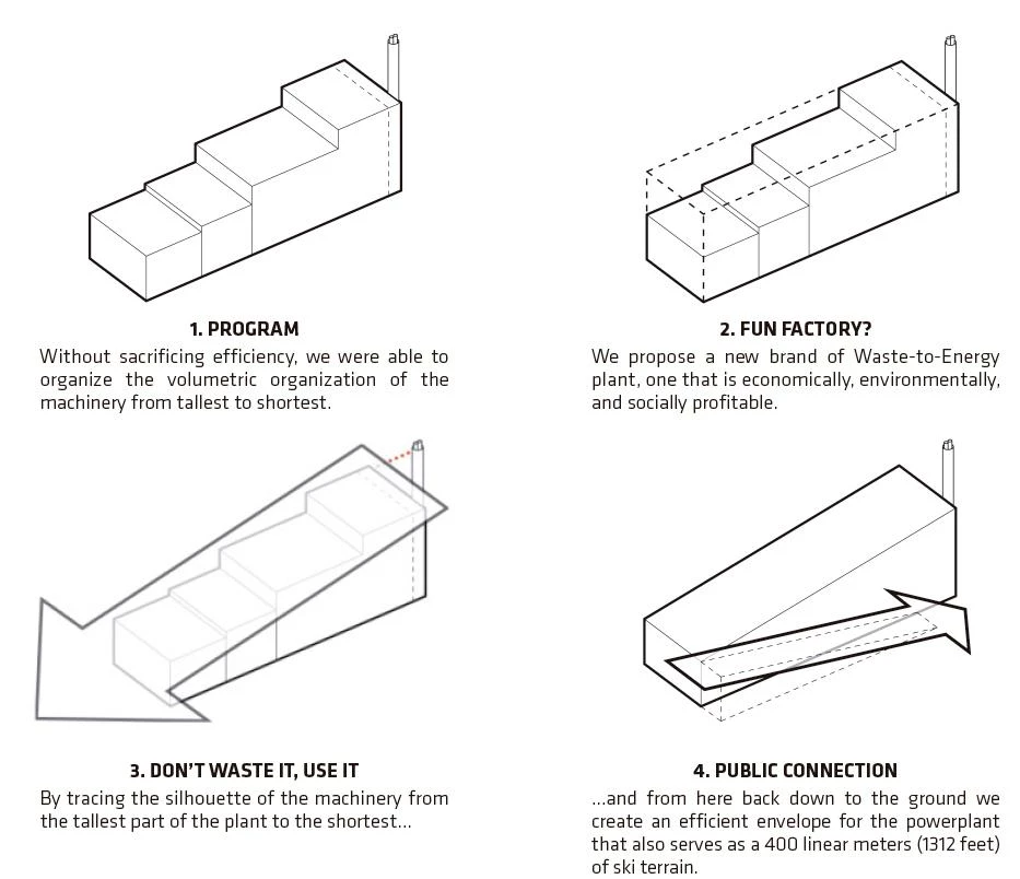 El proyecto refleja una visión innovadora de un nuevo tipo de planta de tratamiento de residuos económica, ambiental y socialmente rentable que se concibe como un destino en sí mismo. En lugar de considerarla como un objeto aislado, se intensifica la relación entre el edificio industrial y la ciudad mediante la ampliación de las actividades de ocio existentes en la zona. Además se genera, a modo de montaña artificial, una plataforma para practicar esquí de 31.000 metros cuadrados con diferentes niveles de dificultad.