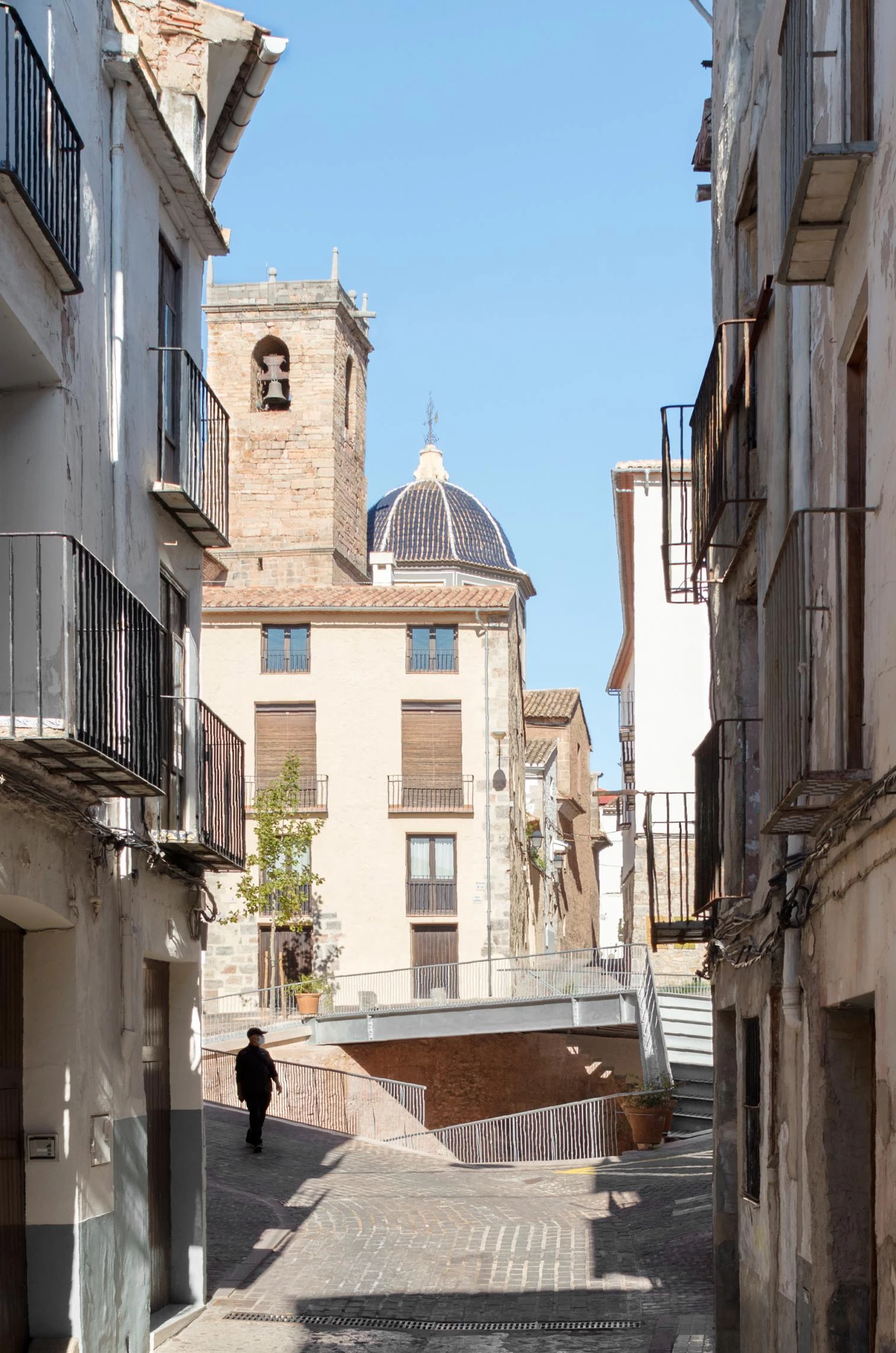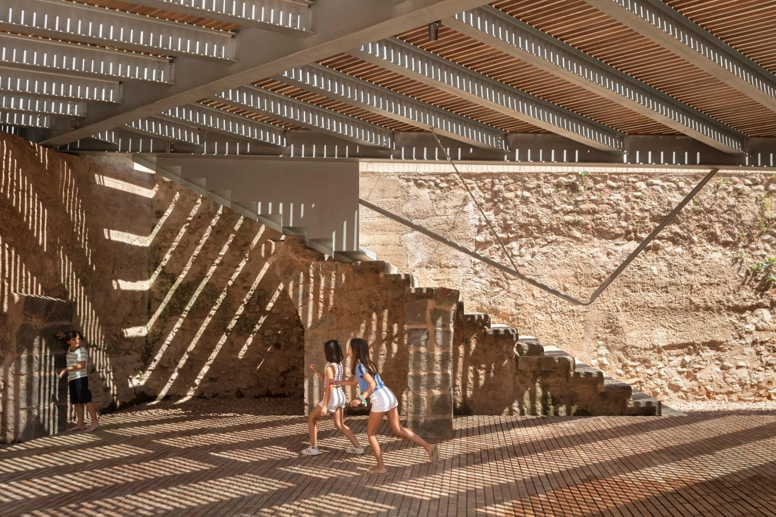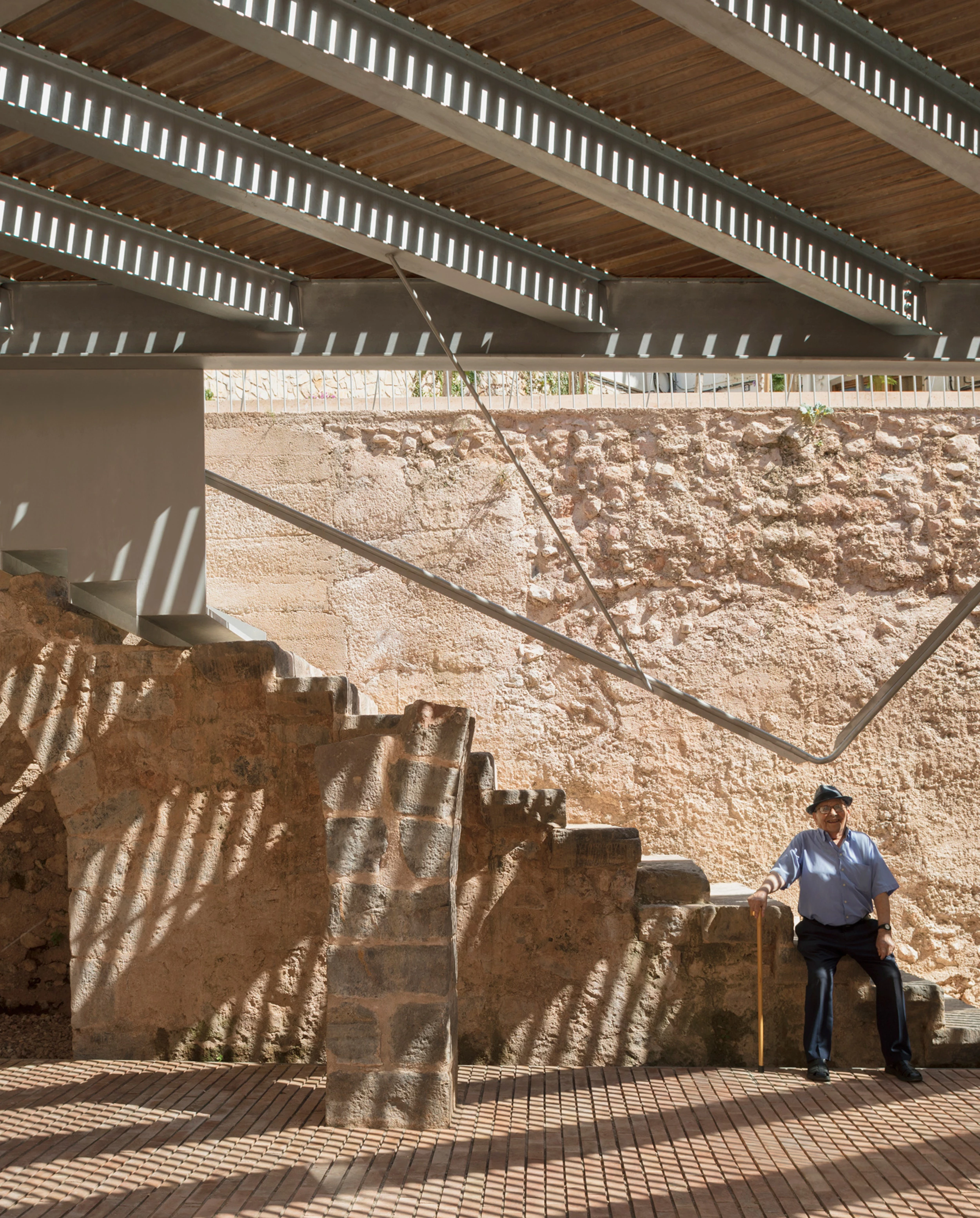 Esta intervención en el casco antiguo de la ciudad de Onda, perteneciente a la comarca valenciana de la Plana Baja, busca poner en valor una serie de hallazgos arqueológicos —los más antiguos de época andalusí—, así como conectar los diferentes niveles de la plaza de la Sinagoga con las calles aledañas. Fruto de la colaboración entre las firmas El Fabricante de Espheras, Grupo Aranea y Cel-Ras Arquitectura, el proyecto de regeneración urbana incluye rampas suaves y peldaños reducidos para facilitar los desplazamientos diarios de los peatones. Una plataforma que sobrevuela marca la altura original de las arcadas interiores del recinto arqueológico y recupera el recorrido histórico hacia la calle Valencia. Sostenida por micropilotes, esta estructura de acero con listones de madera salva los cambios de altura mediante unas pequeñas gradas que sirven de asiento.