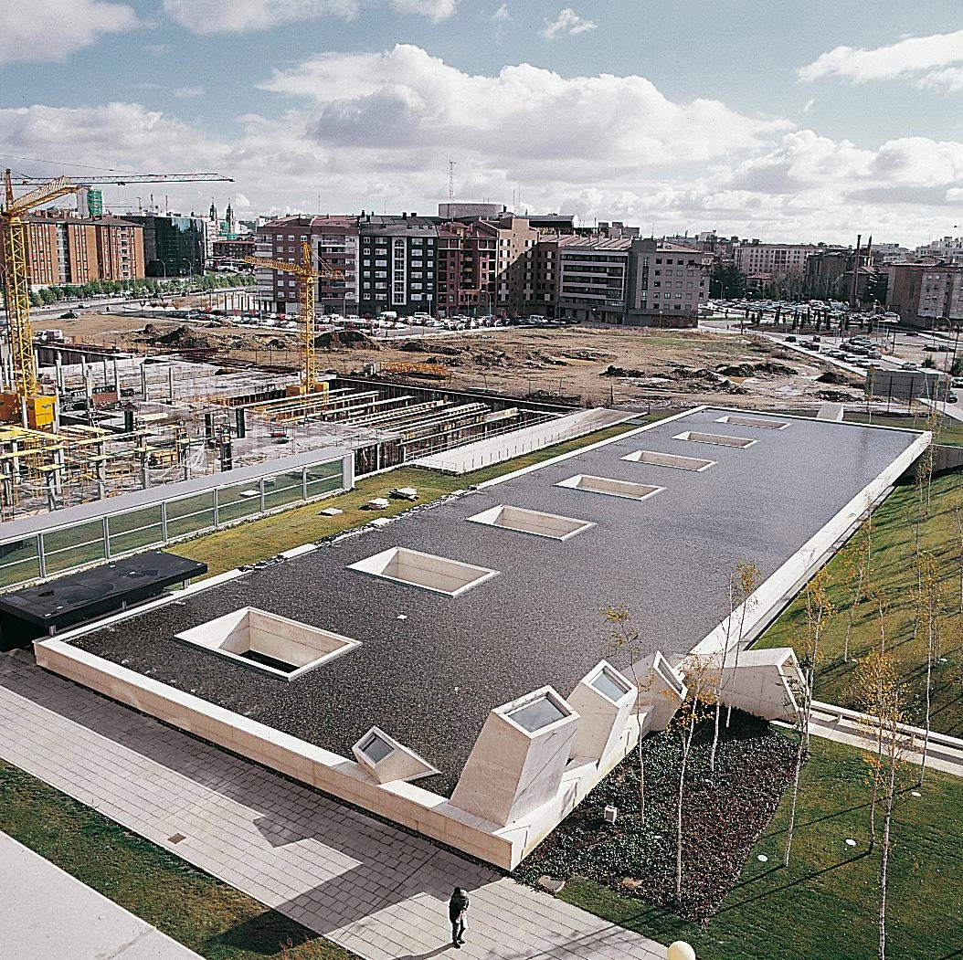 Situado junto a un barrio residencial formado por bloques abiertos de reciente construcción, el solar elegido para levantar el tanatorio municipal de León no parecía en principio el más apropiado para albergar tales usos. Por tanto, crear un entorno propio, digno de la función albergada, y desdibujar la presencia de este edificio funerario desde las viviendas vecinas se convirtió en el principal objetivo del proyecto, cuya configuración prolonga el parque lineal que acompaña el cauce del río Bernesga por toda la ciudad.