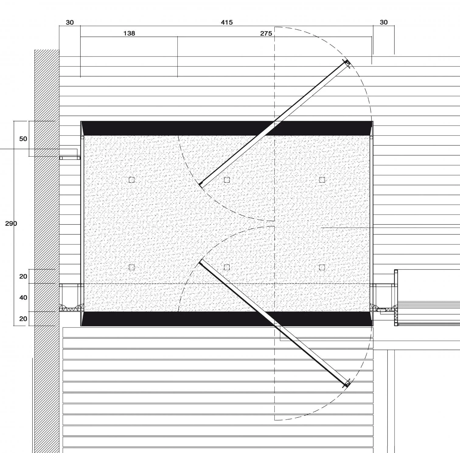 Sobre este ámbito prácticamente carente de alzados convencionales, la cubierta se convierte en la verdadera fachada del tanatorio: un plano para sustestar la lámina de agua propuesta como espejo del cielo que integra la edificación en el parque, deshaciendo en reflejos el volumen construido. Como los dedos de una mano, cinco lucernarios oblicuos emergen del estanque superior para iluminar el oratorio de la capilla que está situada junto a la entrada. En la zona central del edificio, siete patios perforan la construcción con pequeños estanques de agua para iluminar las salas de velatorios con una luz tamizada, preservando su interior de las miradas ajenas. Esta franja central separa el vestíbulo de la zona de administración y servicios, situada en la parte posterior y dotada de un acceso rodado propio; esta rampa desciende también hasta el sótano ubicado bajo el nivel principal del tanatorio.
