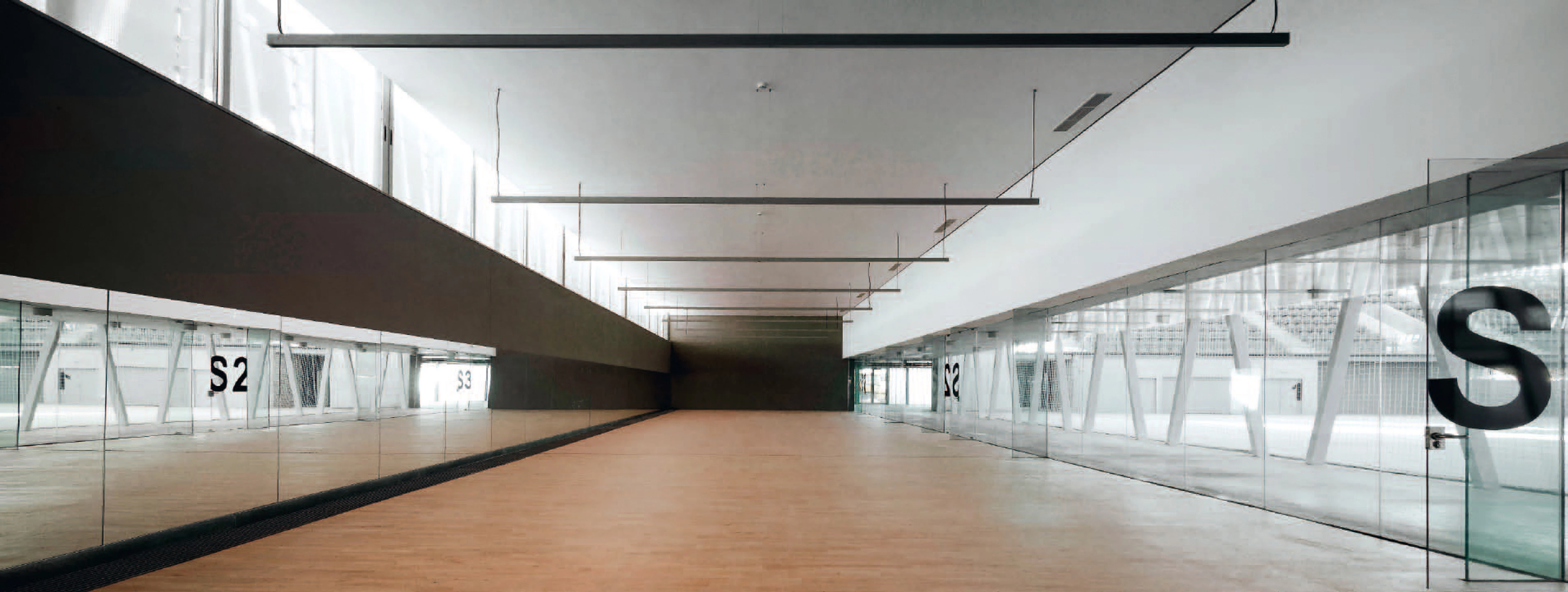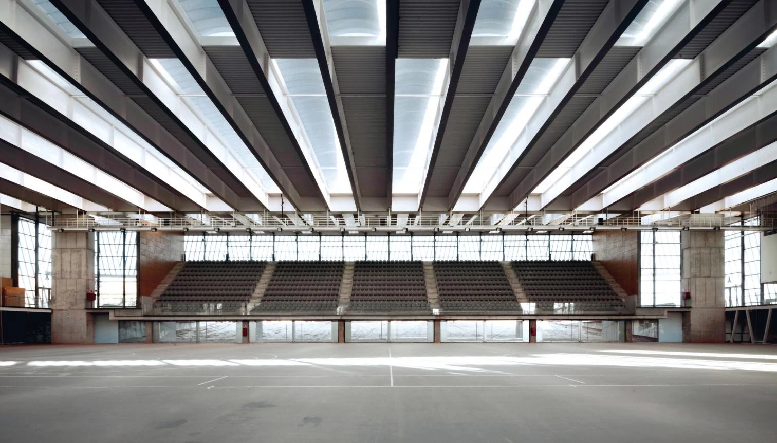 El carácter prefabricado y repetitivo de los elementos constructivos de la cubierta se oculta mediante un cerramiento que alterna los paños transparentes y opacos, e ilumina el pabellón de forma cenital e indirecta.