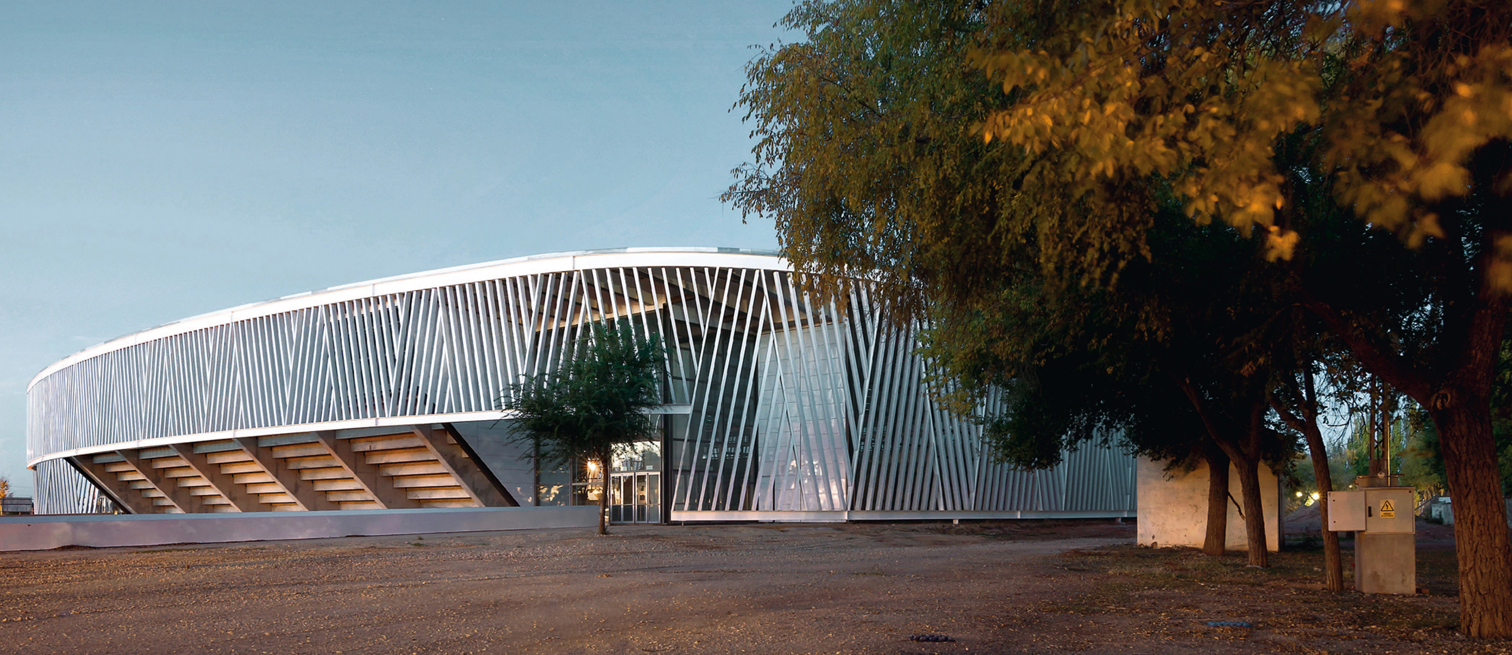 Construidos de forma independiente, los graderíos se elevan sobre una serie de ménsulas de hormigón que liberan la planta baja. En el lado orientado hacia el Este, el zócalo bajo los asientos se cierra con paneles de vidrio, estableciendo una conexión visual entre la pista y el exterior, mientras que en el lado Oeste, el área entre las costillas estructurales se destina a salas de servicio, instalaciones y vestuarios. Gracias al corte en el terreno, el espacio central puede usarse en continuidad con los taludes vegetales, fomentando la flexibilidad funcional, diferenciando las circulaciones y generando accesos a distintos niveles. El resultado es una arquitectura permeable, con capacidad para albergar una gran variedad de eventos, que pone en valor la vocación pública y colectiva del conjunto.