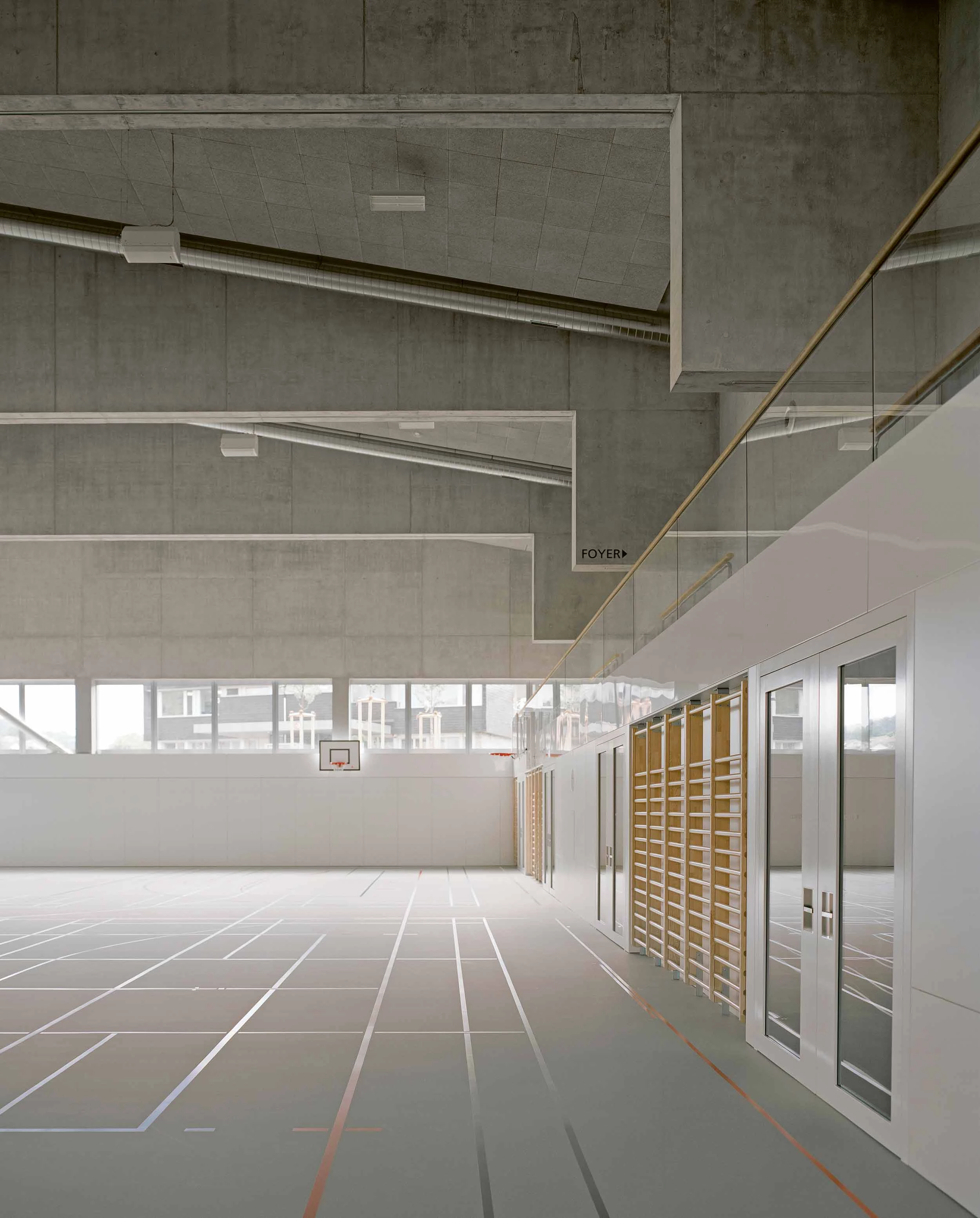 Formado por un conjunto de edificaciones dispersas dispuestas en paralelo a la suave pendiente del solar, el complejo escolar existente fue diseñado por Hans von Meyenburg y construido entre 1954 y 1956. Como punto de partida del proyecto se analizaron tantos los edificios originales, catalogados y protegidos, como sus sucesivas ampliaciones. Como resultado de dicho estudio, se propuso la división en dos partes del programa: un gimnasio que también debía contar con salas adicionales para fines educativos. Estos espacios complementarios y los deportivos se separan deliberadamente en dos construcciones diferenciadas. Por un lado, el ala escolar existente se amplía de manera sobria y eficiente para albergar esos espacios docentes adicionales. Enlazando de esta forma con la idea original del propio Von Meyenburg, quien concibió el campus como un organismo en continuo crecimiento, en línea con los ideales estructuralistas del momento. Por otro lado, la construcción del nuevo pabellón deportivo supuso la reconfiguración espacial del patio, rodeado ahora por construcciones, y convertido en el centro del complejo. El gimnasio, a pesar de los exigentes requisitos técnicos y espaciales, se mimetiza con naturalidad en el complejo escolar de pequeña escala, alineando la altura y la geometría a dos aguas de su cubierta con las de las preexistencias. En el interior, alrededor del espacio principal semiexcavado en el terreno, se colocaron a intervalos regulares columnas arriostradas que soportan las cargas de la vigas de hormigón. A modo de balcón, una grada estrecha de dos niveles rodea las pistas, que quedan flanqueadas por espacios auxiliares dispuestos en la fachada sur...[+]