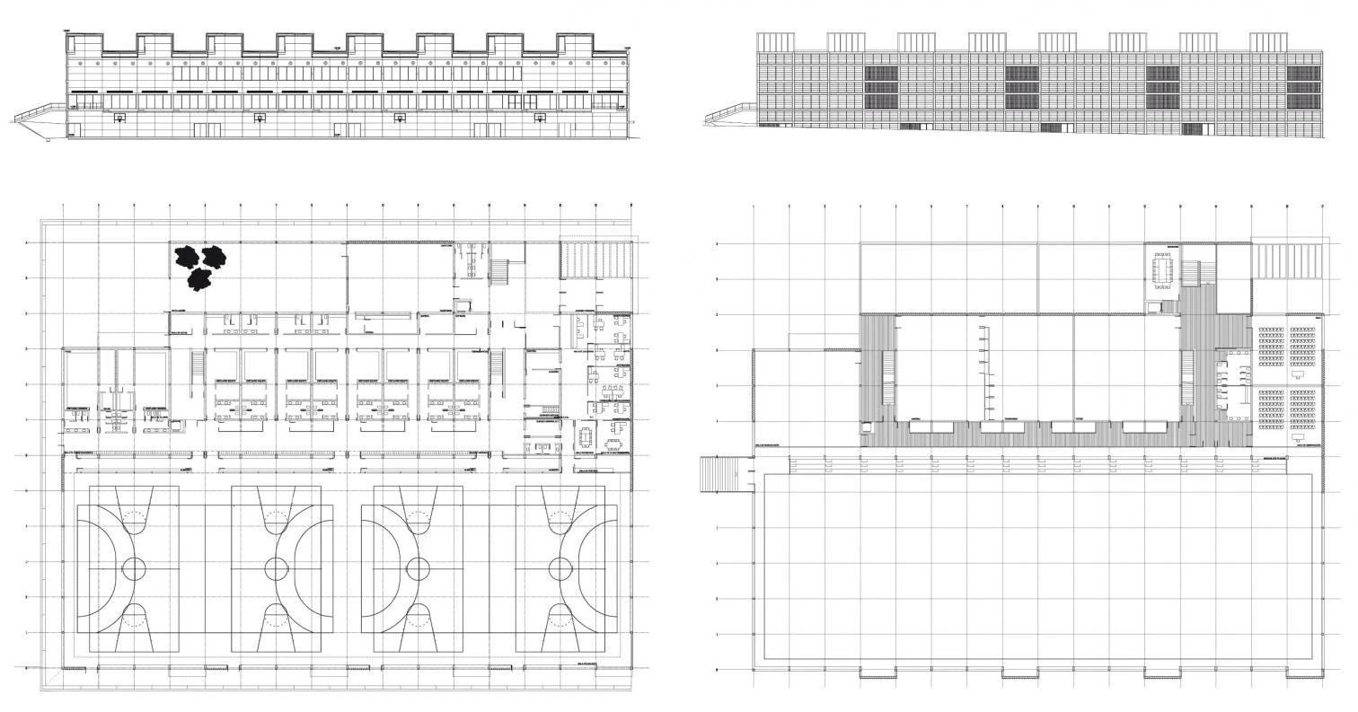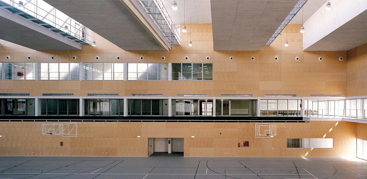 La nueva construcción ocupa toda la extensión de la parcela, soterrándose en la huella ataluzada producida por el desnivel natural del terreno. A partir de un esquema funcional que divide el programa en franjas longitudinales, los distintos espacios se disponen en tres módulos alargados que revelan su presencia al exterior con alturas diferentes. Hacia el sur y en la cara más alejada del bulevar central se sitúa la gran sala deportiva, con un interior que combina la entrada puntual de luz a través de huecos de tamaños diferentes con una pasarela continua a media altura que abraza todo el espacio, recogiendo en su recorrido el graderío. La banda central se dispone en tres alturas: la primera alberga vestuarios y despachos; la segunda, salas para taekwondo, aerobic y musculación; y la tercera, una pieza longitudinal y orientada al norte para la práctica de esgrima. Al nivel de calle la banda más septentrional acoge el acceso principal —provisto de una gran marquesina metálica— y la cafetería.