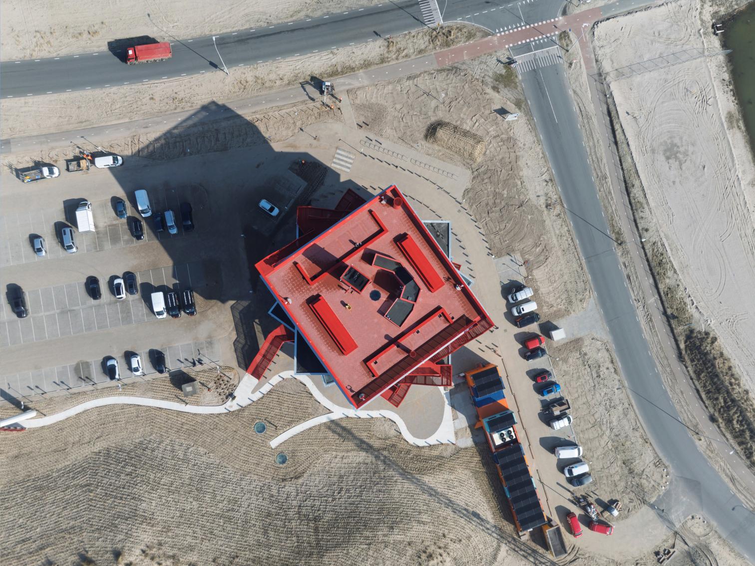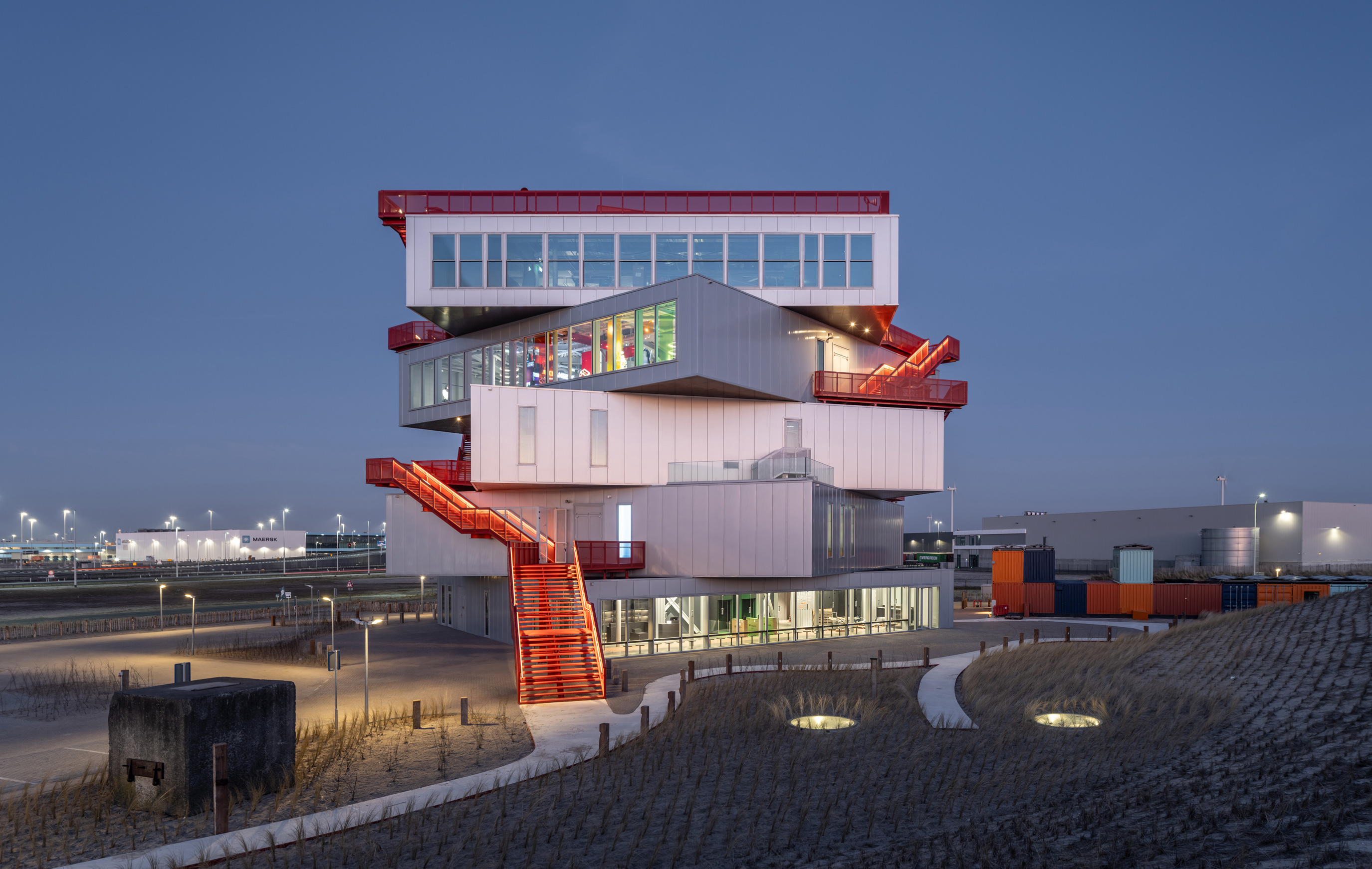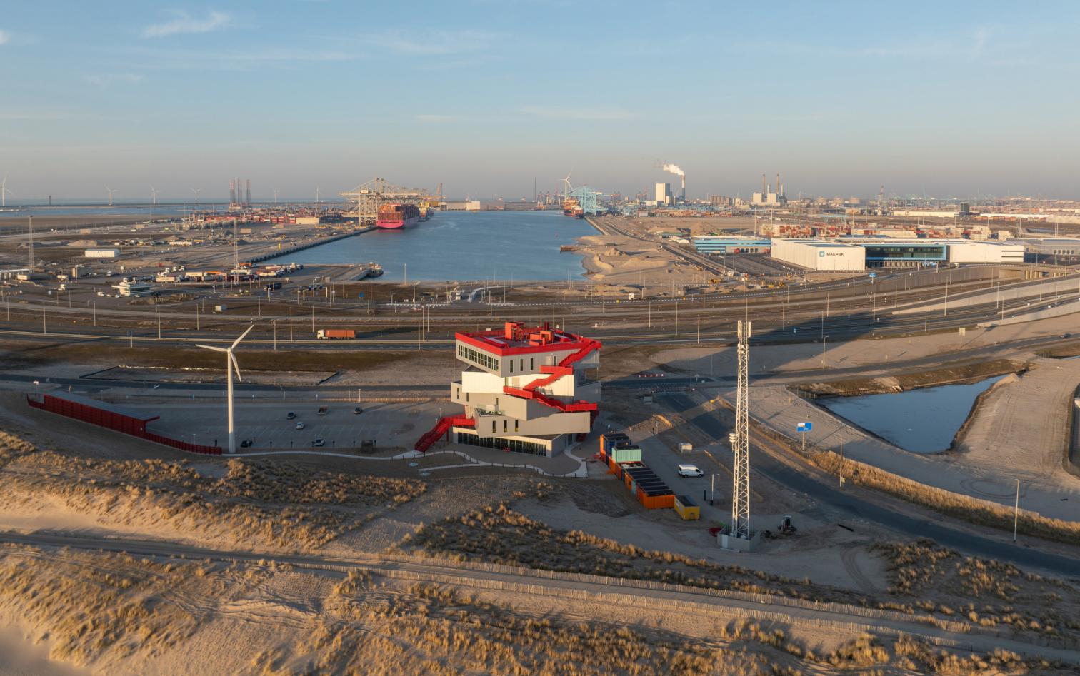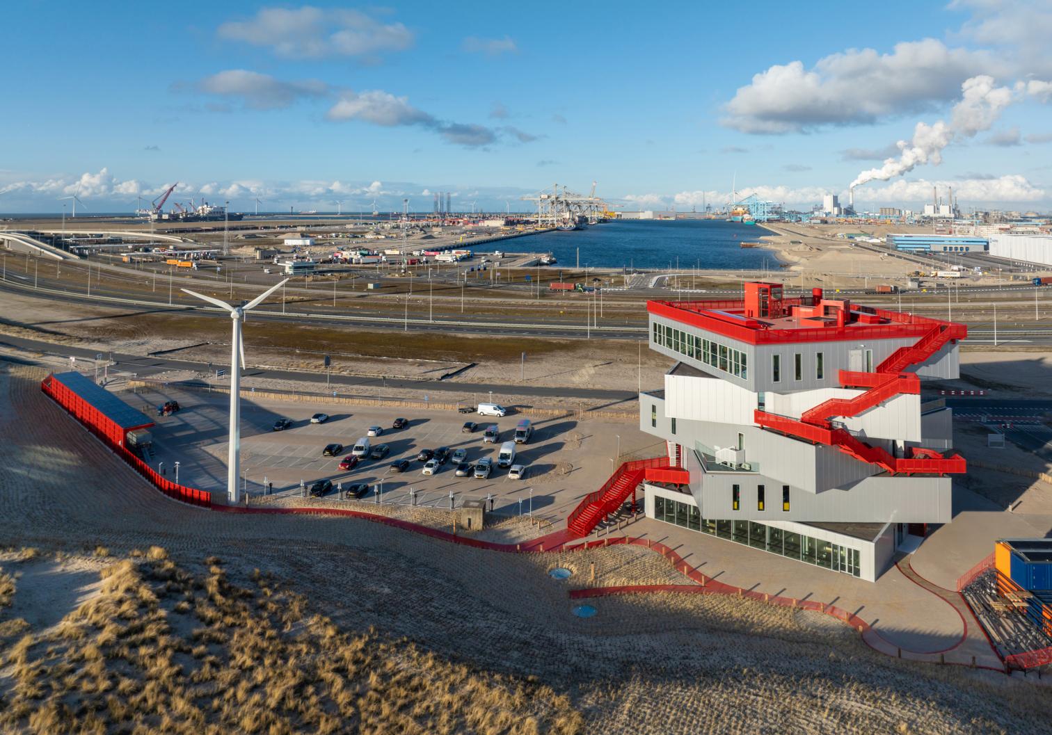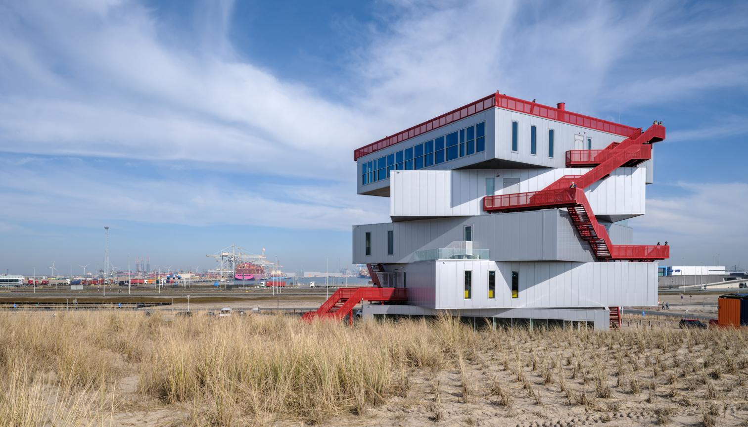 Encargado por la Autoridad Portuaria de Róterdam, el centro de exposiciones Portlantis permite conocer la compleja actividad del puerto en la ciudad neerlandesa. Inaugurado recientemente, el edificio con 3.533 metros cuadrados está compuesto por cinco bloques rotados y apilados, que además de su función expositiva y áreas públicas, que contienen un restaurante y una cafetería, sirven como una torre de observación. La estructura es desmontable, lo que permitiría la reutilización de sus componentes.