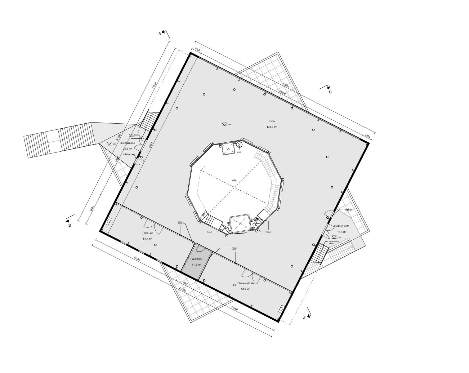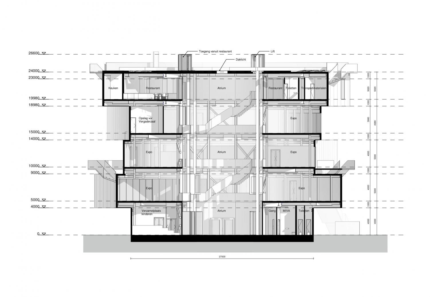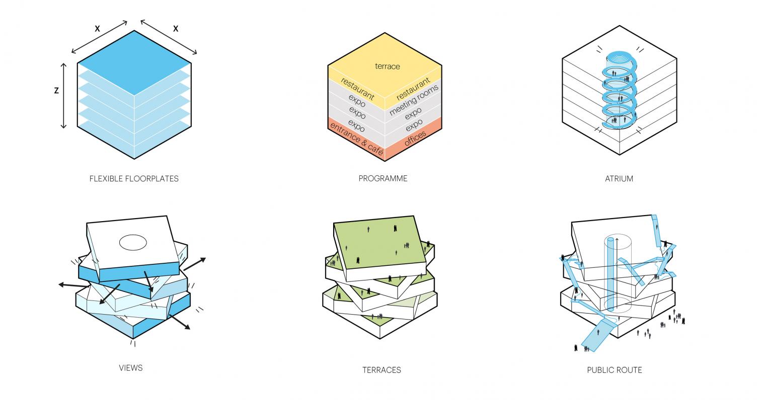 El interior se organiza alrededor de dicho atrio con 22 metros de altura, que recorre las cinco plantas y alberga una escultura cinética. Según MVRDV, el centro de exposiciones genera un 30 % más de energía de la que consume. Su diseño incorpora un aislamiento eficiente y una bomba de calor, que contribuyen a reducir su consumo energético