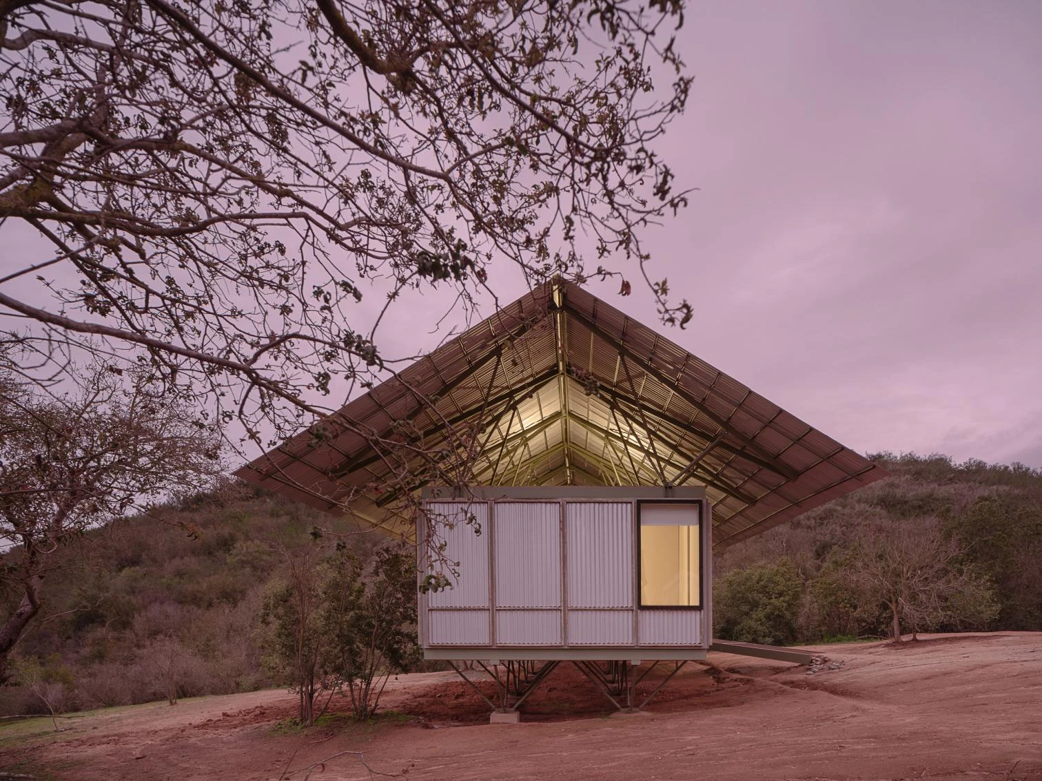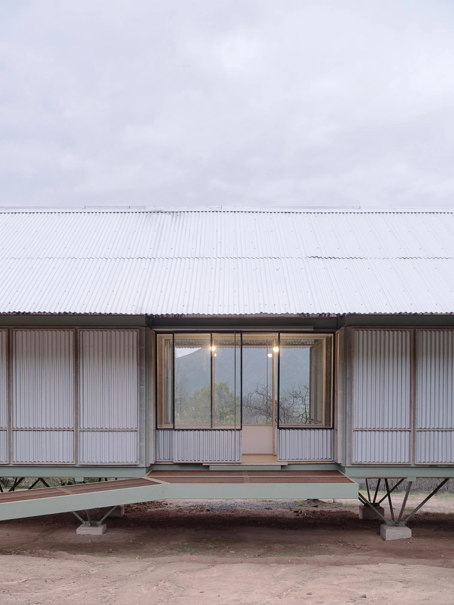 En Casablanca, una comuna del litoral central de Chile perteneciente a la provincia y región de Valparaíso, se sitúa esta casa de 85 metros cuadrados. Con una cubierta a dos aguas, el prototipo elevado sobre el nivel del suelo presenta una estructura metálica simple, liviana y resistente. Se disponen unidades ancladas con cuñas, revestimientos interiores de madera laminada y paneles exteriores metálicos corrugados.