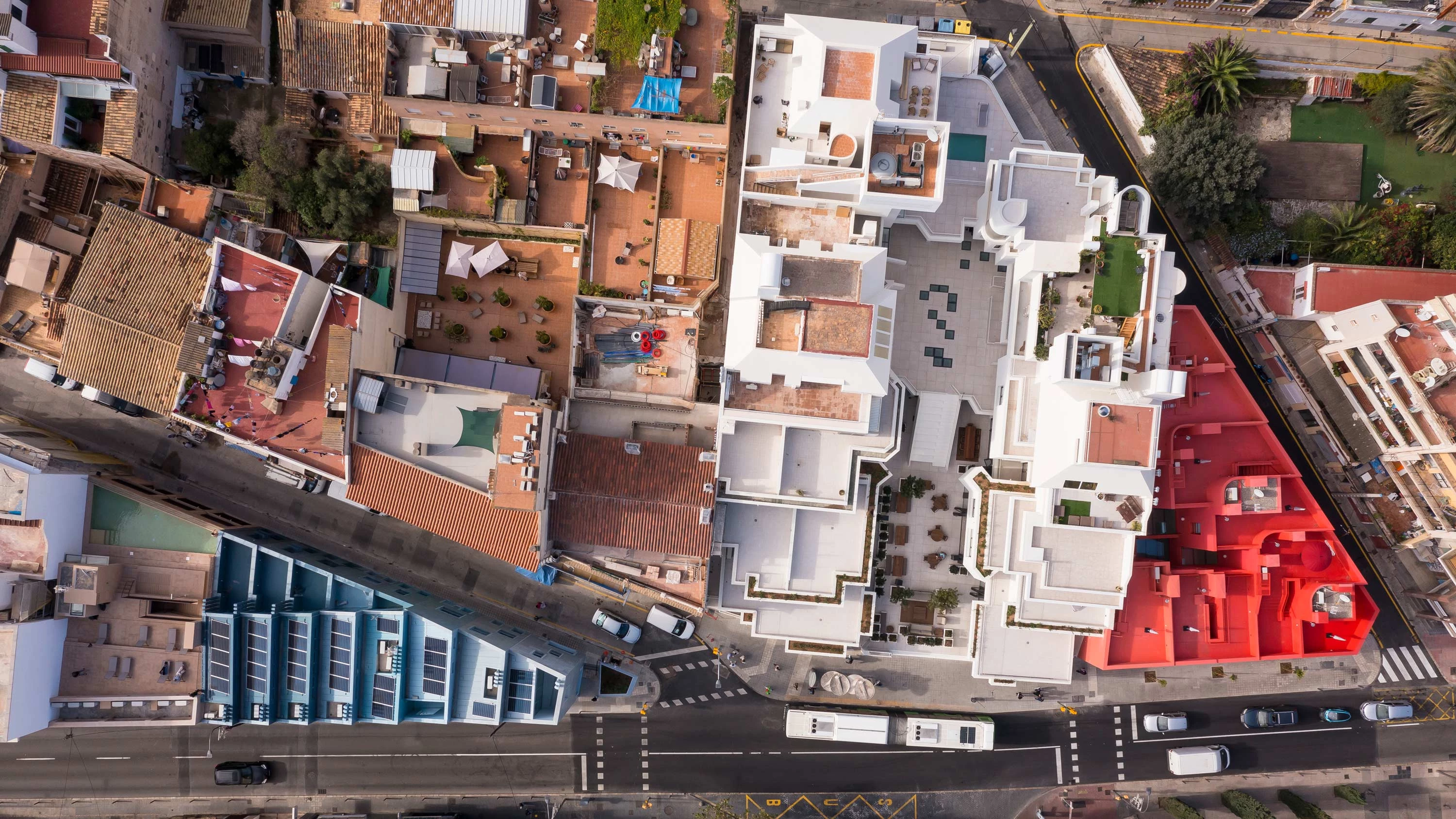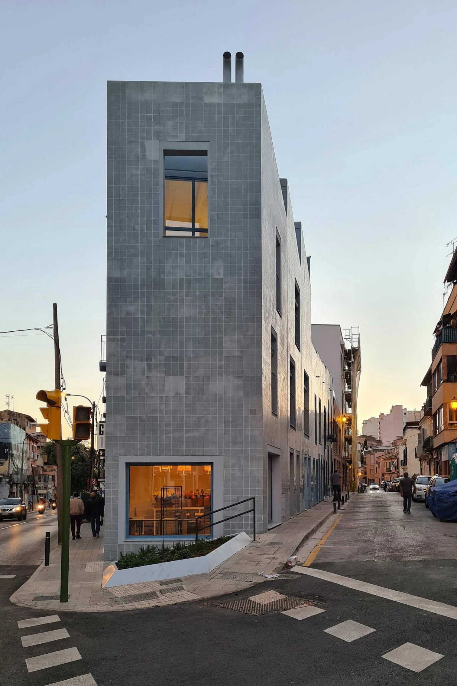 Por último, al otro lado de la calle, en la misma plaza Gomila, se encuentra el edificio La Plaza, una transformación de un edificio existente que alberga una restitución del histórico bar Bellver, oficinas y una azotea comunitaria con vistas a la bahía y la catedral. El color verde y la textura de la fachada conectan con el arbolado existente en la plaza.