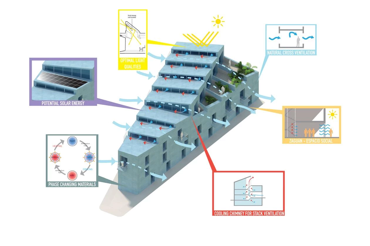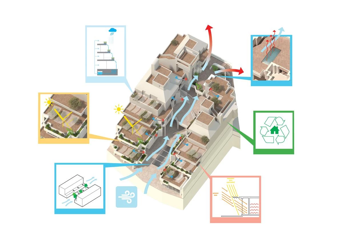 Los edificios se han proyectado para minimizar el consumo energético cumpliendo los criterios de confort del Passive House Institute. El conjunto se complementa con una instalación fotovoltaica de autoconsumo energético.