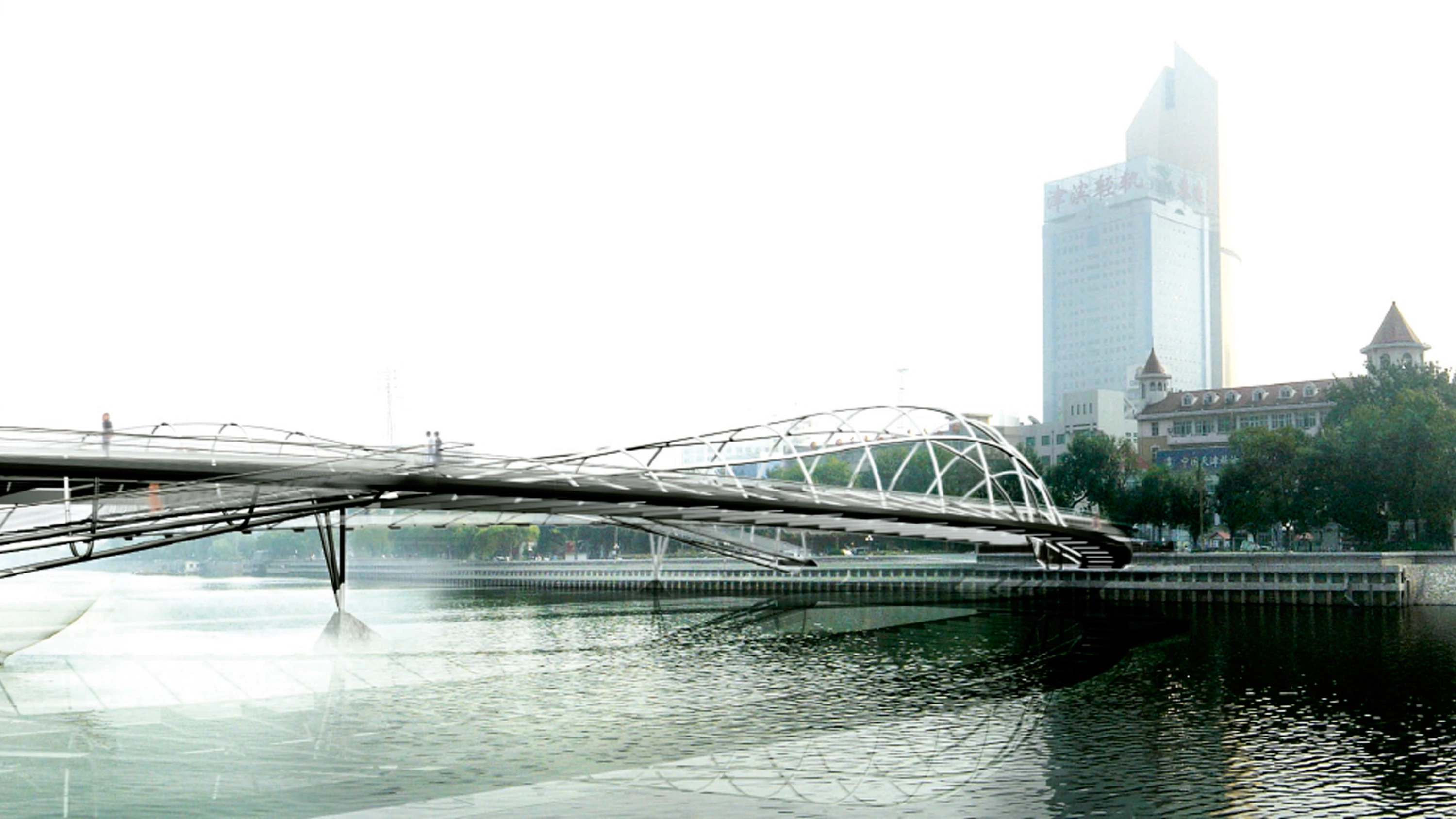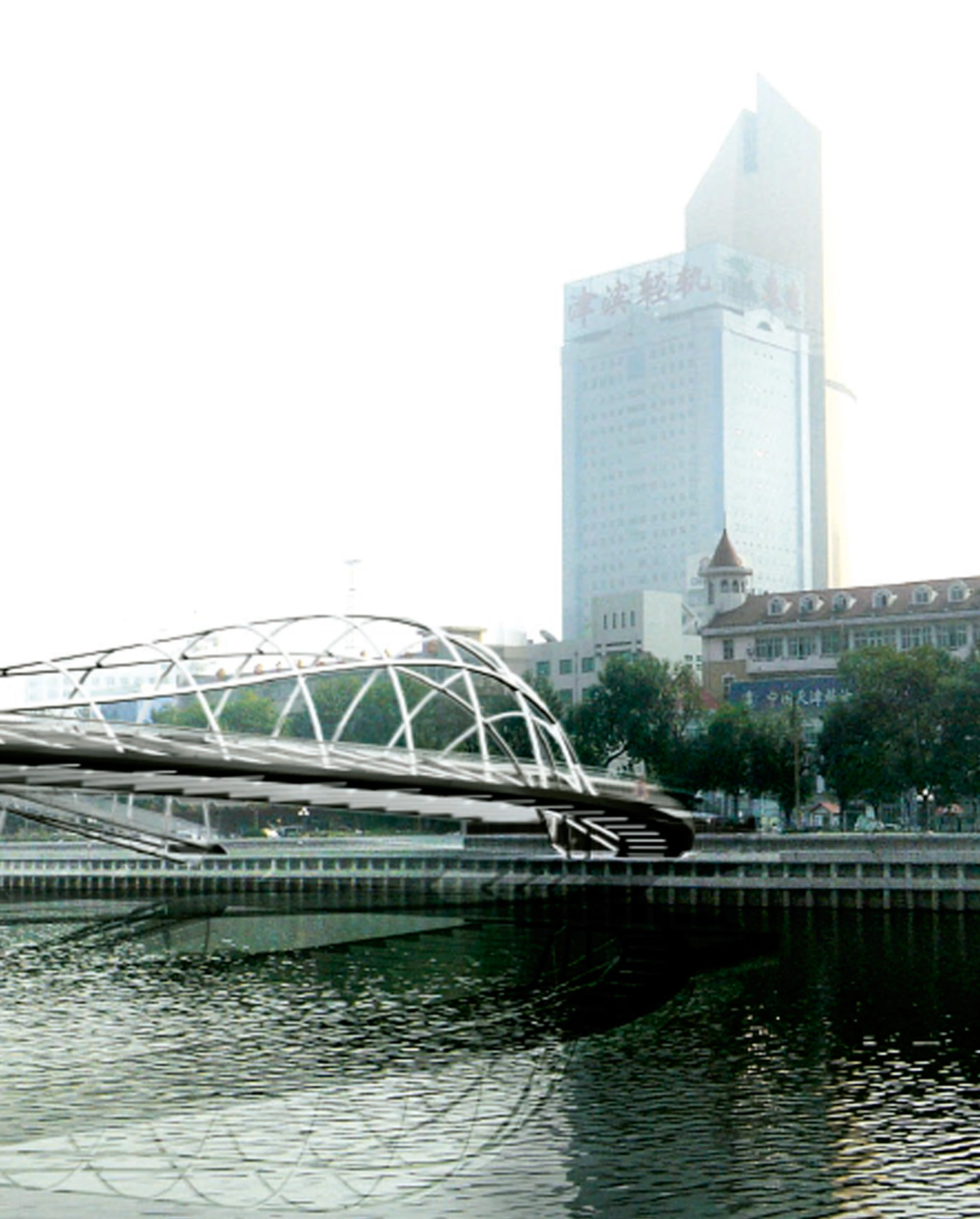 Con el objetivo de recuperar la presencia del río Haihe en el centro de la ciudad de Tianjin se ha emprendido la construcción de una serie de puentes que permitirán la circulación del tráfico y de los peatones entre las dos riberas del río. Por este motivo, en lugar de volar por encima del lecho fluvial, el nuevo puente Bengbu se ancla a sus orillas, estableciendo una continuidad orgánica con la ribera. Como si fueran esbeltos artrópodos metálicos, dos ligeras pasarelas asimétricamente dispuestas se añaden a la autopista central permitiendo a los peatones atravesar el río a distinto nivel que el tráfico y la generación de una duplicidad de trayectos. La estructura resulta, a pesar de su complejidad geométrica y gracias a la utilización del ordenador, de una gran sencillez y ligereza. Un único soporte situado en el interior del cauce basta para salvar la gran distancia entre la orilla y la parte central correspondiente a la autopista.