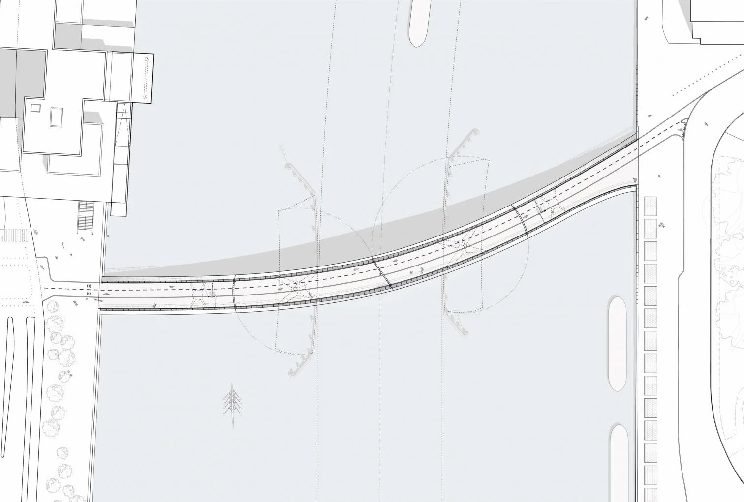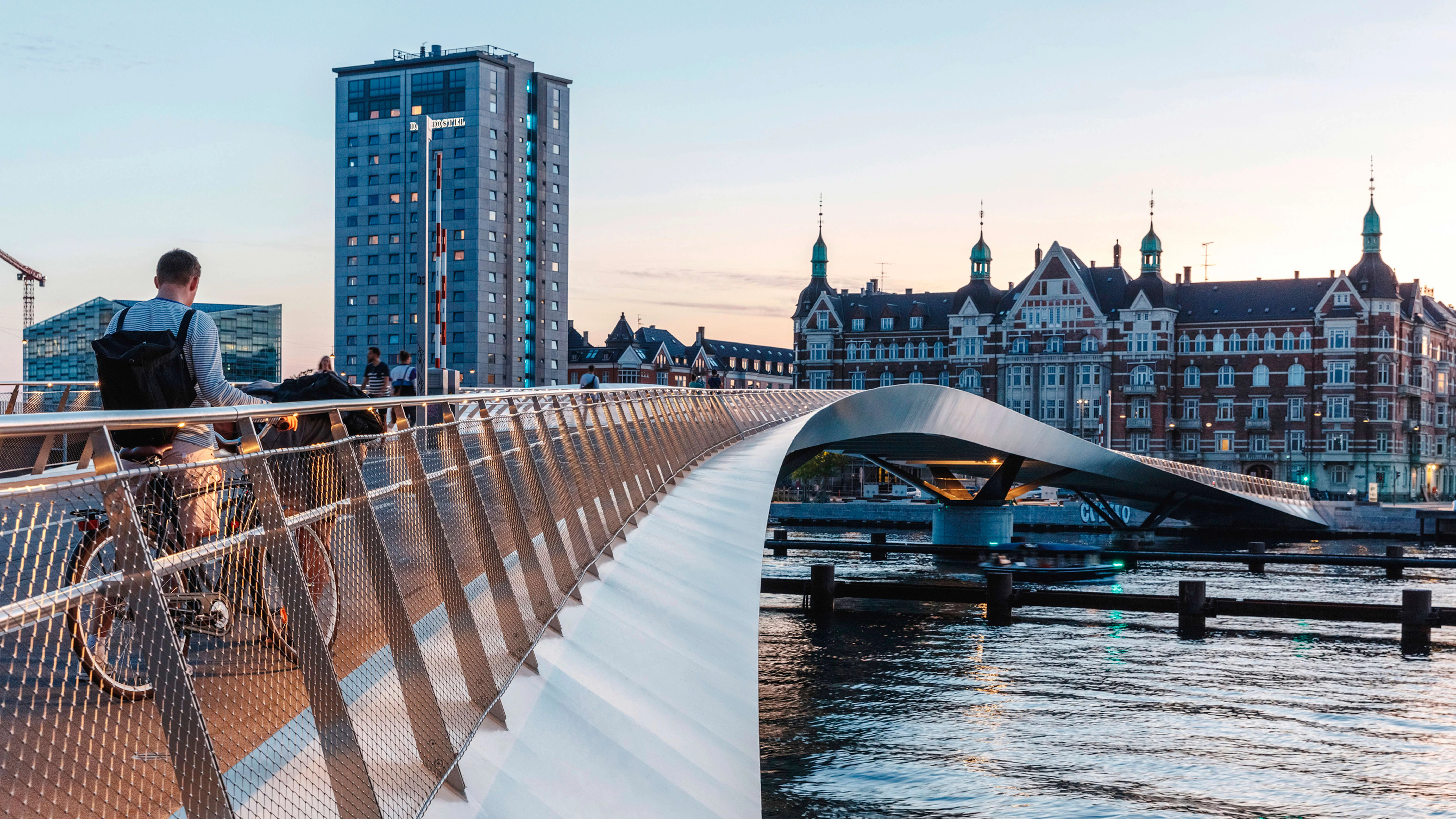 Esta pasarela de 160 metros de longitud, destinada a ciclistas y peatones, forma parte del plan para revitalizar una parte del puerto de la capital danesa infrautilizada durante décadas. Construido junto al edificio BLOX de OMA, el puente permite el tráfico marítimo mediante dos secciones giratorias que, al no levantarse, utilizan menos energía para operar. Los contornos de la pasarela están perfilados por líneas que giran desde la vertical hasta la horizontal, movimiento dinámico combinado con la forma de la planta curva.