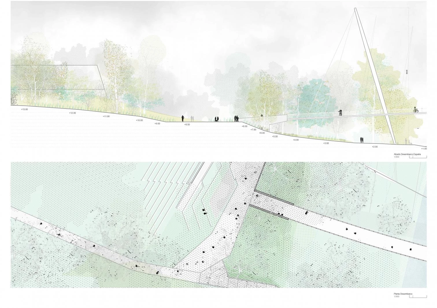 Sin superar una pendiente del 5%, un trazado curvo en planta, que se adecua mejor a la llegada de la pasarela en ambas márgenes, respeta el gálibo de 6.44 m en las orillas y alcanza un máximo de 13 en un desarrollo de 300 m de longitud. De esta manera, la gran mayoría de los barcos de vela de los clubs náuticos de Tuy y A Guarda pueden cruzarlo.