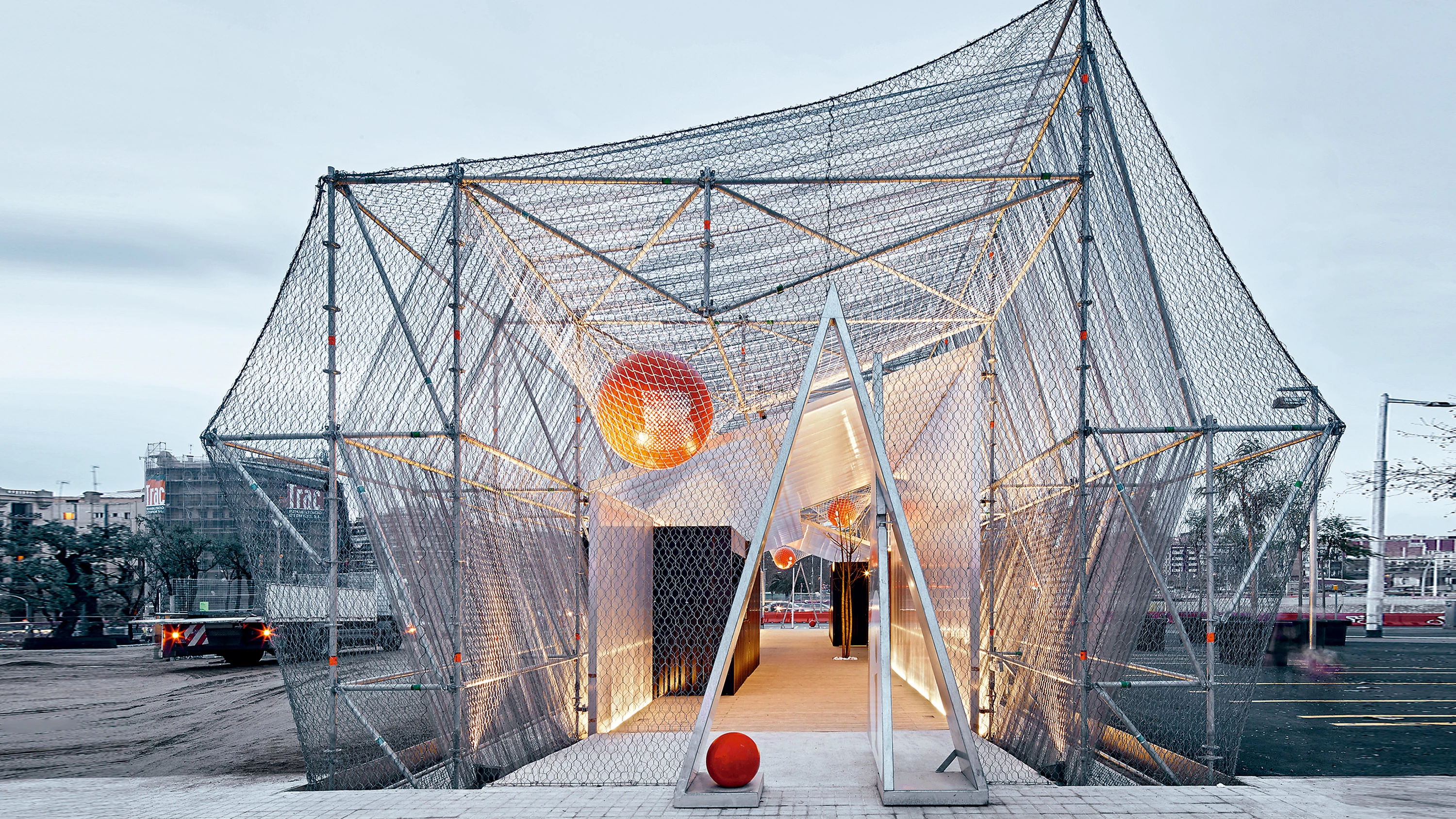 El pabellón temporal, de 300m², forma parte de la urbanización provisional de la plaza de las Glorias, y apuesta por un sistema de andamiaje desmontable y reutilizable rodeado por una triple piel de policarbonato, malla de sombreo y malla metálica. Cuenta con zona de exposiciones y oficina de alquiler de bicis eléctricas...[+]