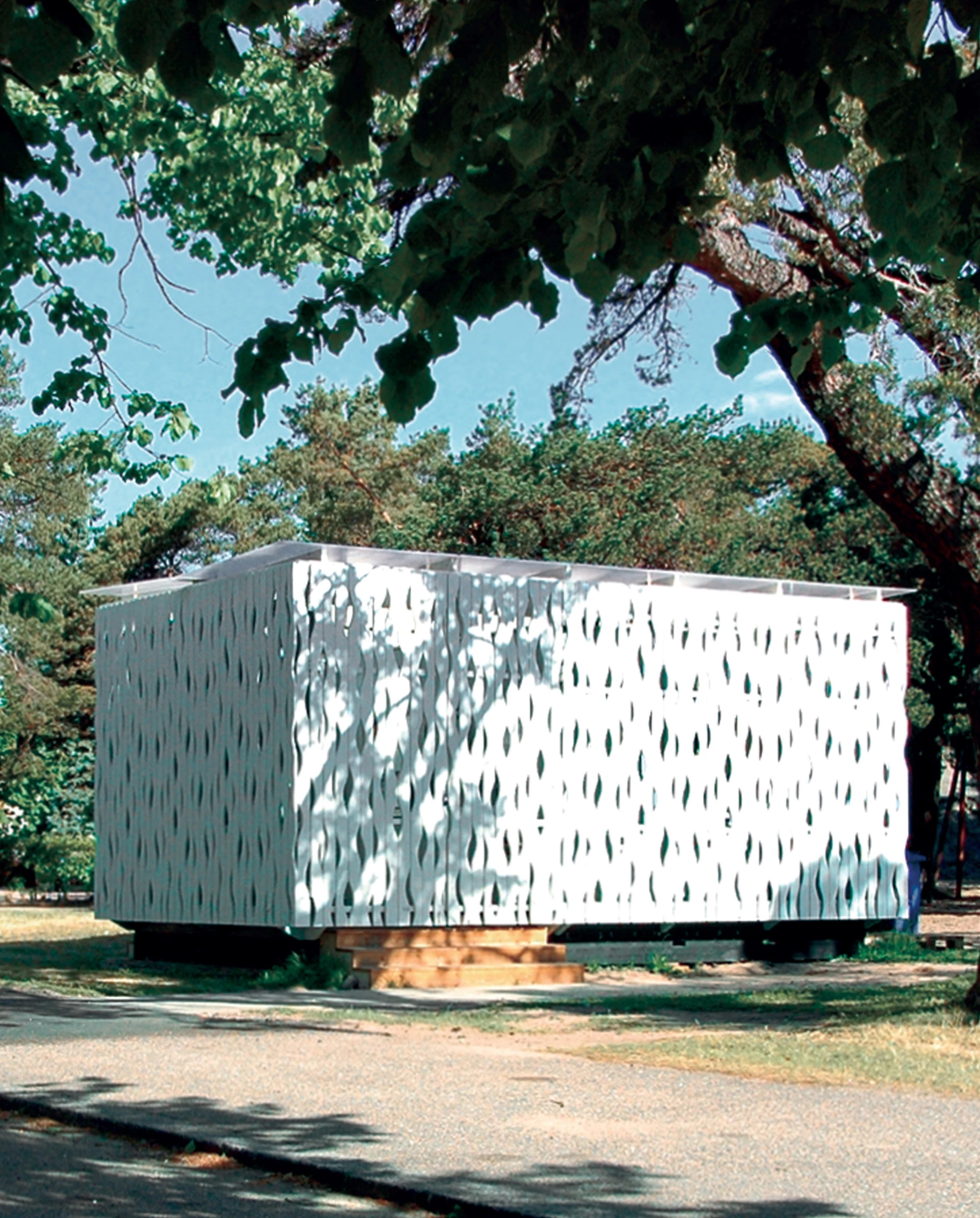 Tres patrones de lamas combinadas entre sí, que se inspiran en los diseños de las típicas barandillas de madera pintada de las viviendas de la población, generan los motivos orgánicos usados en el cerramiento del quiosco.