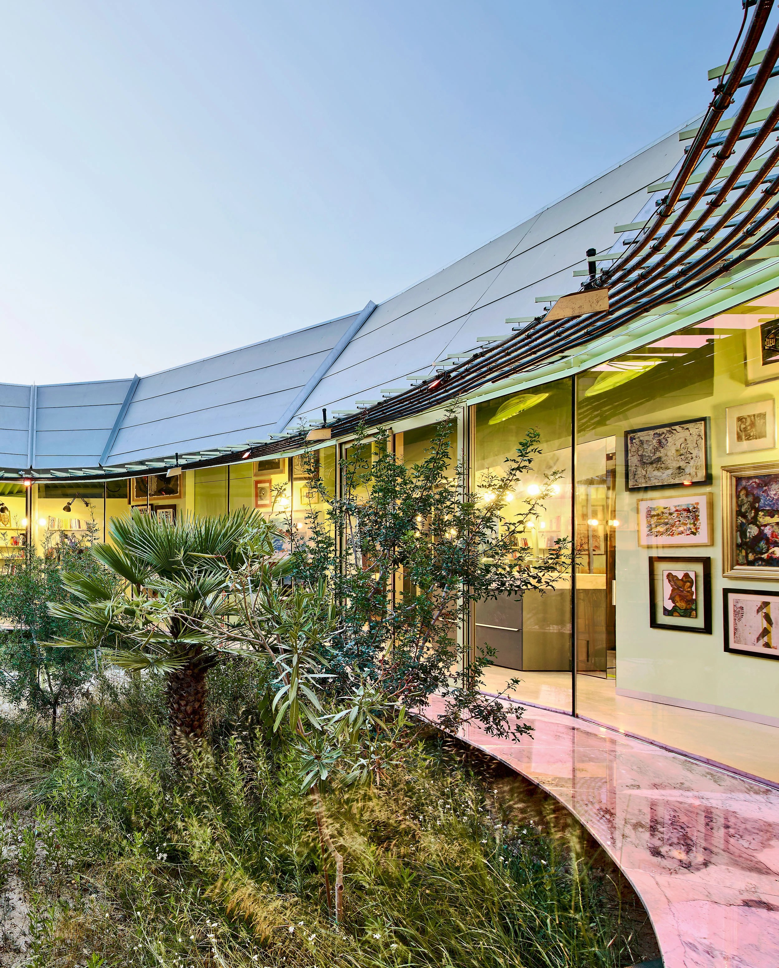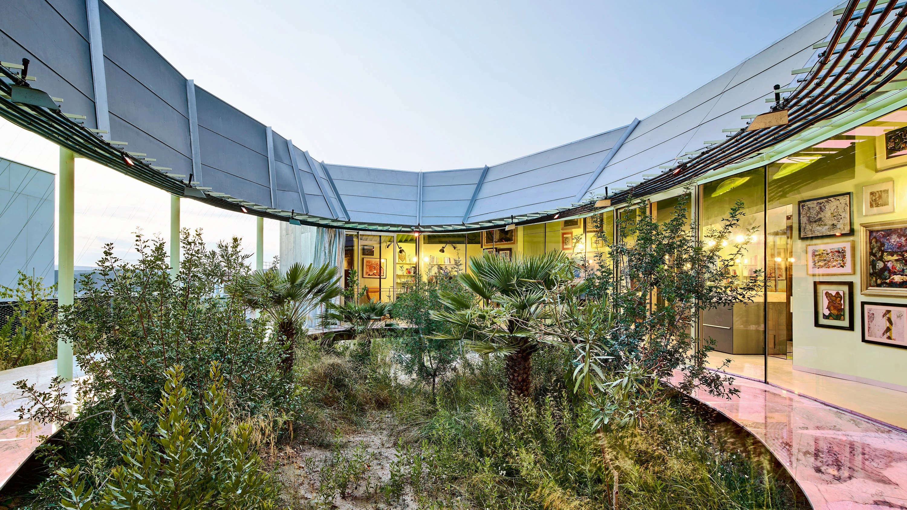 Las cubiertas recogen agua de lluvia que se acumula junto a las aguas grises, y que se utiliza para regenerar el regimen climático de un fragmento de rambla que ha sobrevivido. Por medio de sensores de humedad y conductividad se activa una meteorología automatizada que proporciona las condiciones necesarias para la reparación biológica de la rambla. La casa se dispone alrededor de la elipse que contiene este fragmento, como un observatorio en alianza con la reconstrucción del paisaje, y tipológicamente organizada como un anillo de espacios continuos de ancho variable. Después de un año de la entrada en funcionamiento de este sistema de reparación hidrotérmica han aparecido signos claros de recuperación. Laureles, lentiscos, mirtos, baladres, myrica fayas, vincas y palmitos crecen en la sección elíptica, e insectos, reptiles, pájaros y lagomorfos la recorren.