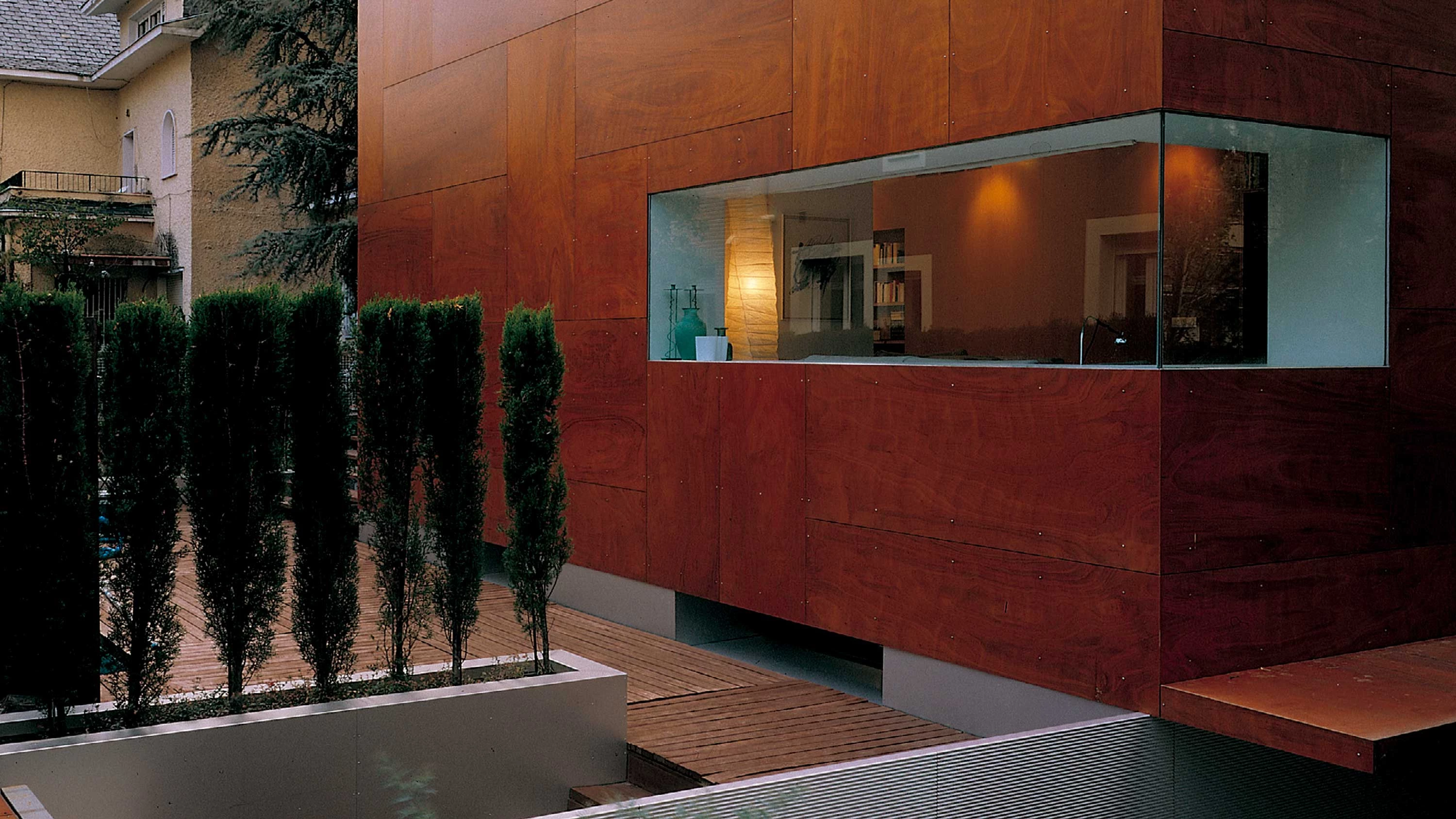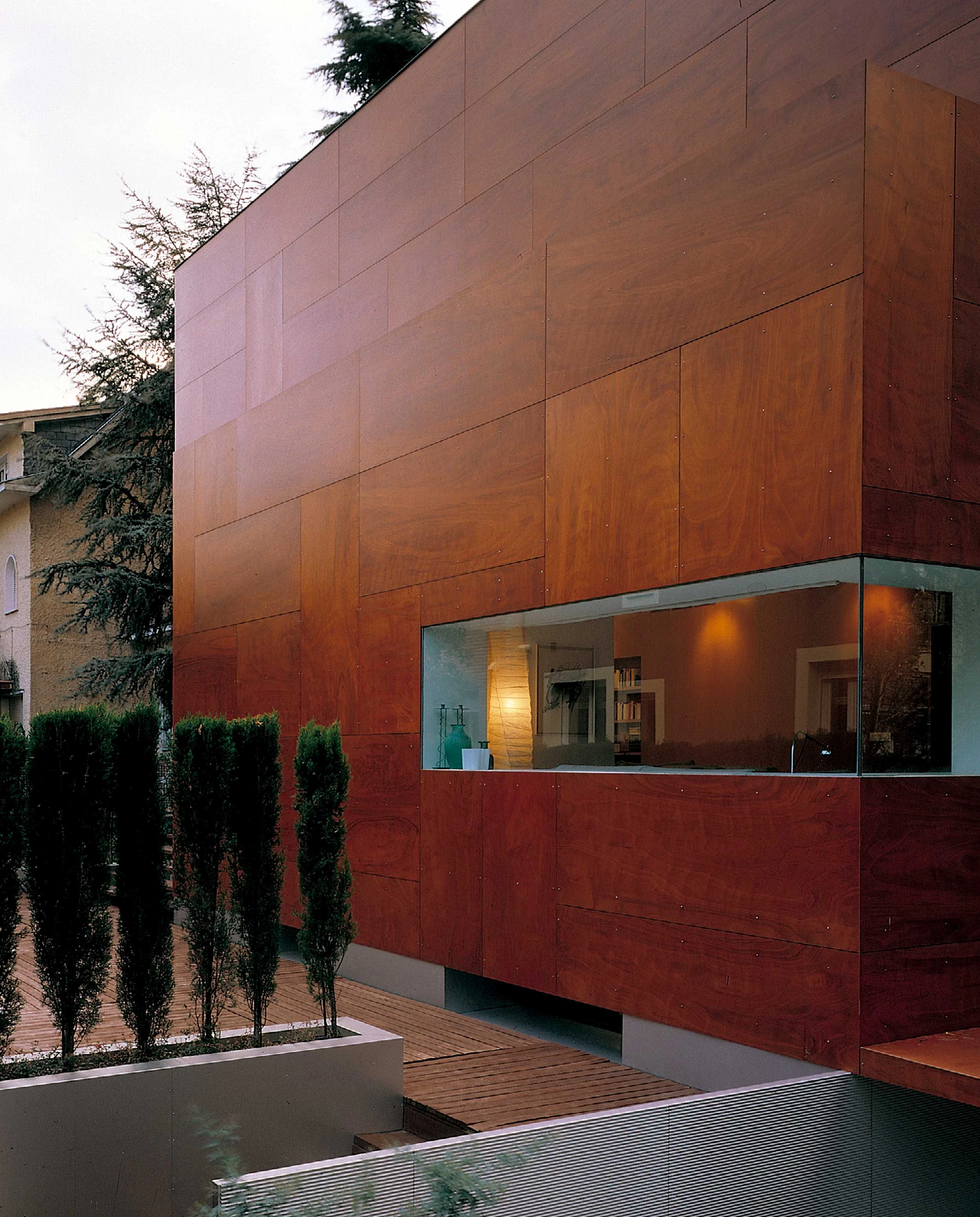 El envoltorio está constituido por una piel de tableros de madera baquelizada de alta densidad. Esta piel queda separada de los muros existentes por una cámara de aire, y fijada a los mismos mediante rastreles de aluminio, lo que permite que funcione como fachada ventilada. La planta baja queda cubierta de modo similar, si bien con paneles de aluminio ondulado. La cubierta a cuatro aguas se reviste de cobre, estableciendo de este modo una continuidad con el color de las nuevas fachadas. En el interior se concentran en un único mueble central —verdadera espina dorsal de la casa—el máximo de elementos servidores de los espacios principales: armarios, biblioteca, aparatos electrónicos, conductos de instalaciones, etcétera, liberando de este modo las plantas. ‘Envolver’ y ‘concentrar’ son dos sencillas operaciones que responden aquí a un problema específico, pero también sugieren posibles soluciones a cuestiones más genéricas que afectan tanto a los conceptos de la vivienda como a los hábitos de la vida doméstica...[+]