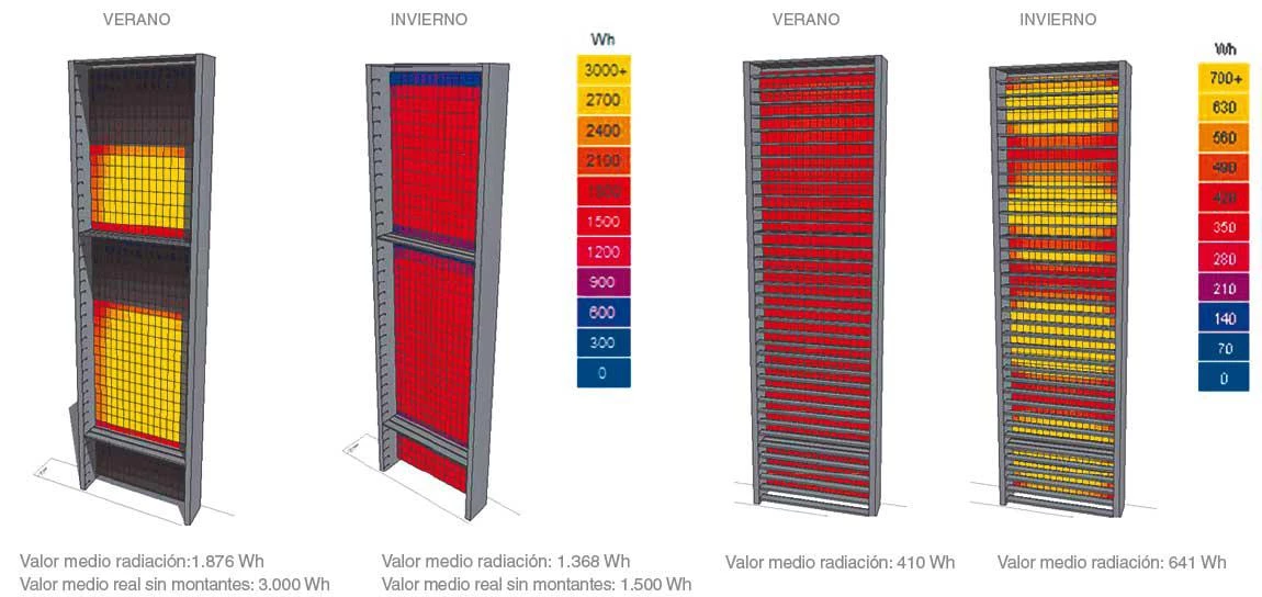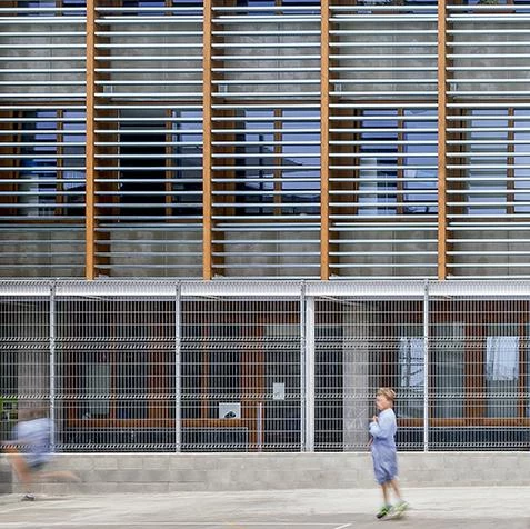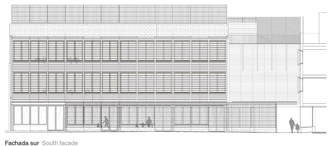 En la fachada sur, un sistema pasivo de lamas fijas de chapa perforada regula la incidencia solar —entra sólo el 20% de radiación anual concentrada en los meses más fríos— y permite una buena ventilación de las aulas. Las lamas, resistentes a los pelotazos, se apoyan a grandes montantes de madera laminada de pino Douglas, generando una composición de orden vertical que contrasta con los horizontales que dominan en las otras fachadas al patio.