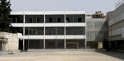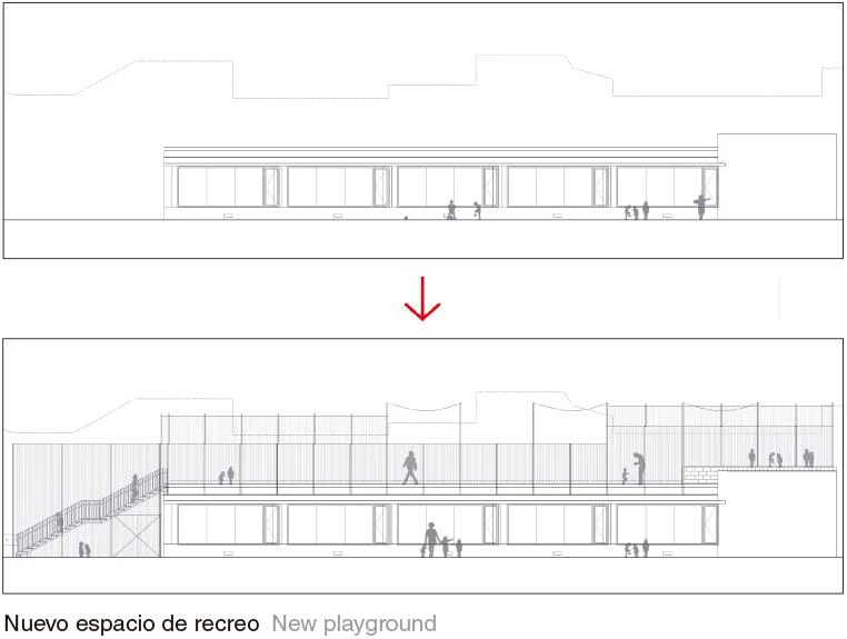 Una azotea inaccesible se convierte en un nuevo espacio exterior de recreo —con magníficas vistas a la ciudad—, reforzándose el forjado y añadiendo un nuevo tramo a la escalera existente, que se preserva en las plantas inferiores. Otro patio para los más pequeños se gana sustituyendo 250 m² de vidrio de la claraboya sobre la escalinata de acceso al polideportivo soterrado por un nuevo forjado colaborante apoyado en las vigas preexistentes; y se aprovecha el techo de hormigón de la zona del ascensor (40 m²) para hacer una piscina de arena y una grada.