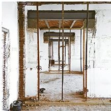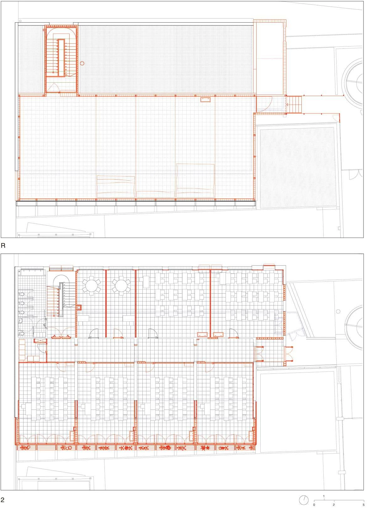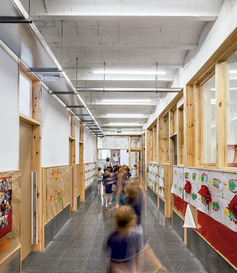 La intervención más costosa, no prevista en las bases del concurso y que llevó a ganarlo, es la ampliación de las aulas de la crujía que da la calle. Pero se amplía por la otra fachada, la del interior de manzana —no se podía crecer hacia la calle—, pasando de 15,5 m de profundidad edificada a 18,5. En planta baja se amplían las aulas infantiles que dan al patio, de 35 a 50 m², manteniendo el pasillo en el lugar original. Por el contrario, en las plantas piso se amplían las que dan a la calle, desplazando el pasillo al otro lado de la pared de carga central, propiciando una de las acciones más contundentes y singulares: la obertura del nuevo pasillo atravesando los muros de 30 cm que separaban originalmente las aulas. Para la ampliación se añade una estructura (parásita) metálica, apoyada en los pilares de acero de la fachada preexistente —de una primera ampliación de 1970— y en los nuevos pilares al límite del patio, que aprovechan un muro de contención soterrado cómo cimiento.
